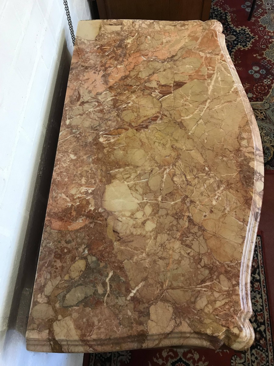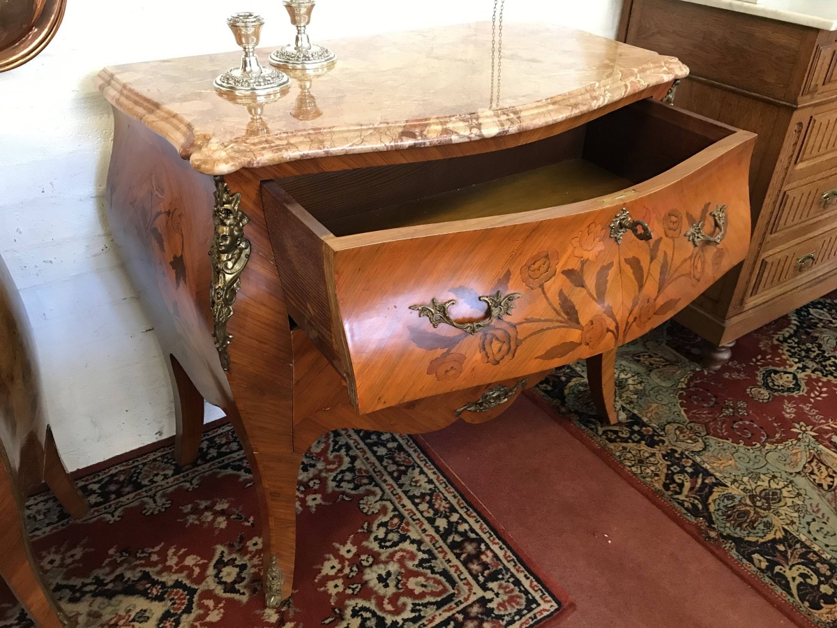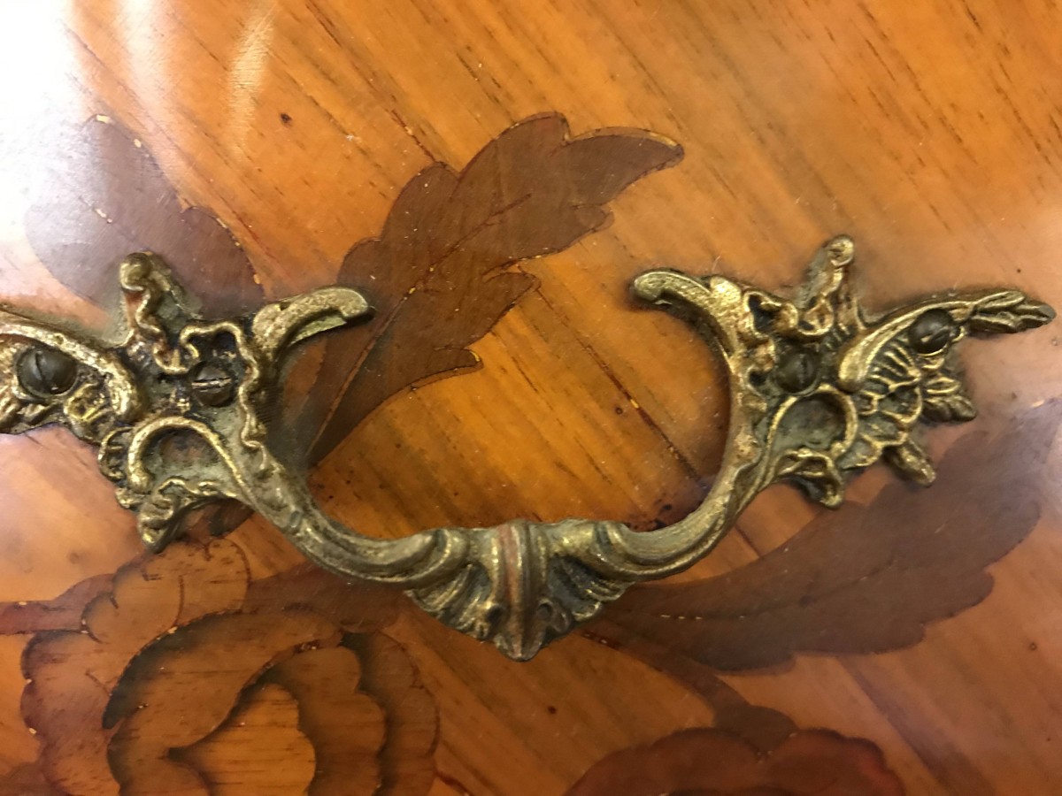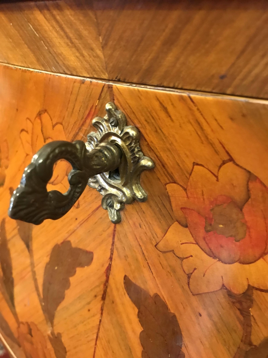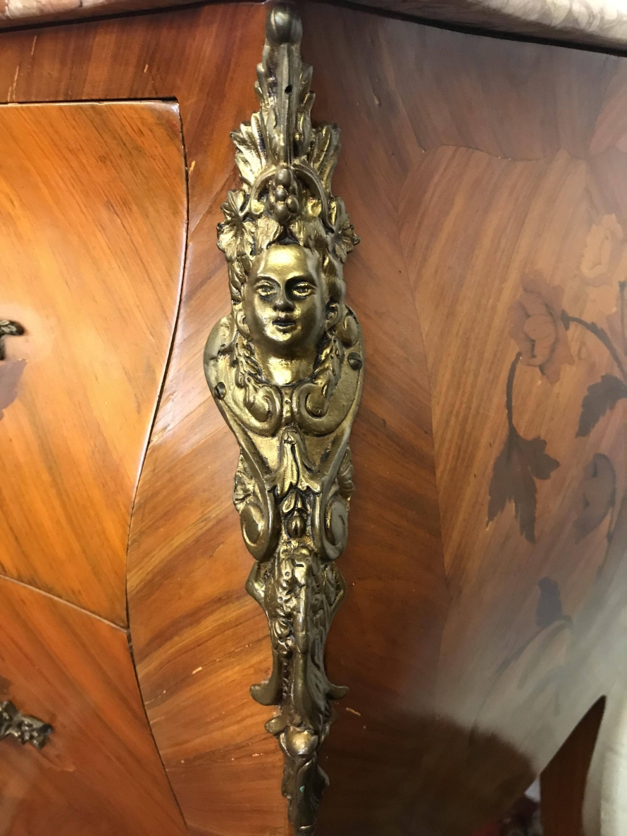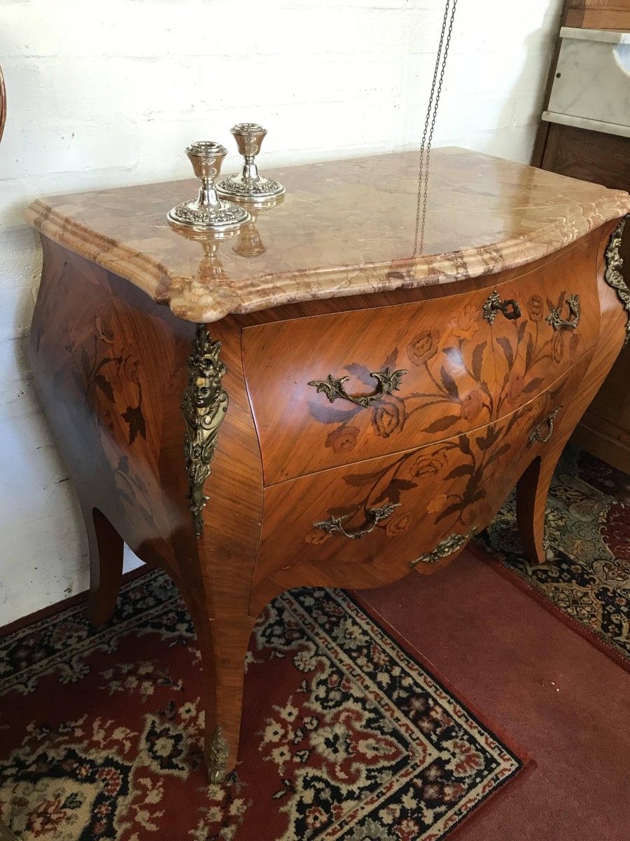 The chest has a beautiful shaped marble top, the marble can be removed. Below are two shaped drawers, each drawer has a pair of brass handles and floral inlay decoration. The top drawer has a brass key and escutcheon and the bottom drawer has a central brass decorative mount. To the sides are a pair of brass decorated mounts. The shaped sides also have floral inlay decoration. This beautiful chest of drawers sits on four shaped legs, the front two legs having brass decoration to the front. A beautiful stylish item of furniture.