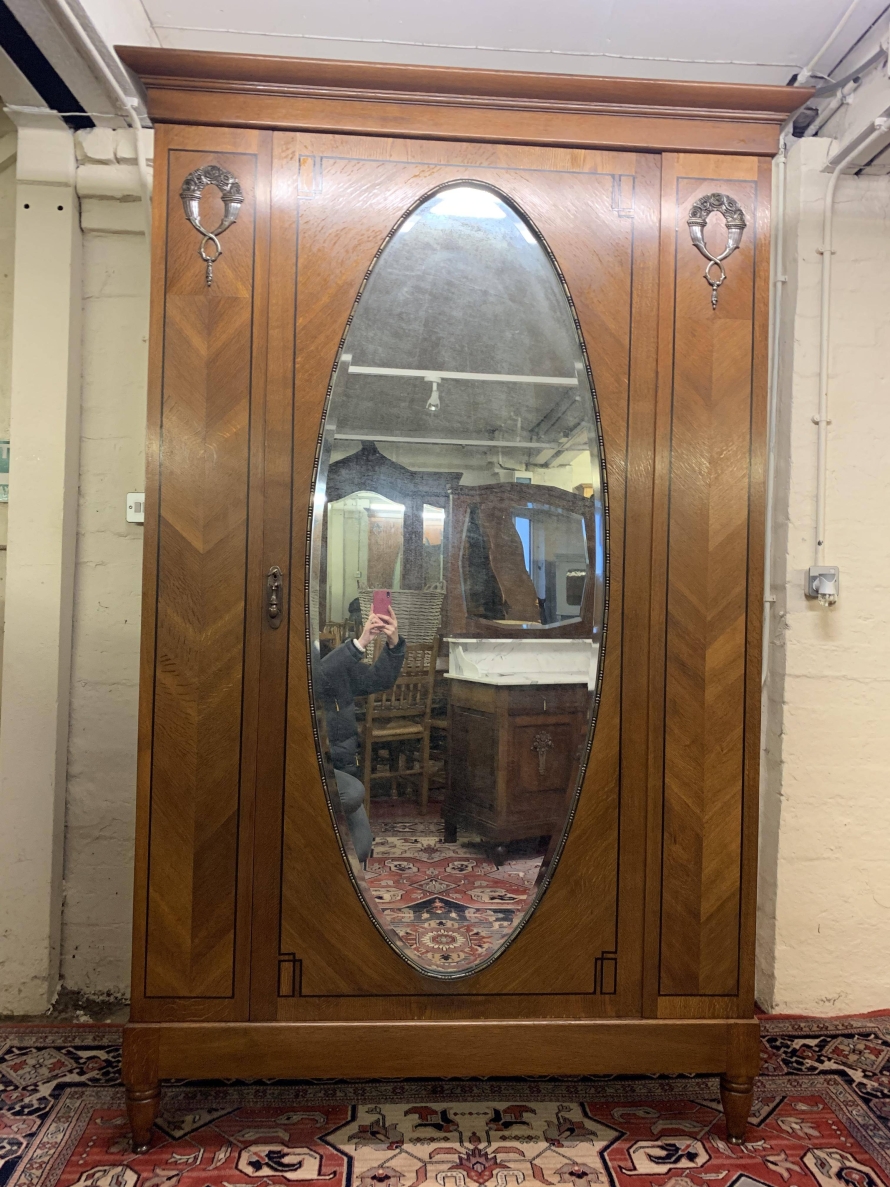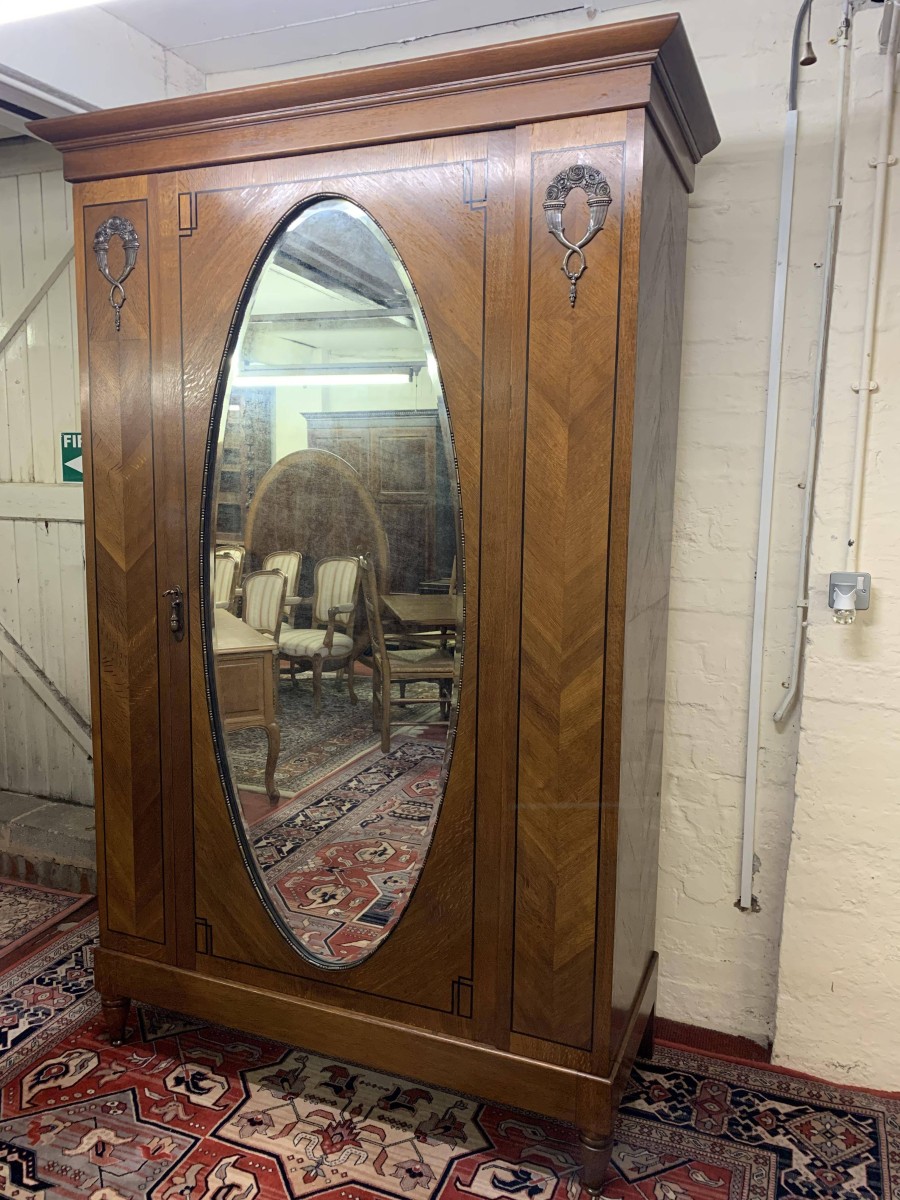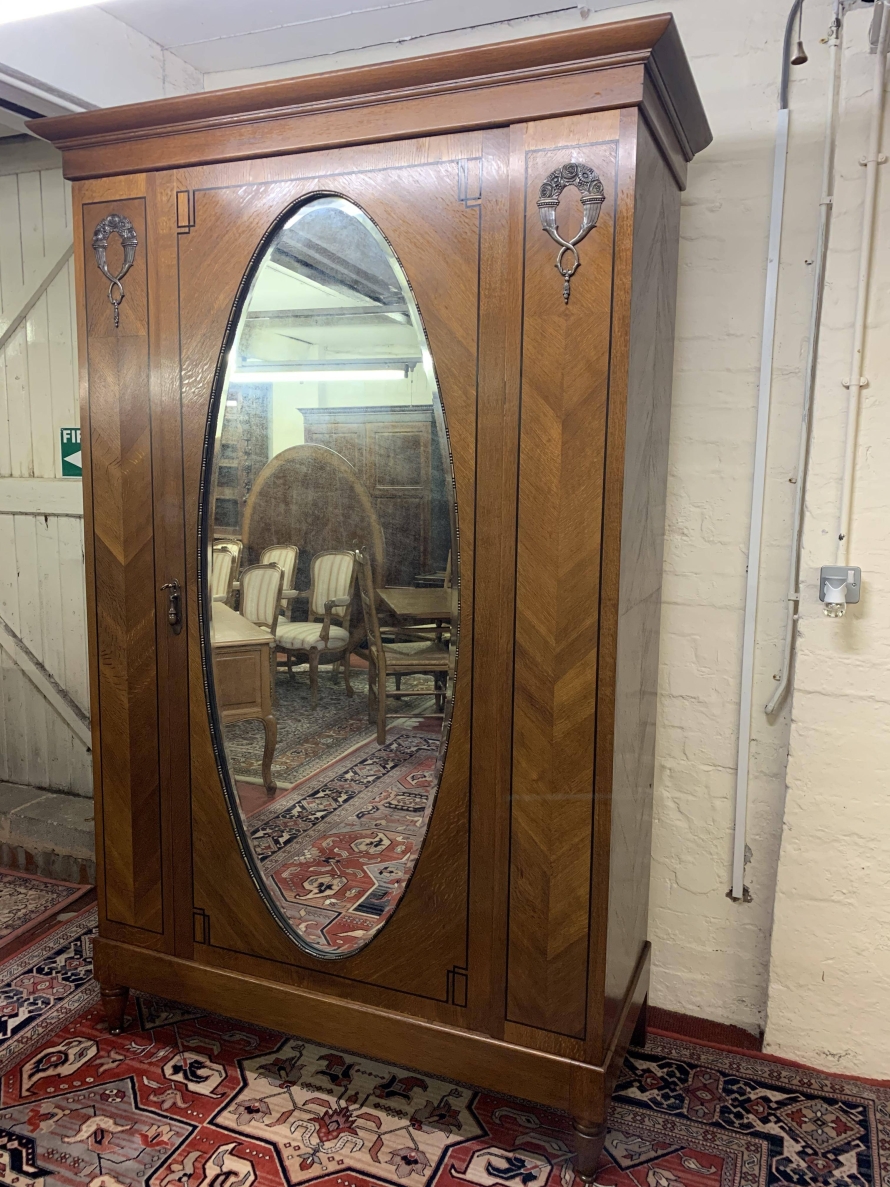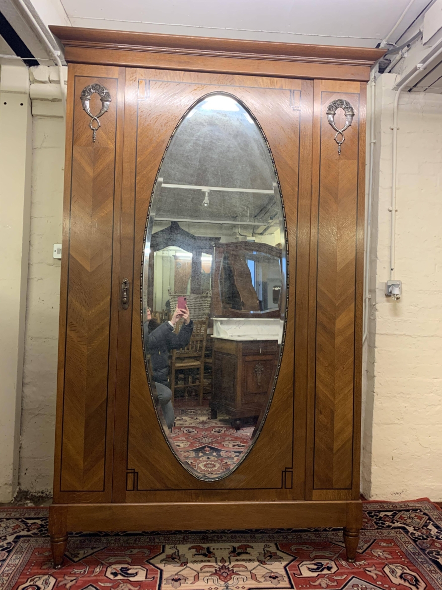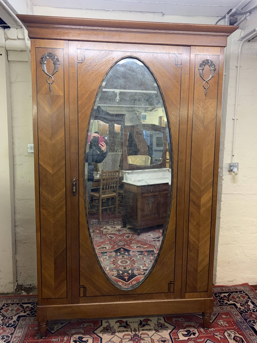 The shaped cornice sits above an impressive oval bevelled mirror door. To the sides are decorative brass plaques. There is ebony string decoration throughout. The door opens to reveal a removable shelf above a brass hanging rail, to the left-hand side are three removable shelves. The armoire stands proud on two turned legs to the front. The armoire is made in glorious top quality oak.