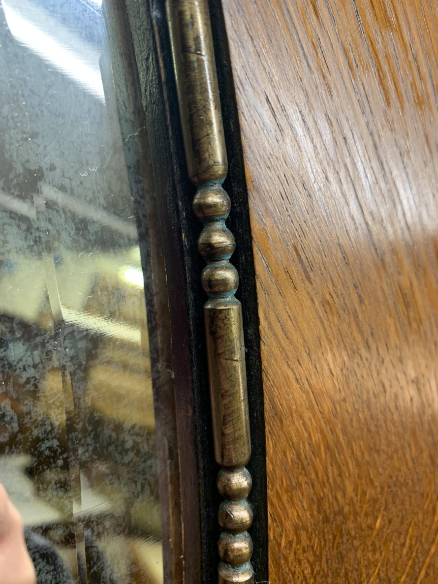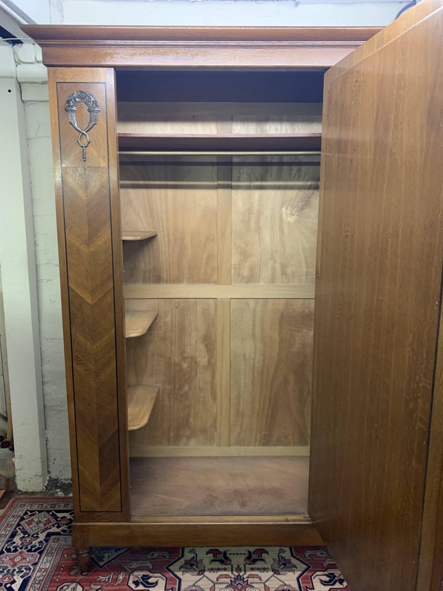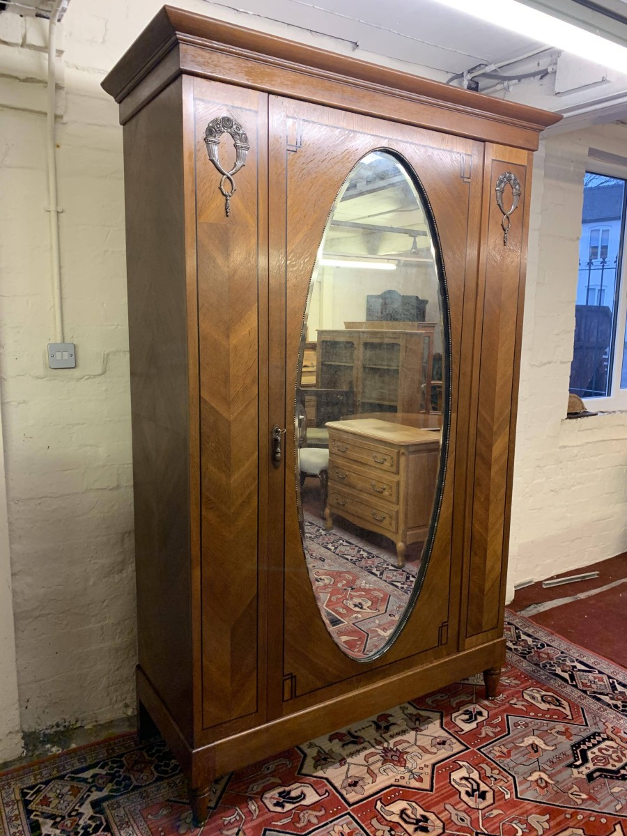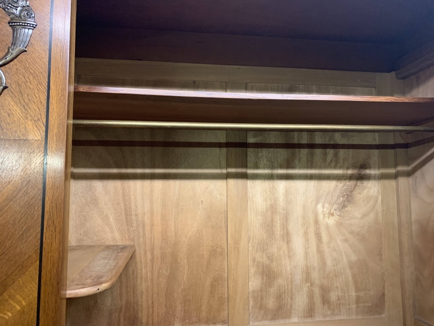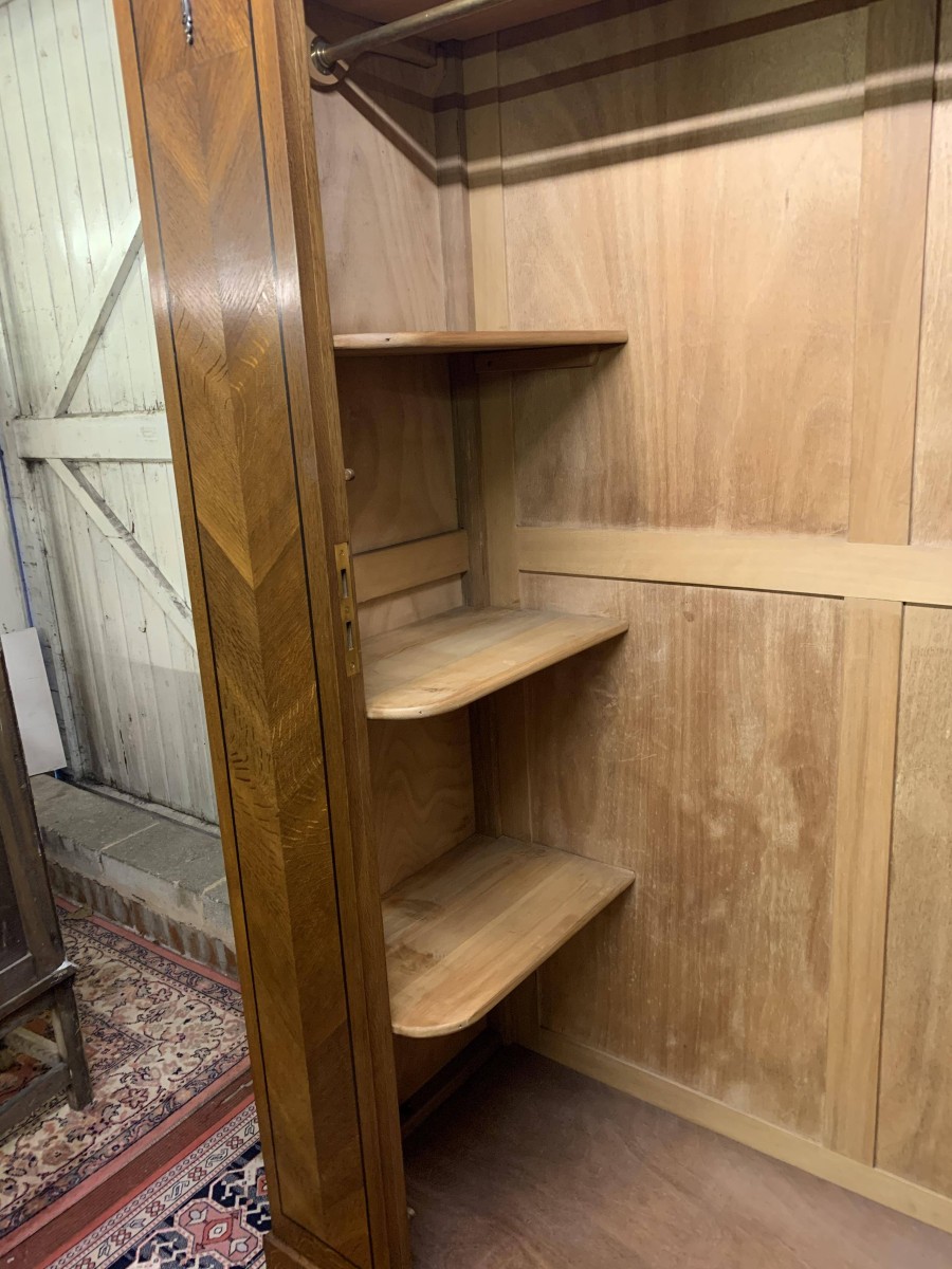 The shaped cornice sits above an impressive oval bevelled mirror door. To the sides are decorative brass plaques. There is ebony string decoration throughout. The door opens to reveal a removable shelf above a brass hanging rail, to the left-hand side are three removable shelves. The armoire stands proud on two turned legs to the front. The armoire is made in glorious top quality oak.