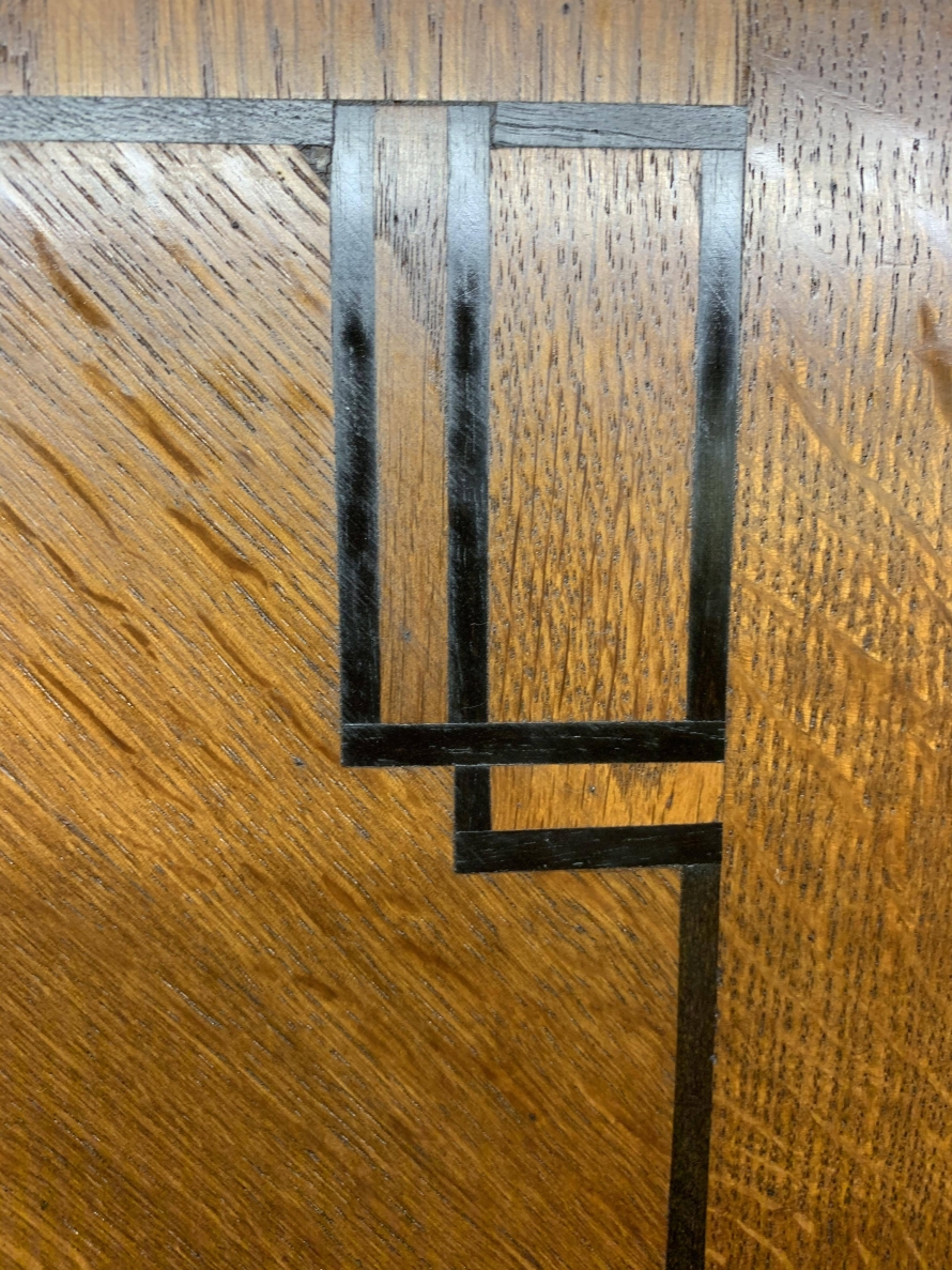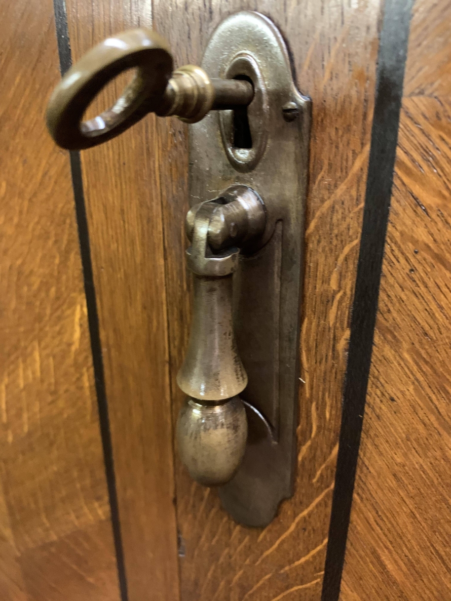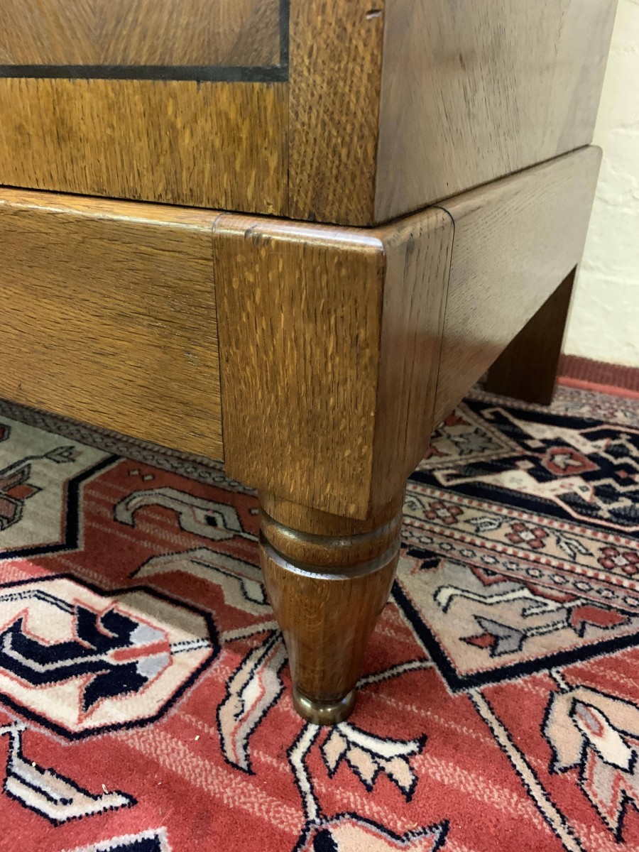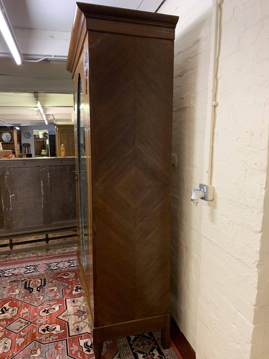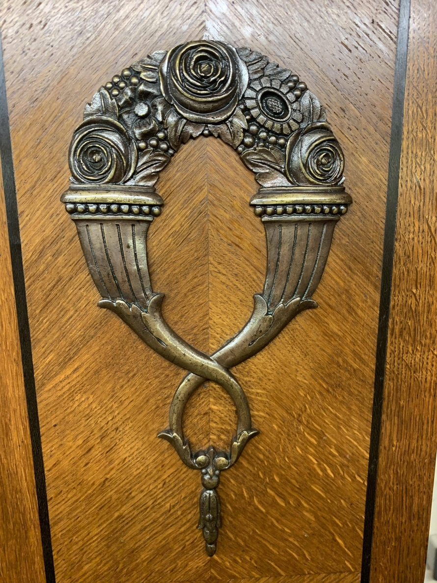 The shaped cornice sits above an impressive oval bevelled mirror door. To the sides are decorative brass plaques. There is ebony string decoration throughout. The door opens to reveal a removable shelf above a brass hanging rail, to the left-hand side are three removable shelves. The armoire stands proud on two turned legs to the front. The armoire is made in glorious top quality oak.