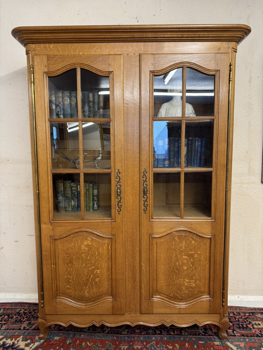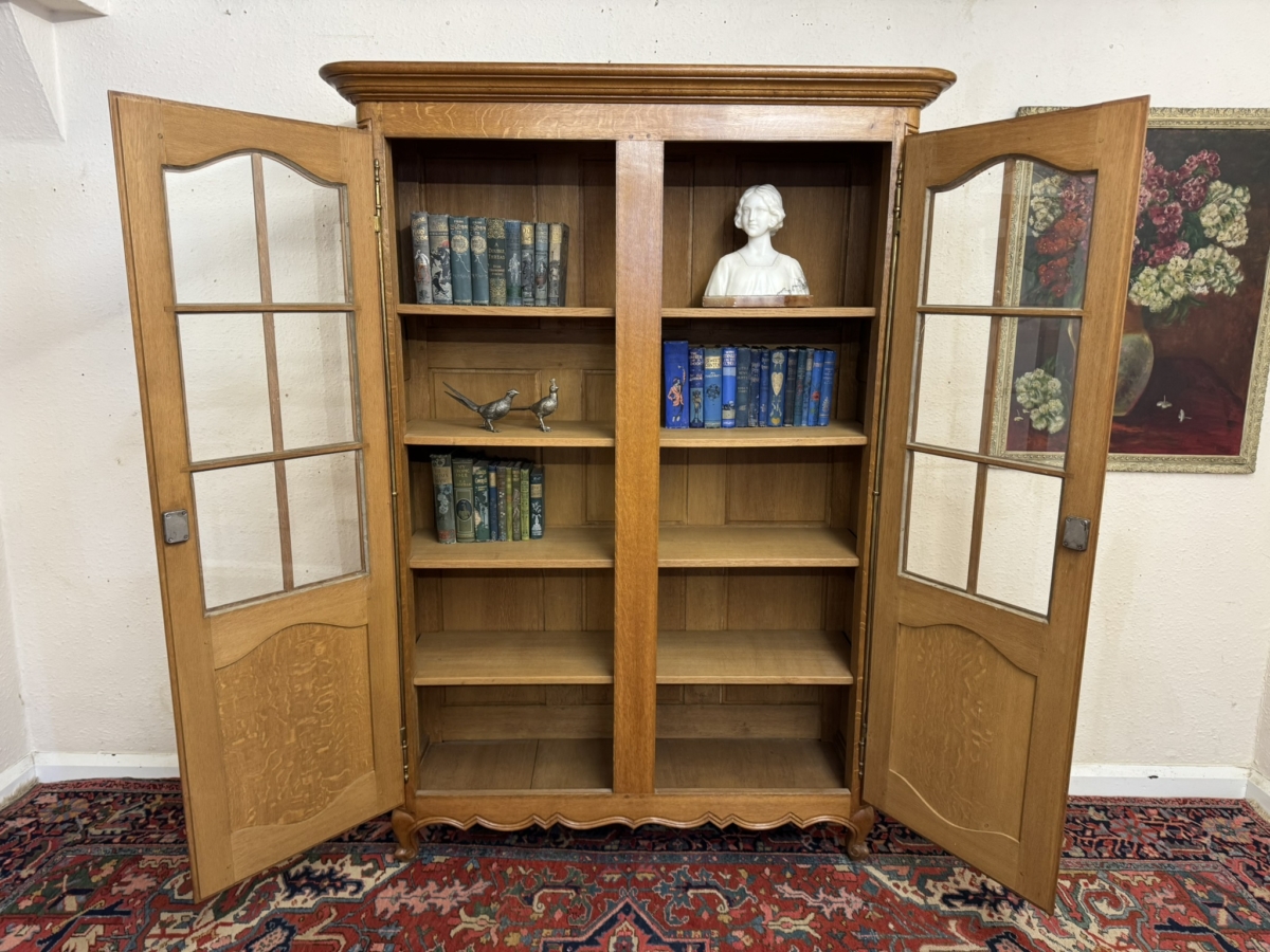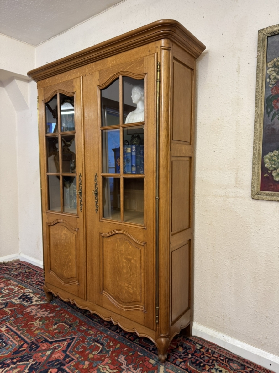 This fabulous French bookcase is in excellent condition. The over sailing top has curved corners, below are a pair of lockable doors, each door is glazed to the top with a shaped recessed panel below. Each door having full length brass hinges, brass escutcheon and key. The doors open to reveal four shelves. Peg jointed throughout, recessed panelled sides, shaped skirt and standing on two carved cabriole shaped legs to the front.