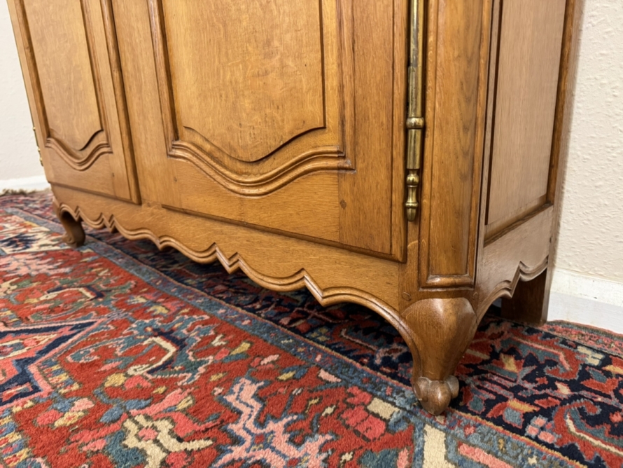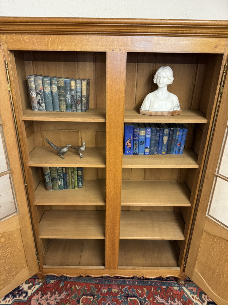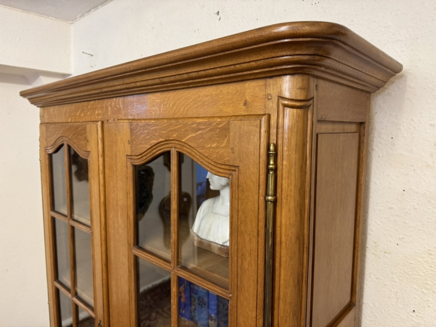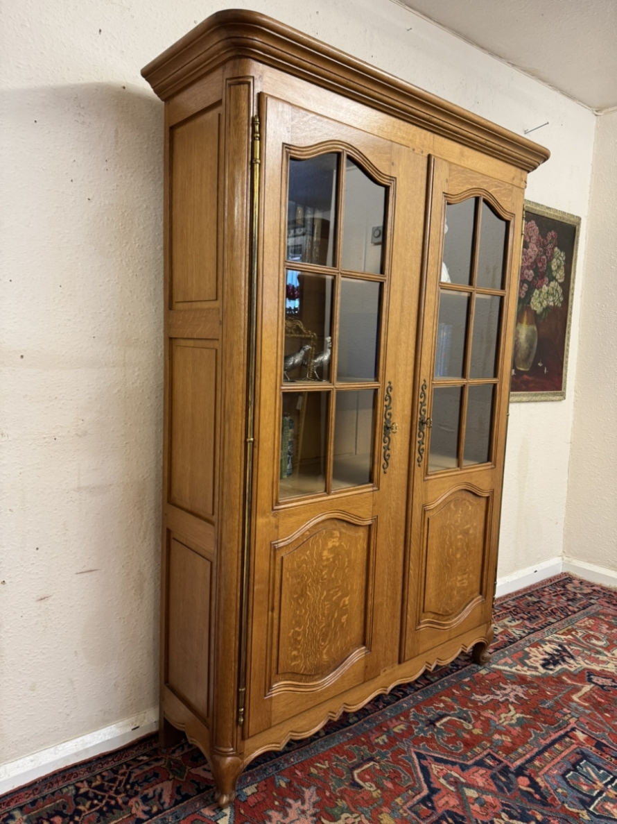 This fabulous French bookcase is in excellent condition. The over sailing top has curved corners, below are a pair of lockable doors, each door is glazed to the top with a shaped recessed panel below. Each door having full length brass hinges, brass escutcheon and key. The doors open to reveal four shelves. Peg jointed throughout, recessed panelled sides, shaped skirt and standing on two carved cabriole shaped legs to the front.