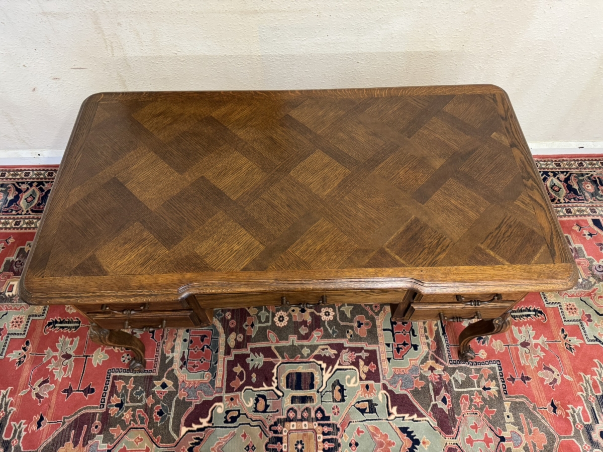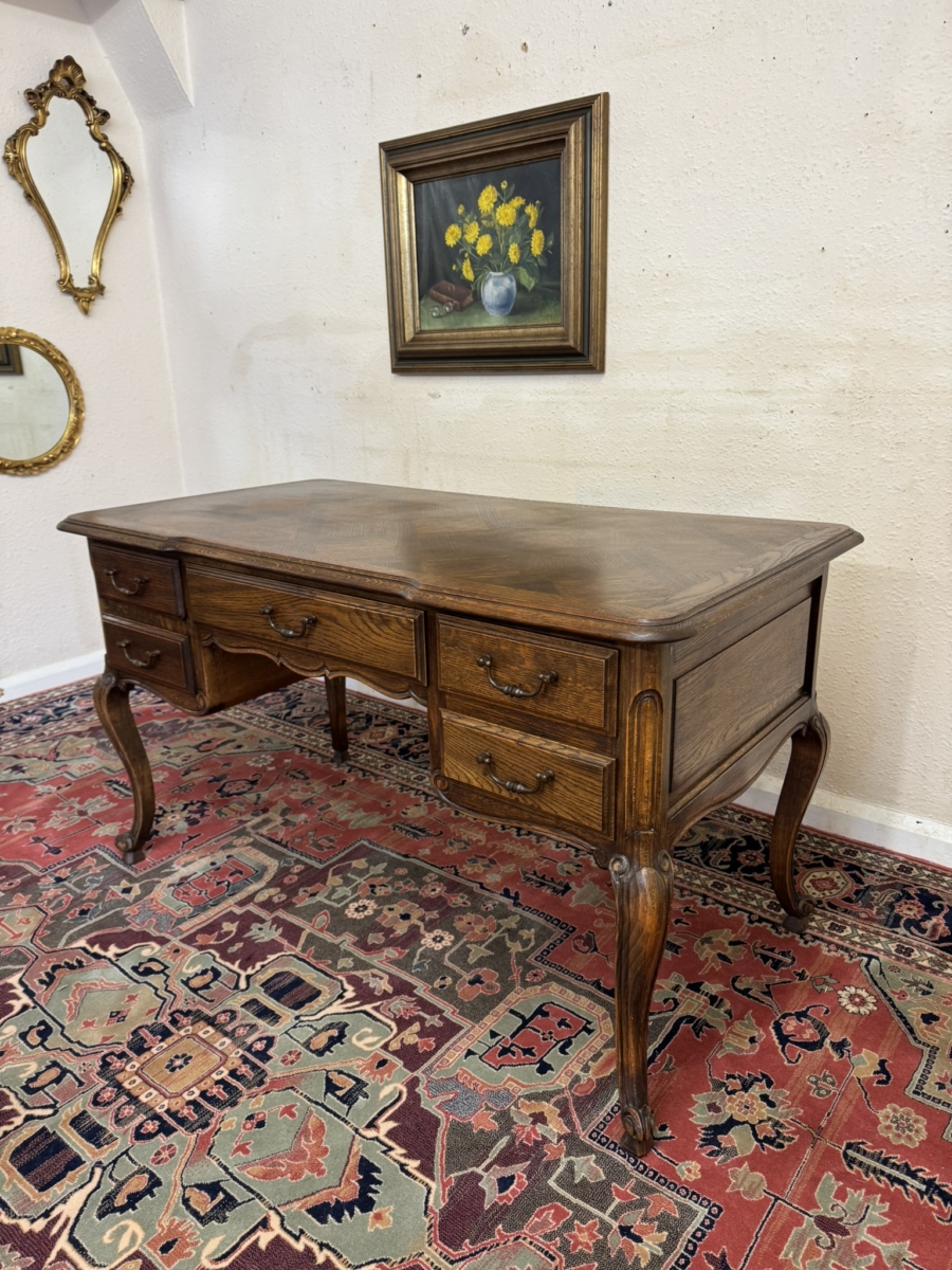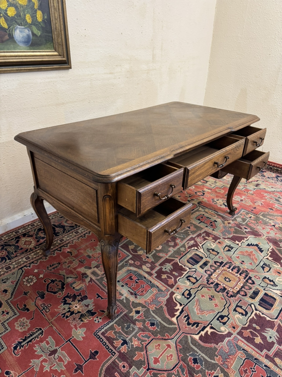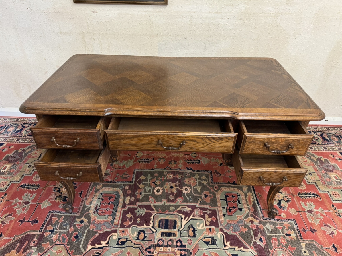This fantastic French desk is in excellent condition. The striking parquetry top sits above a central knee hole drawer which is flanked by a pair of drawers, each of the five drawers have a drop metal handle. Fielded panelled sides and back and standing proud on four carved cabriole shaped legs.