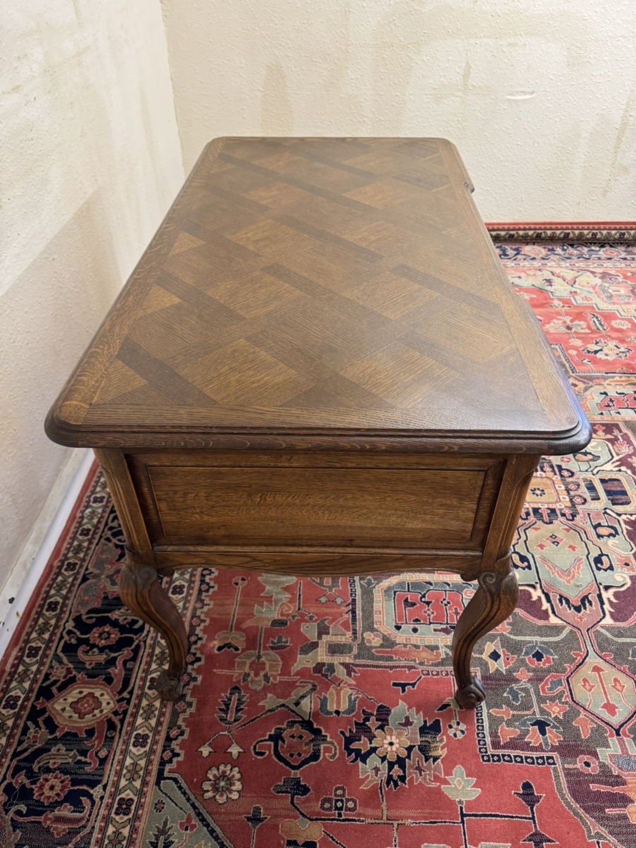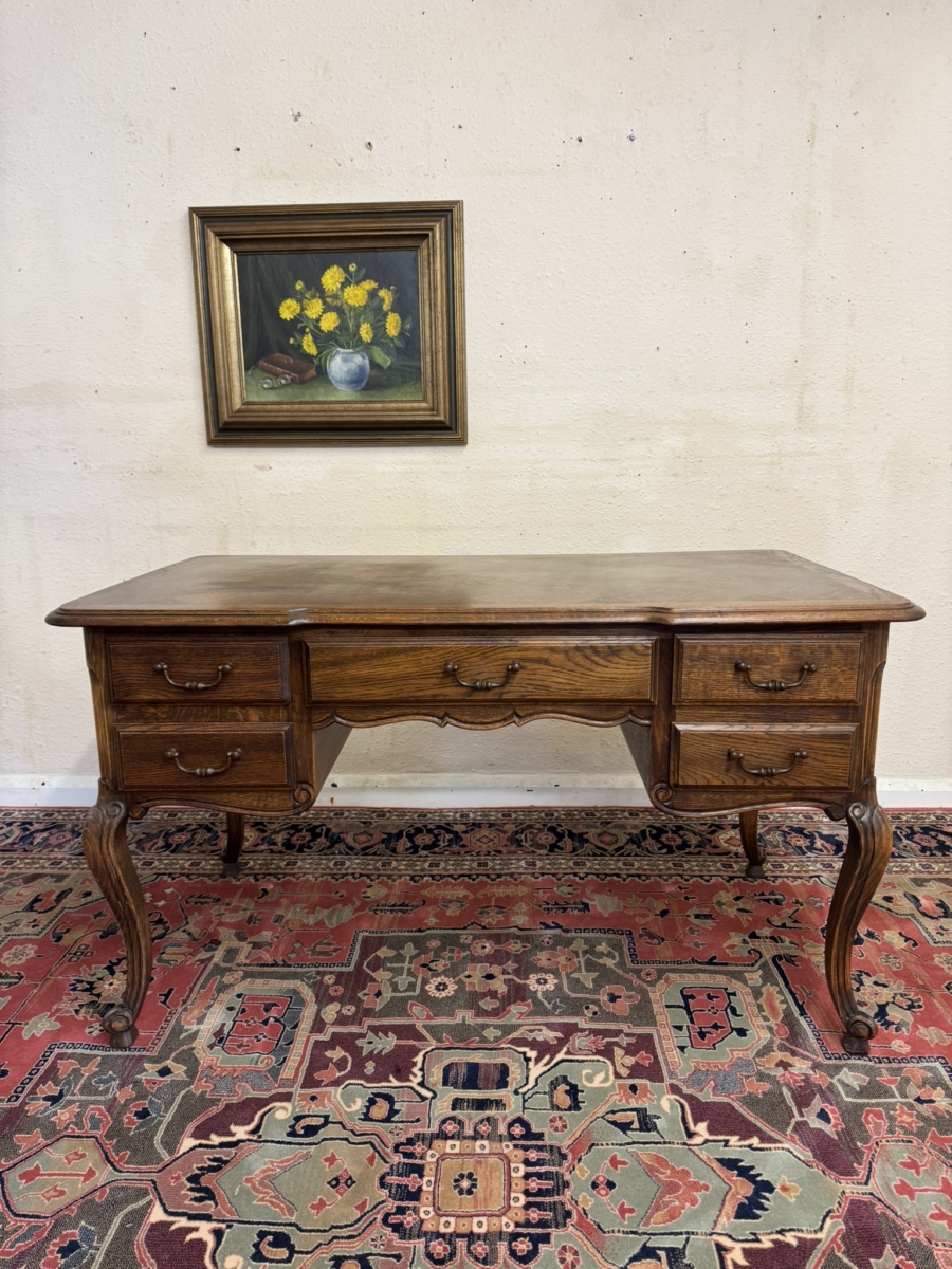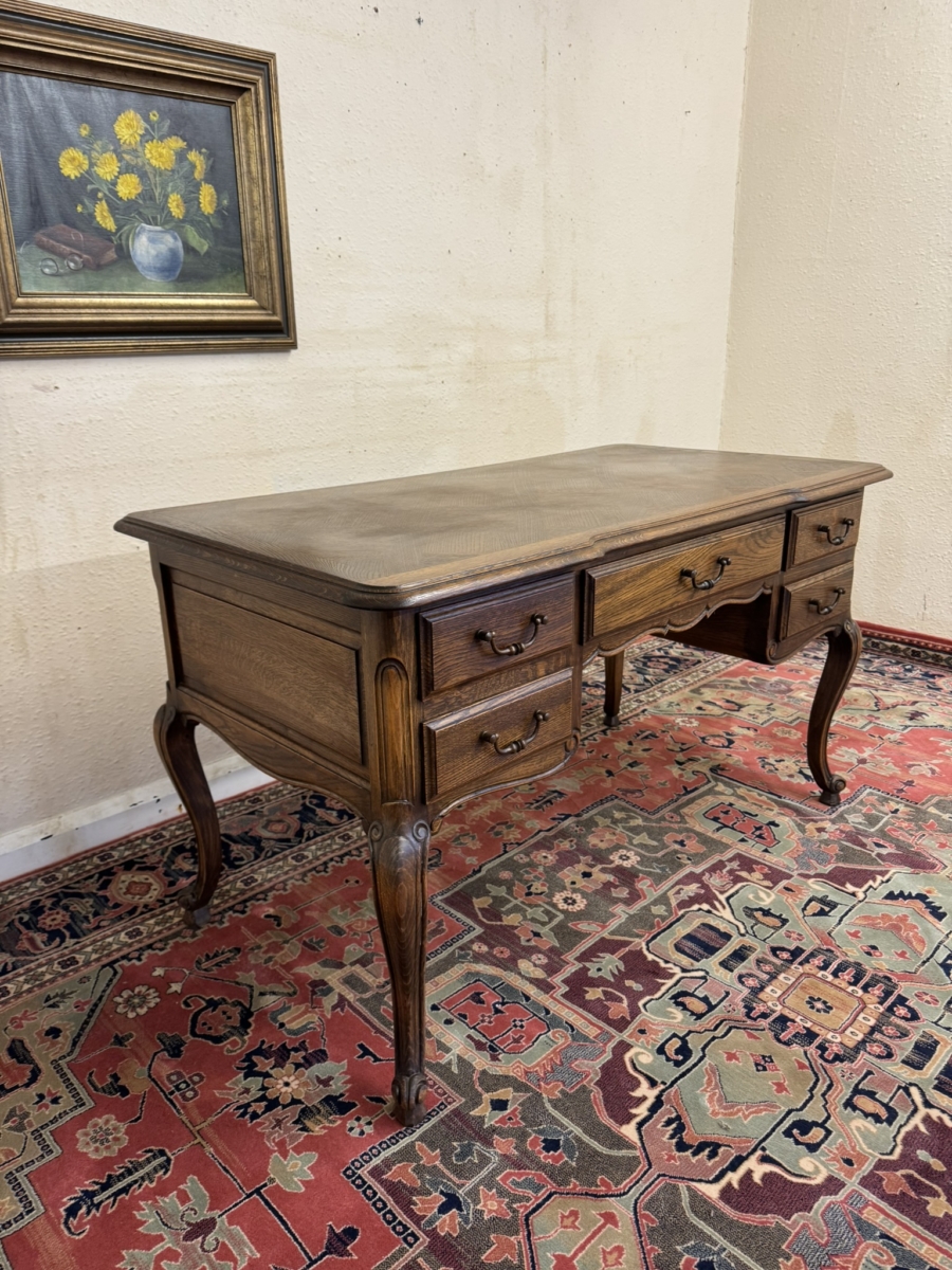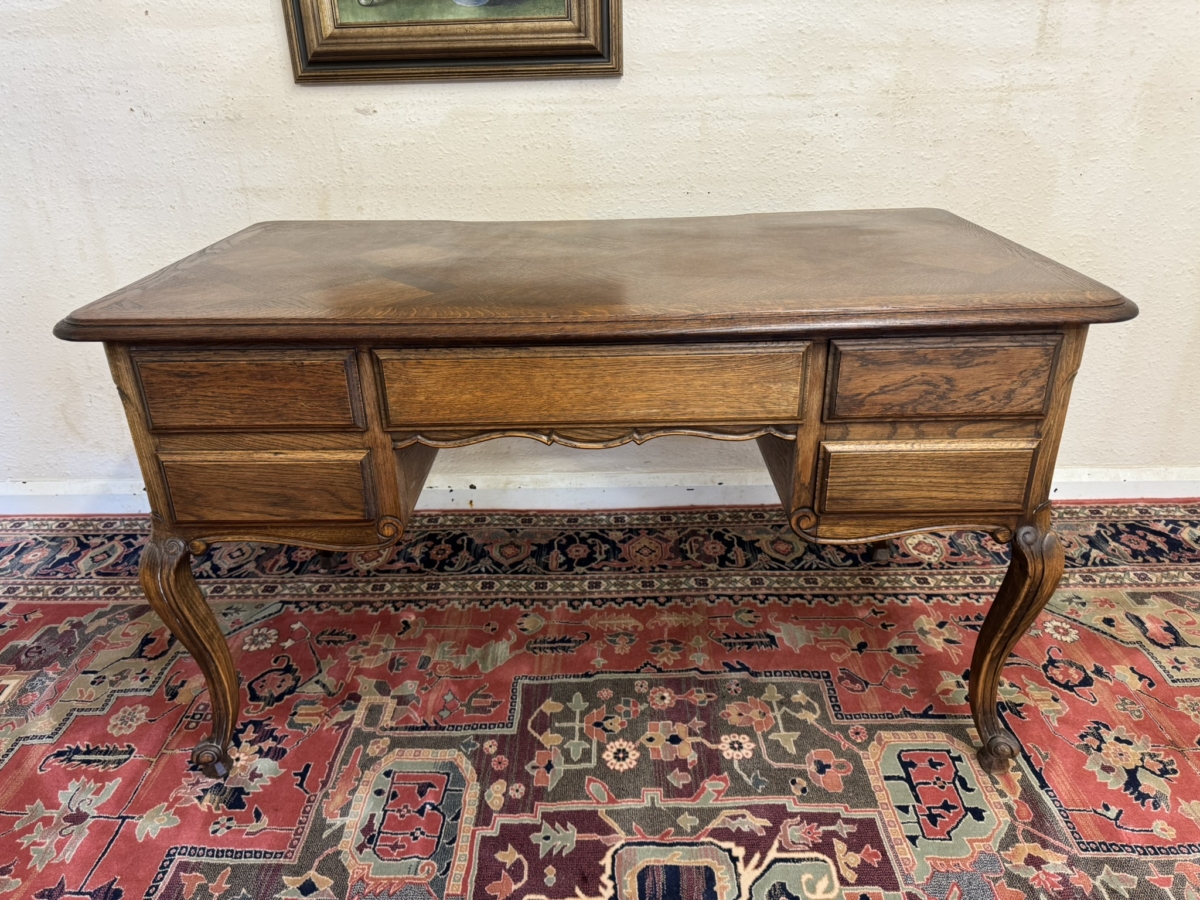 This fantastic French desk is in excellent condition. The striking parquetry top sits above a central knee hole drawer which is flanked by a pair of drawers, each of the five drawers have a drop metal handle. Fielded panelled sides and back and standing proud on four carved cabriole shaped legs.