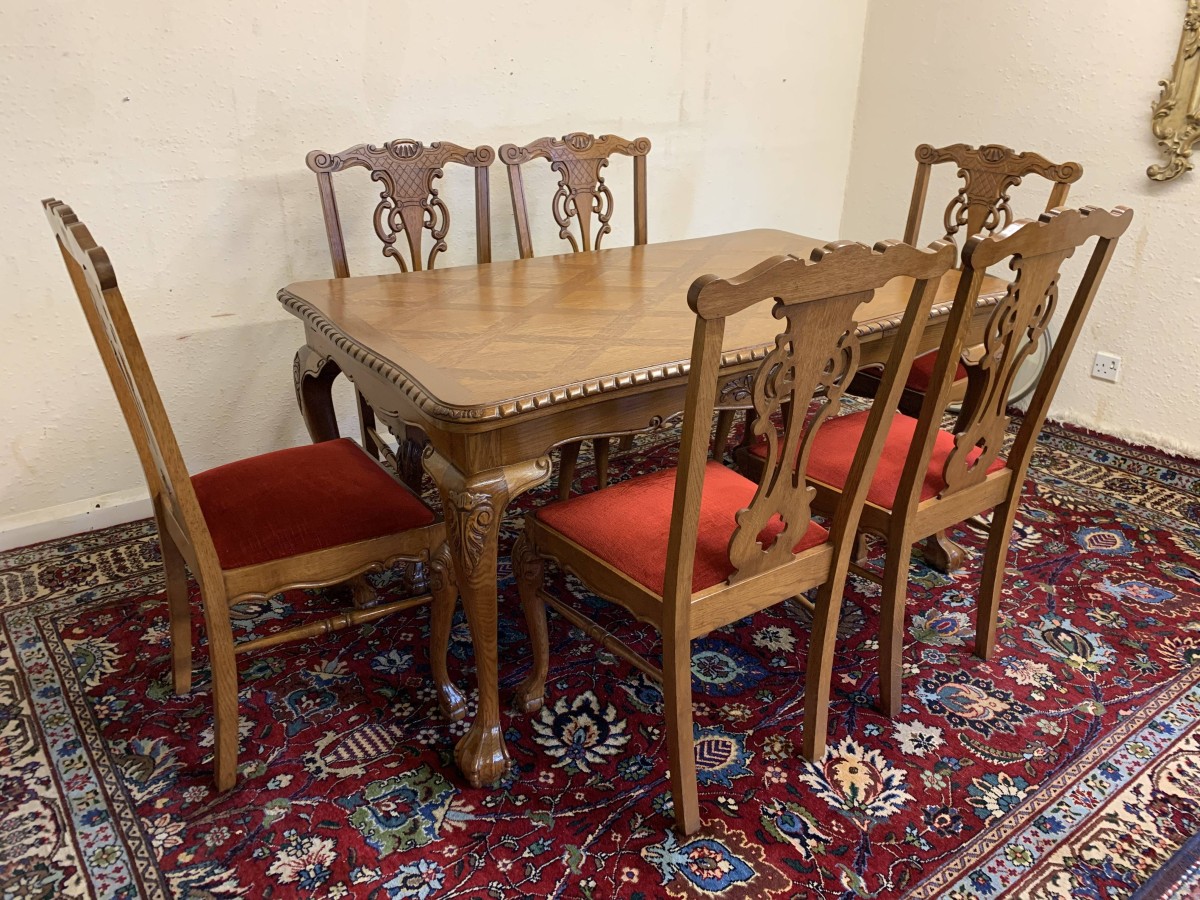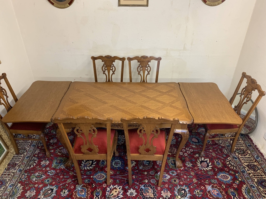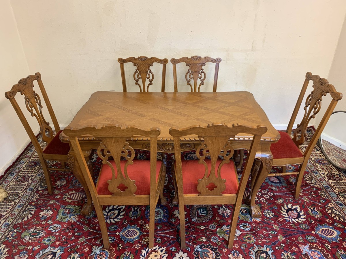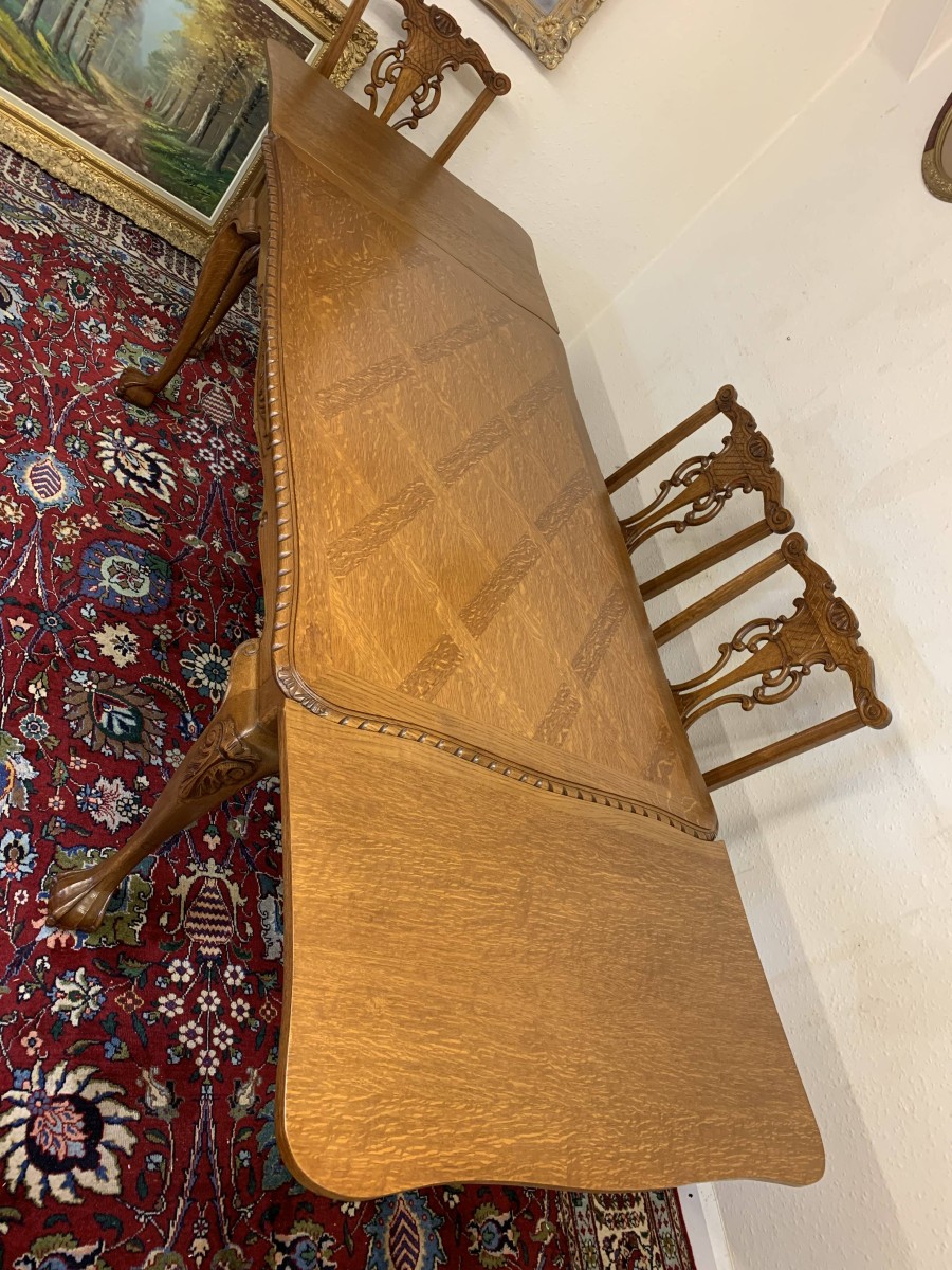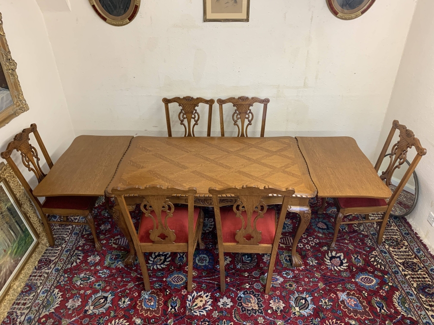 The shaped table top has a parquetry top with carved edging. Shaped sides having ornate carving, standing on four carved cabriole shaped legs on paw feet. The table has two hidden extension leaves which pull out from either end. The six matching chairs which have a shaped carved back, removable cushioned upholstered seat pad two carved cabriole legs with paw feet to the front.
