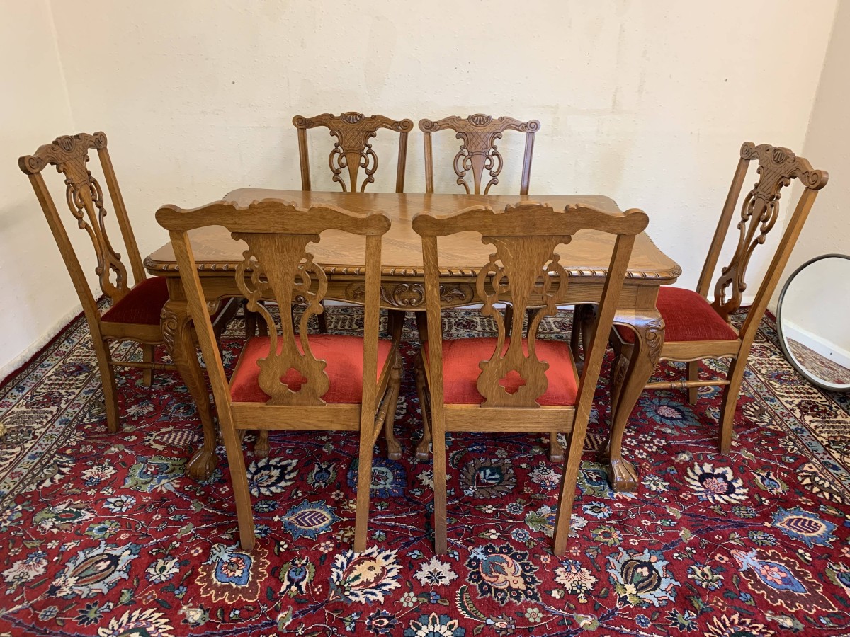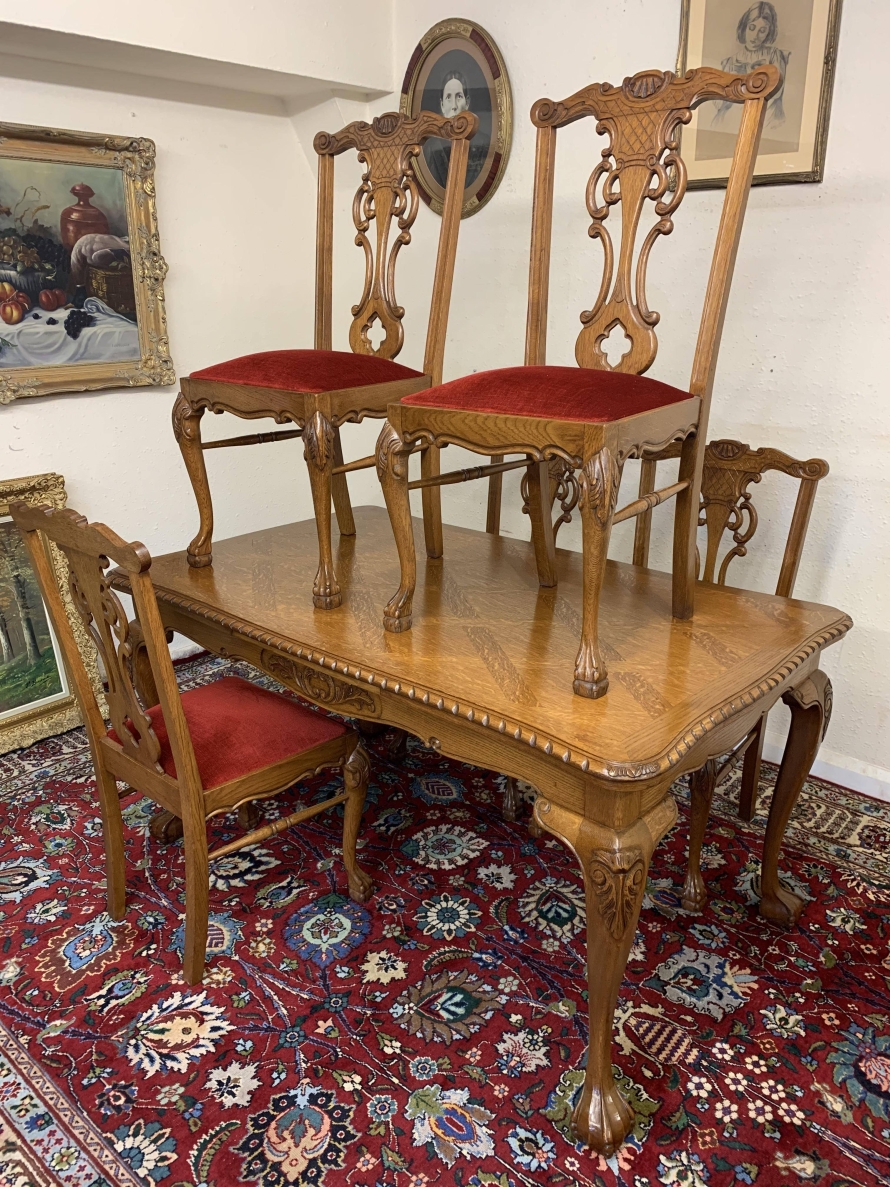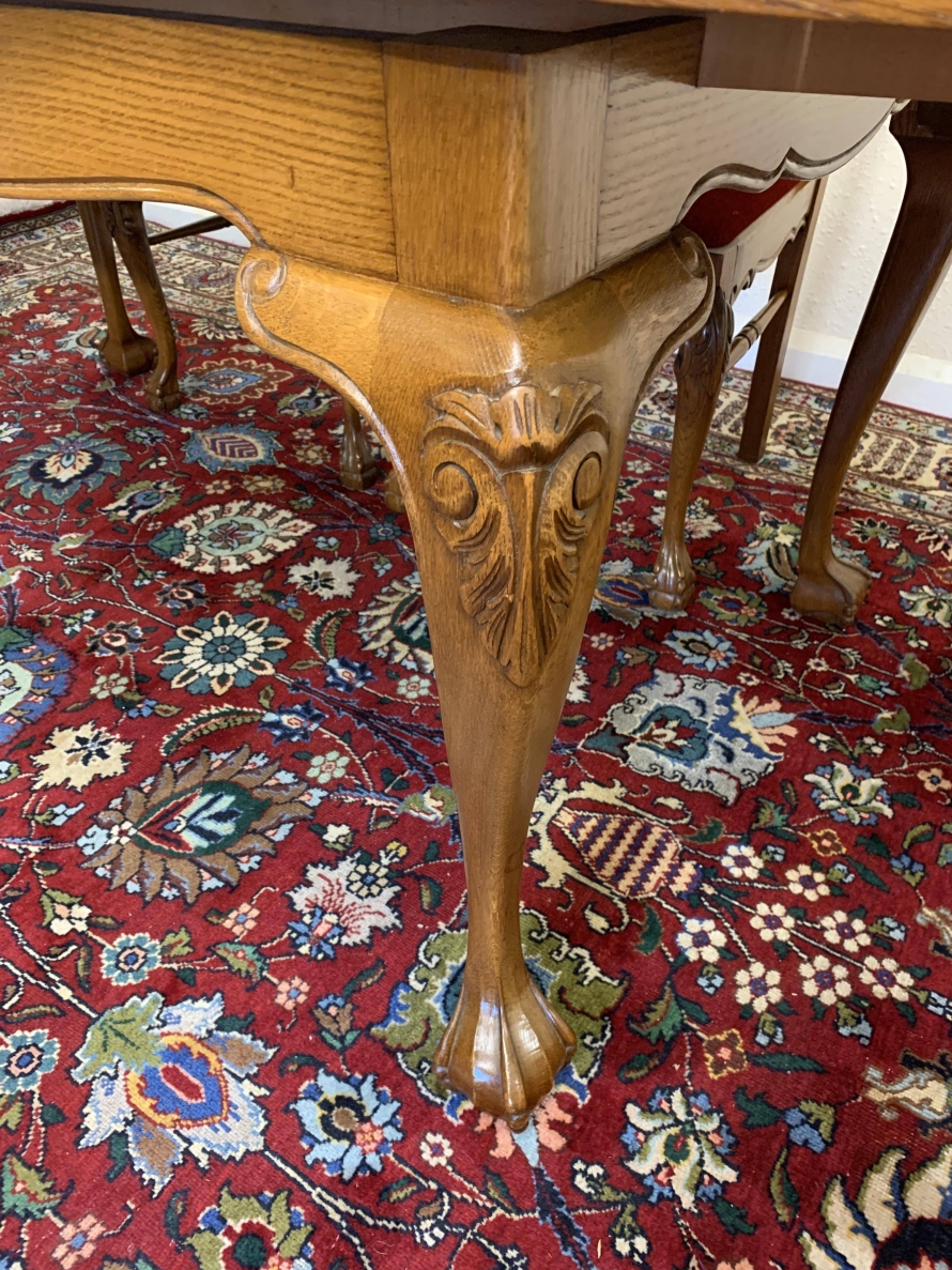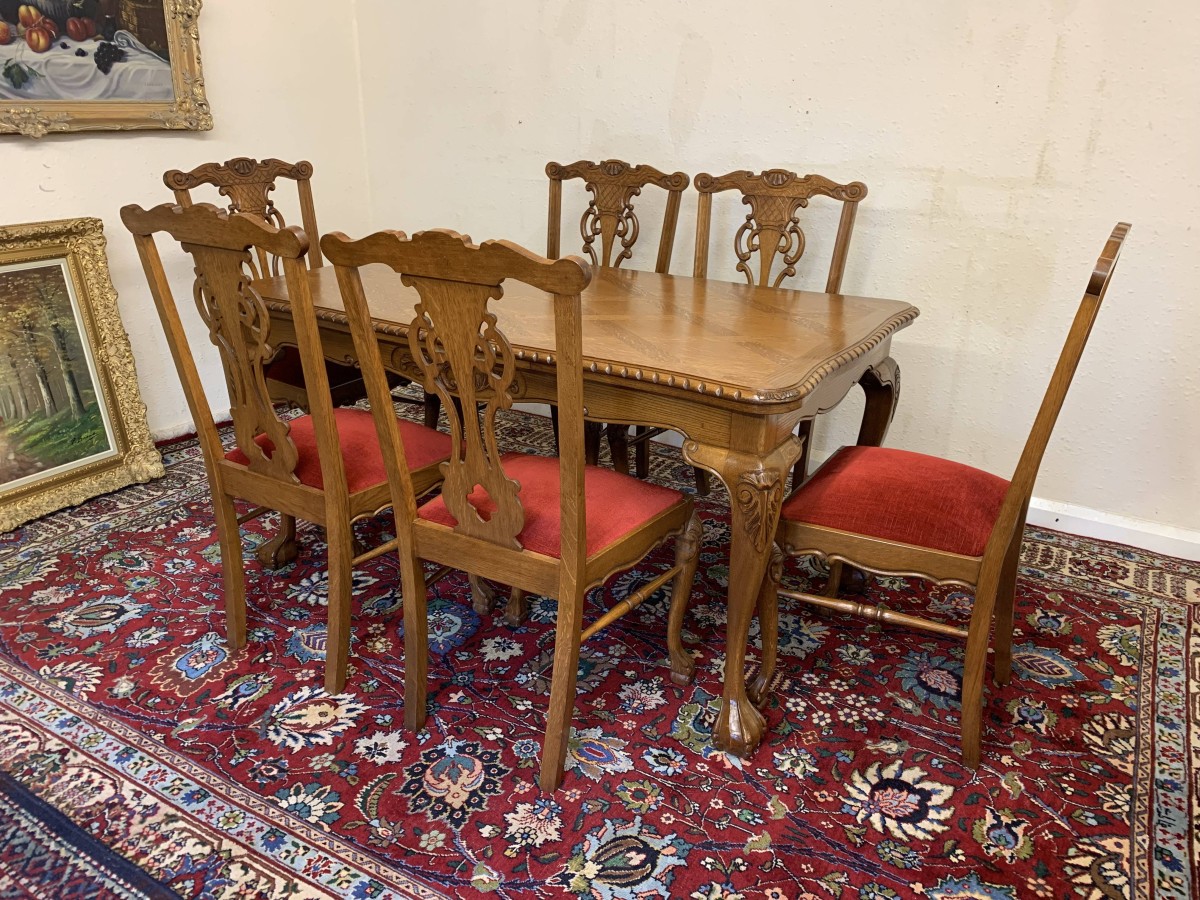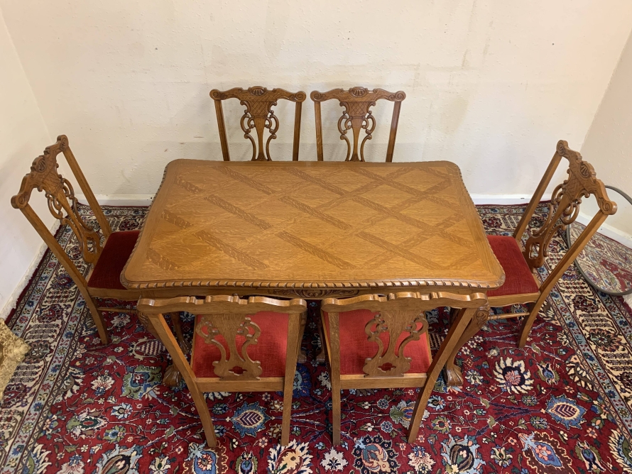 The shaped table top has a parquetry top with carved edging. Shaped sides having ornate carving, standing on four carved cabriole shaped legs on paw feet. The table has two hidden extension leaves which pull out from either end. The six matching chairs which have a shaped carved back, removable cushioned upholstered seat pad two carved cabriole legs with paw feet to the front.