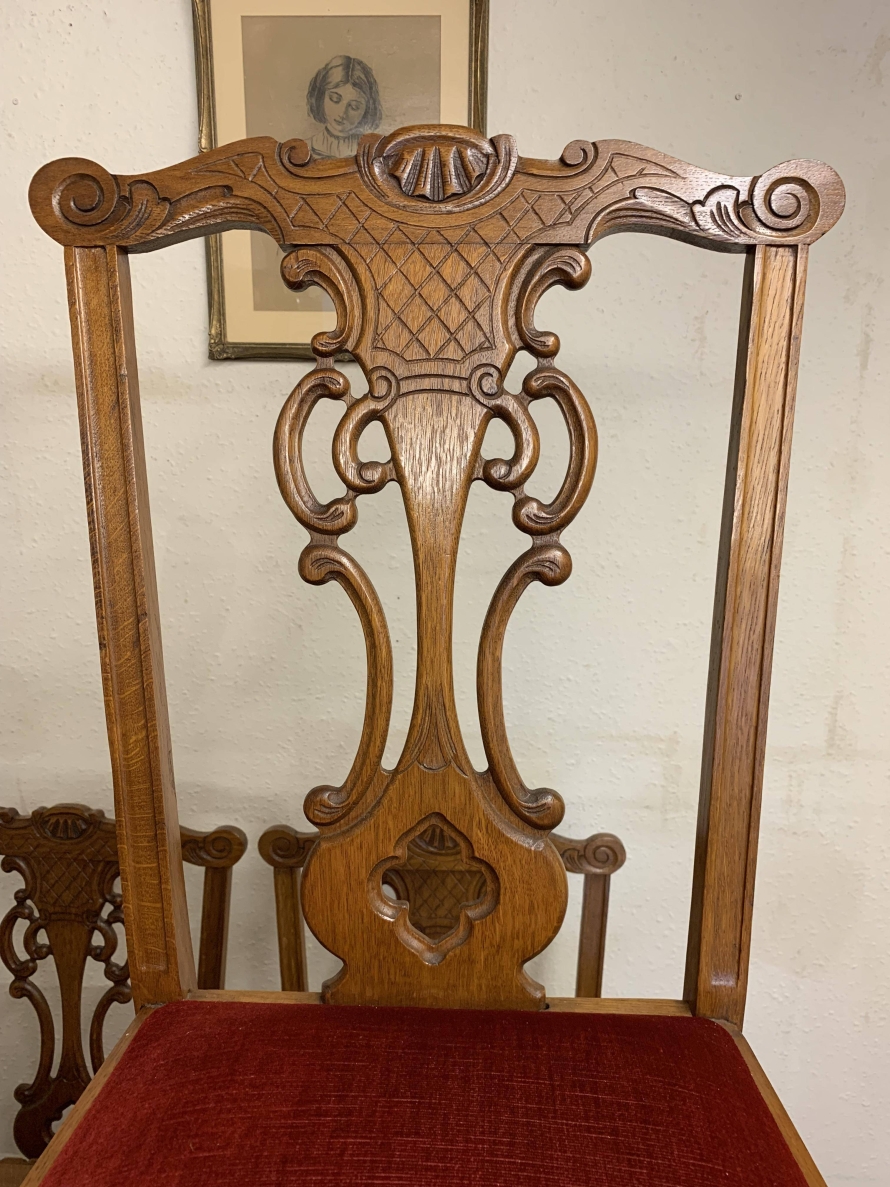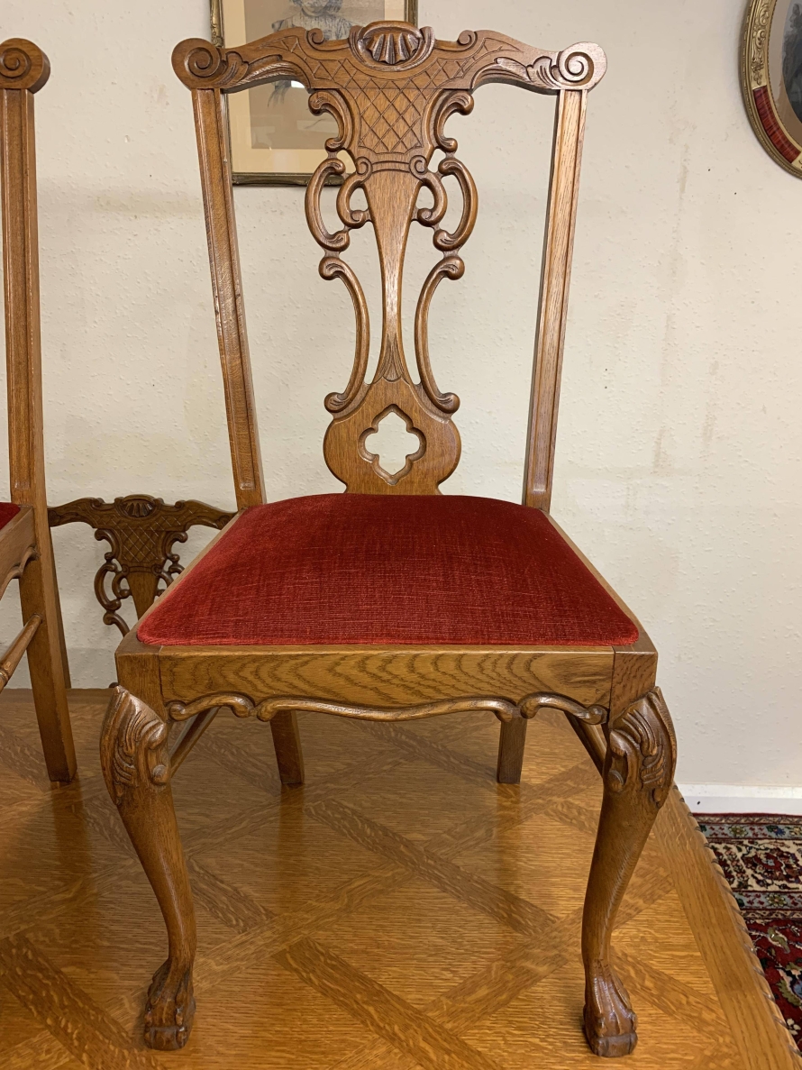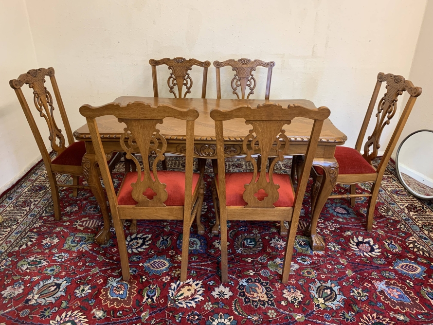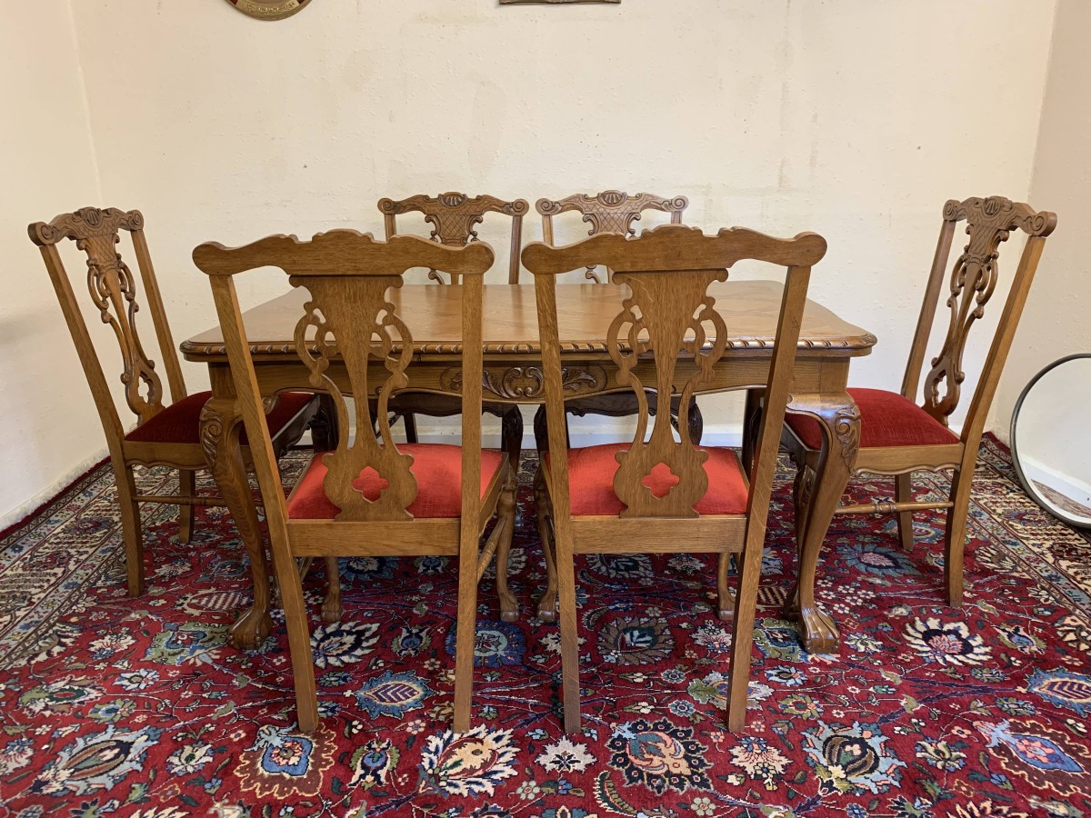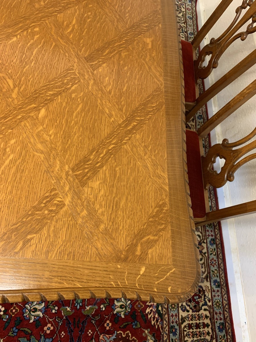 The shaped table top has a parquetry top with carved edging. Shaped sides having ornate carving, standing on four carved cabriole shaped legs on paw feet. The table has two hidden extension leaves which pull out from either end. The six matching chairs which have a shaped carved back, removable cushioned upholstered seat pad two carved cabriole legs with paw feet to the front.