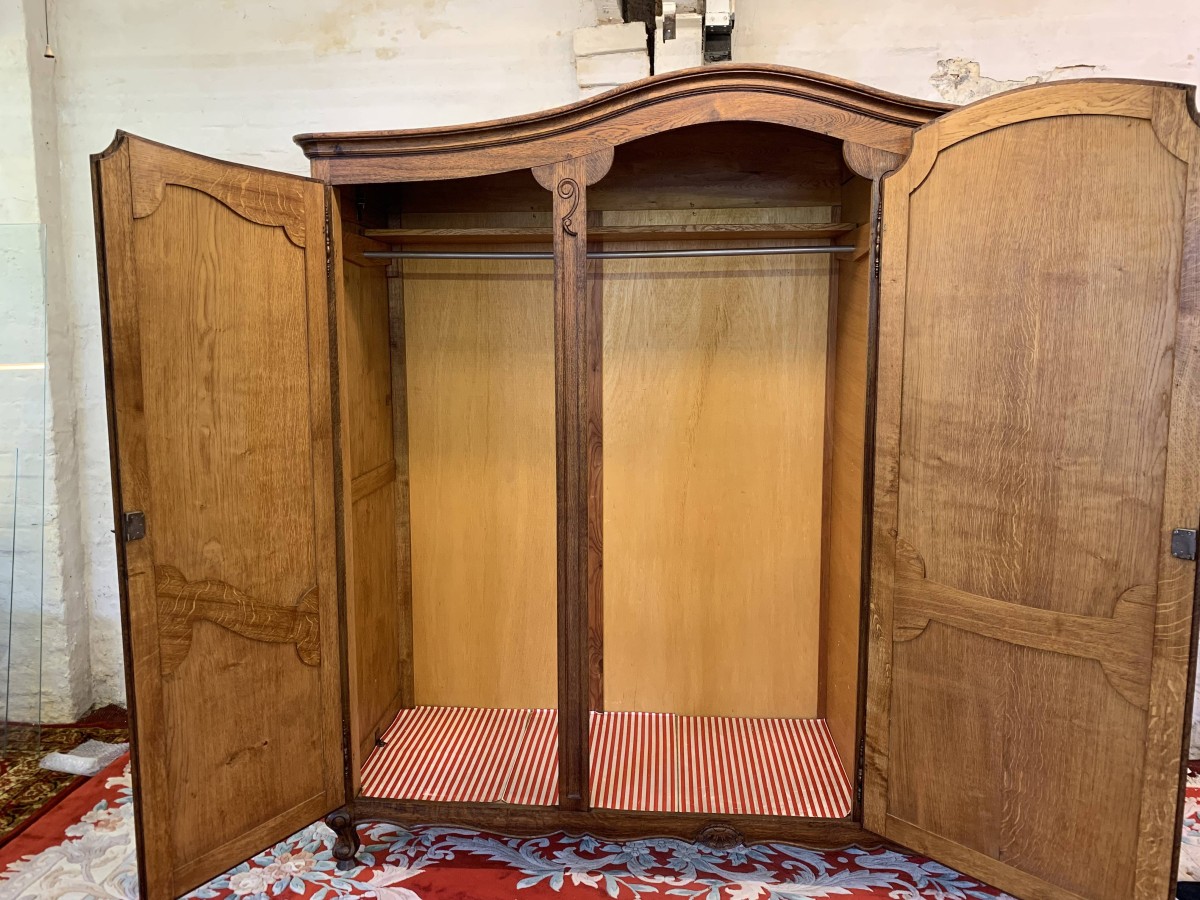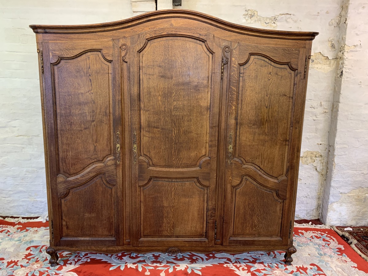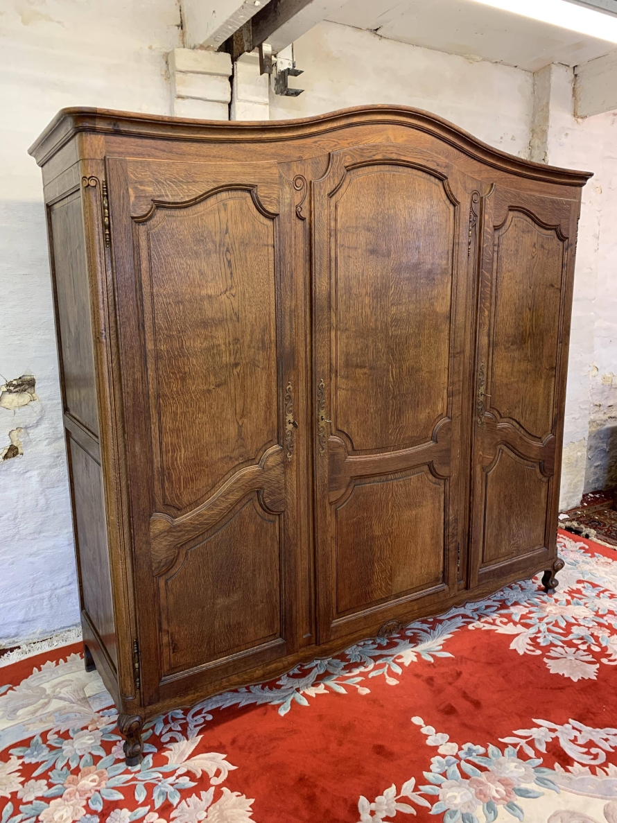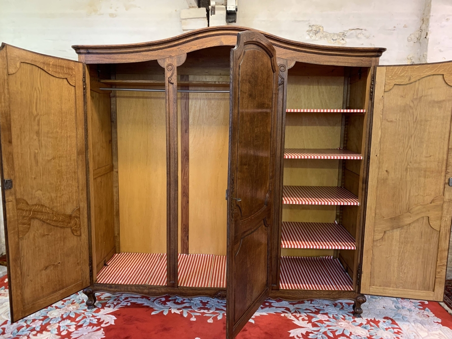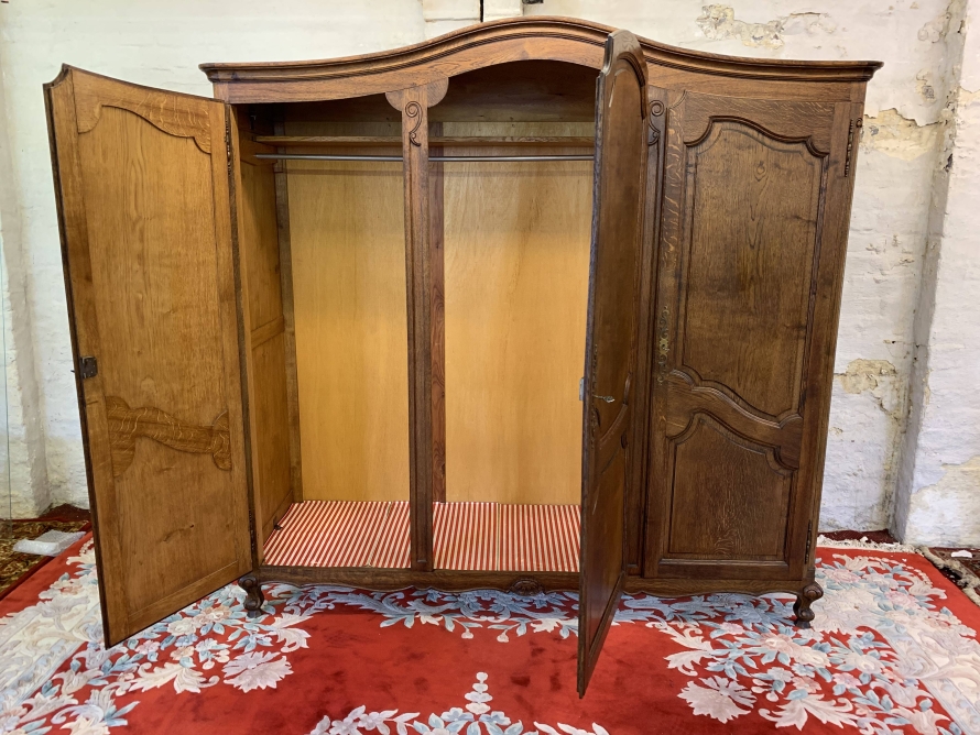 The shaped oversailing top sits above three lockable recessed panelled doors, each door having brass hinges, brass escutcheon and key. The left-hand door and central doors open to reveal a shelf above a hanging rail. The right-hand door opens to reveal four adjustable and removable shelves. Recessed panelled sides, shaped skirt with central carving – this stunning French armoire stands on two carved cabriole legs to the front. Please note this armoire breaks down for easy transportation and delivery into any home.