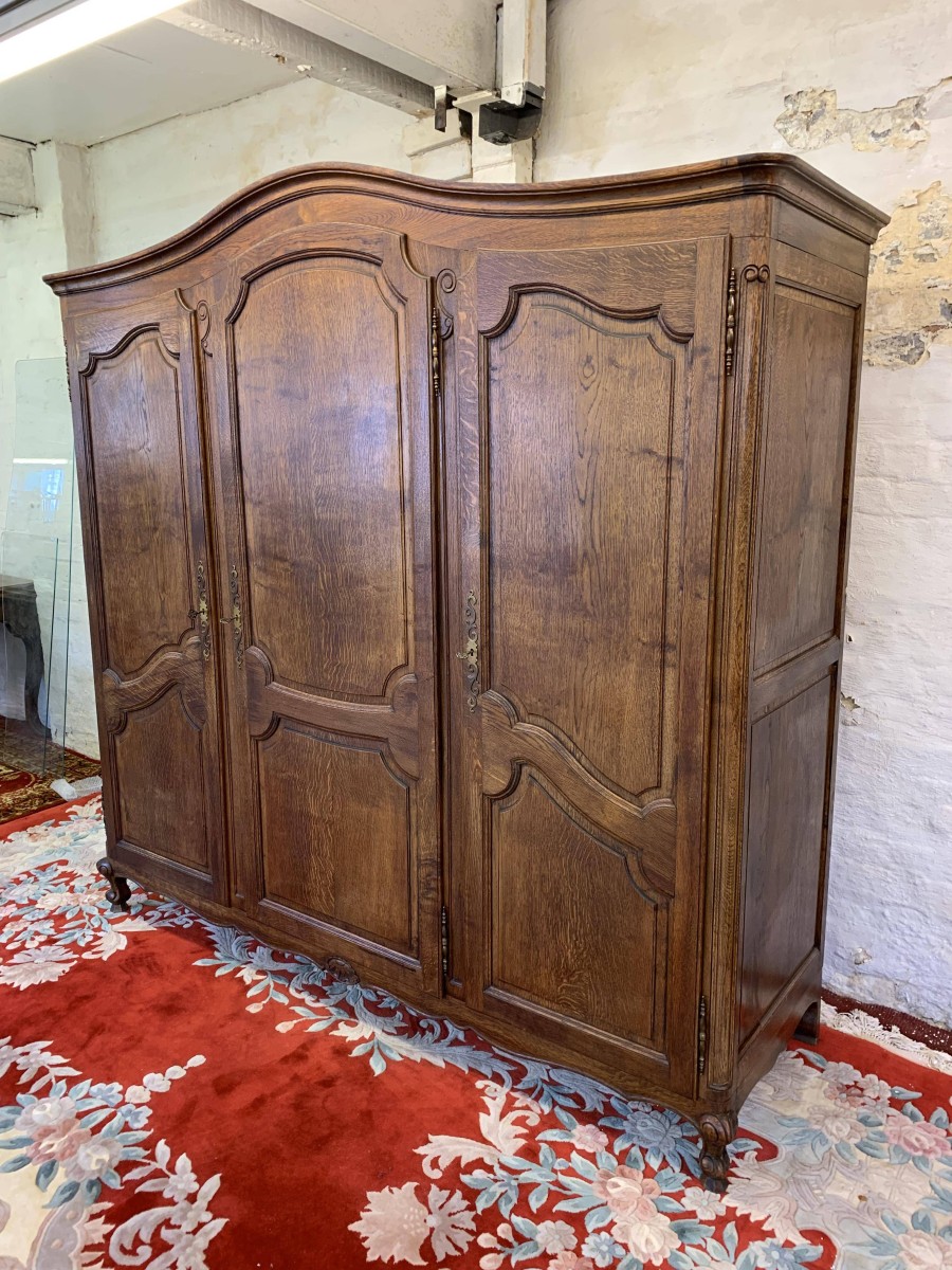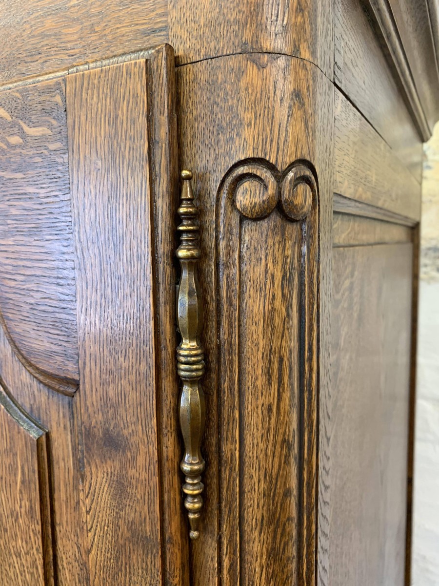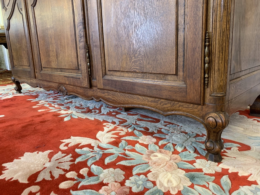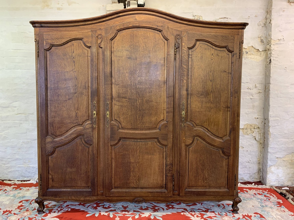 The shaped oversailing top sits above three lockable recessed panelled doors, each door having brass hinges, brass escutcheon and key. The left-hand door and central doors open to reveal a shelf above a hanging rail. The right-hand door opens to reveal four adjustable and removable shelves. Recessed panelled sides, shaped skirt with central carving – this stunning French armoire stands on two carved cabriole legs to the front. Please note this armoire breaks down for easy transportation and delivery into any home.