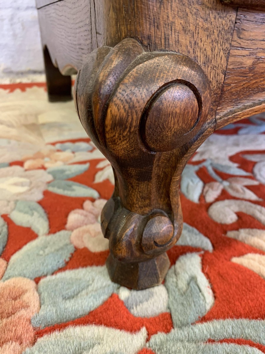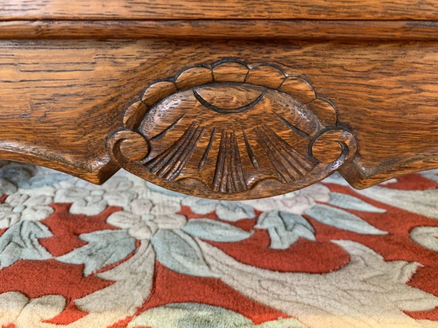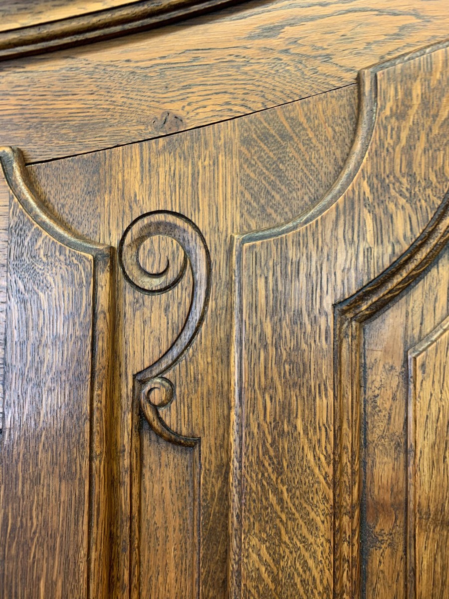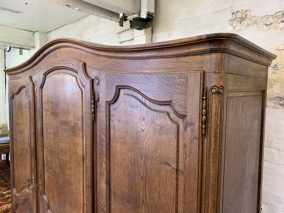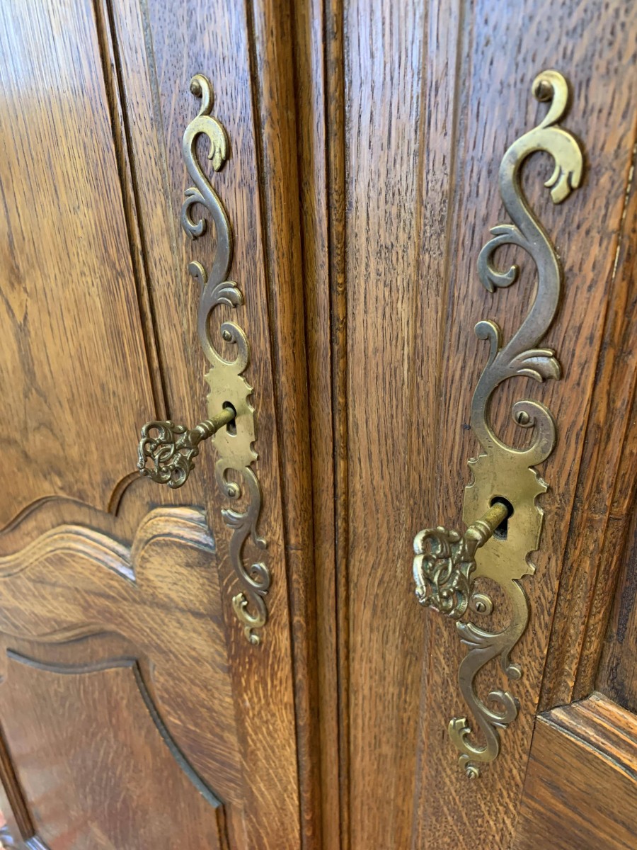 The shaped oversailing top sits above three lockable recessed panelled doors, each door having brass hinges, brass escutcheon and key. The left-hand door and central doors open to reveal a shelf above a hanging rail. The right-hand door opens to reveal four adjustable and removable shelves. Recessed panelled sides, shaped skirt with central carving – this stunning French armoire stands on two carved cabriole legs to the front. Please note this armoire breaks down for easy transportation and delivery into any home.
