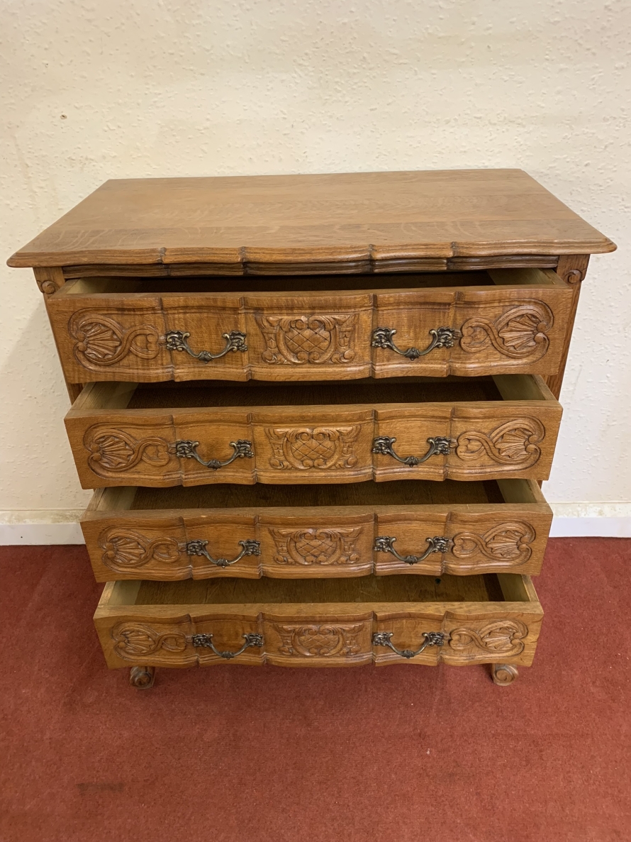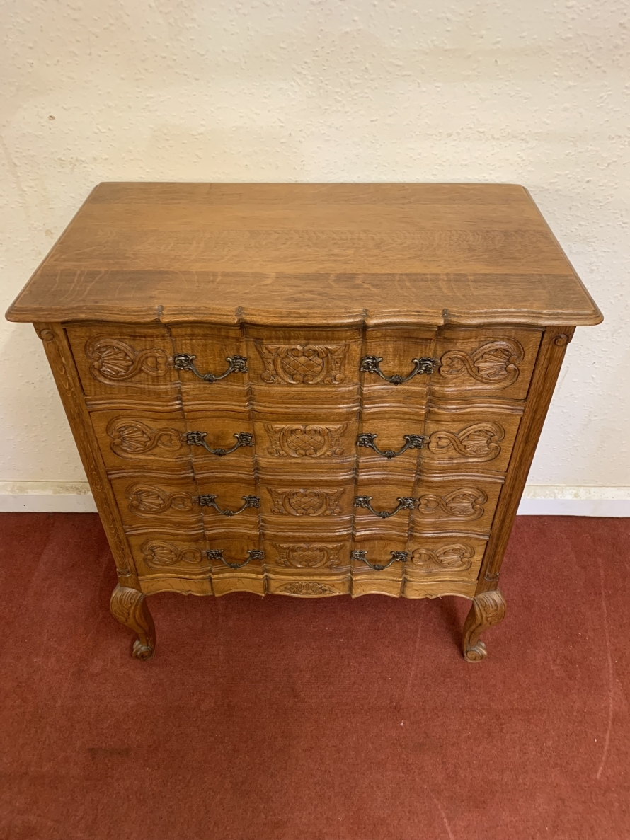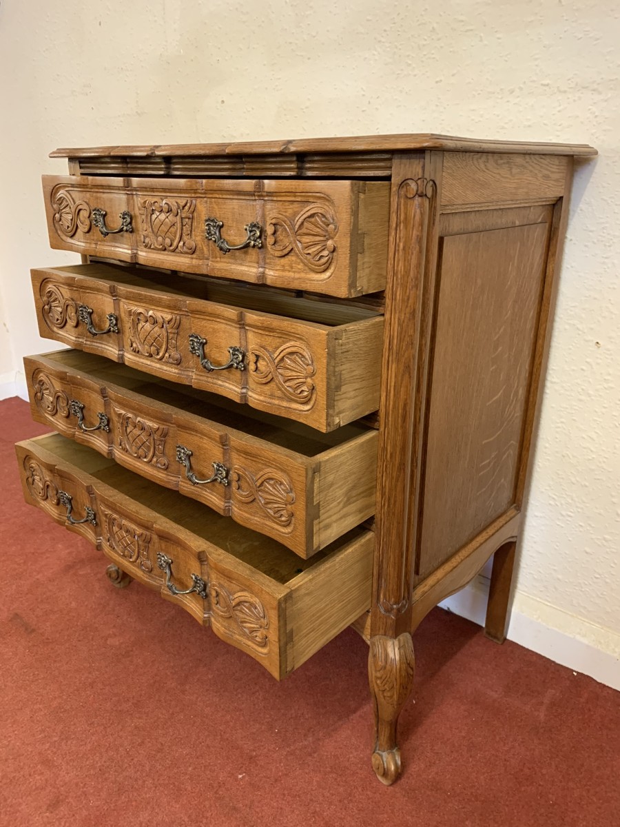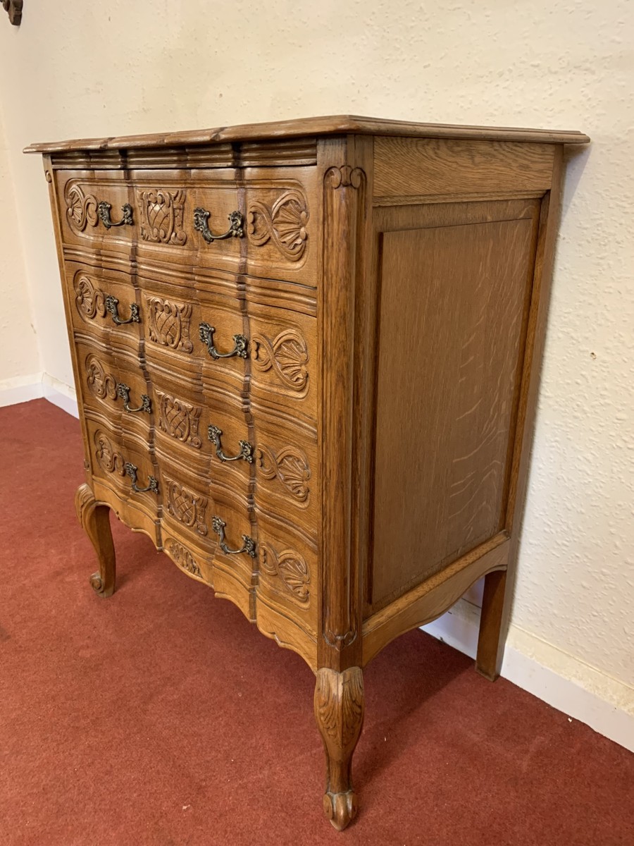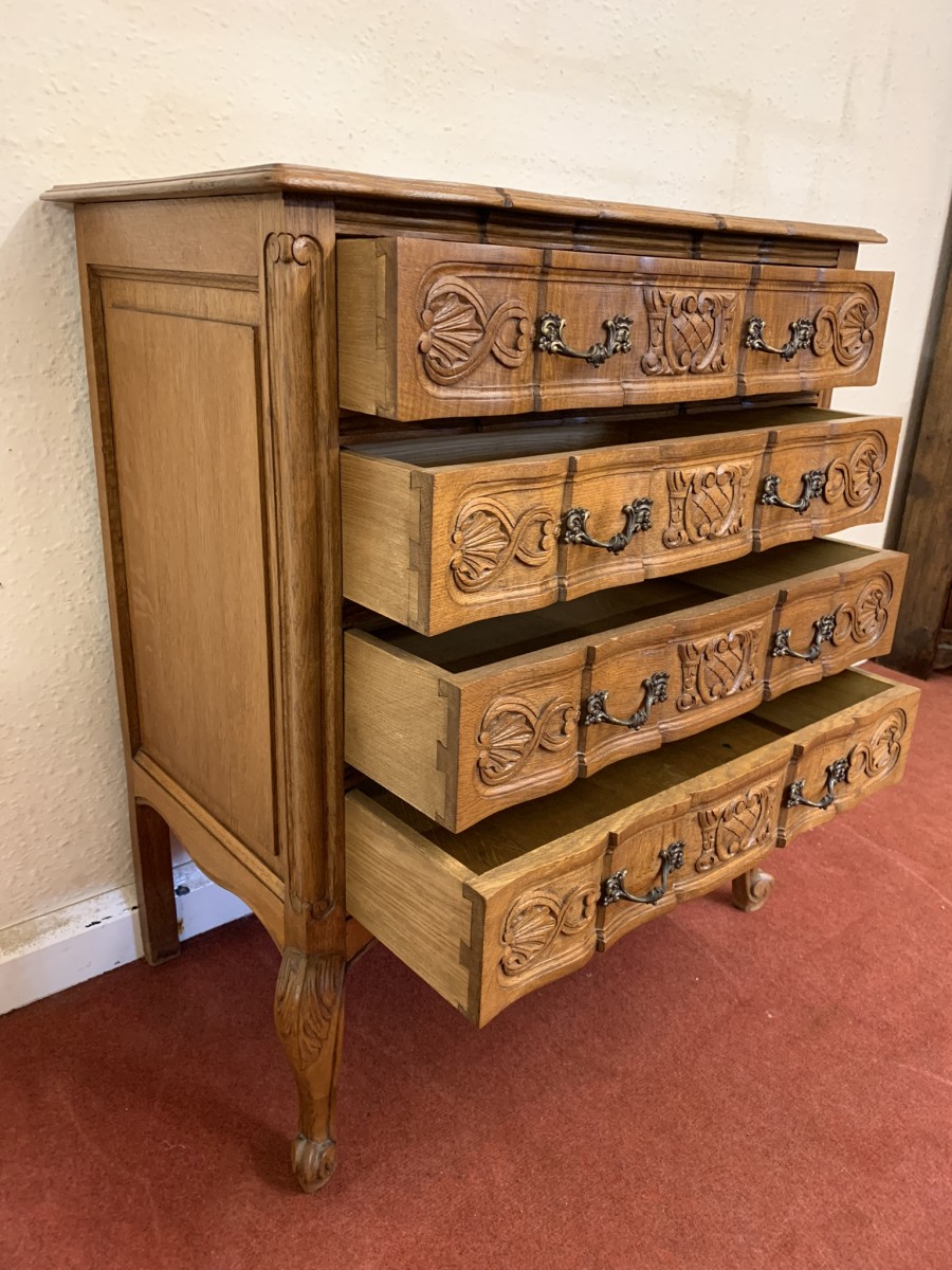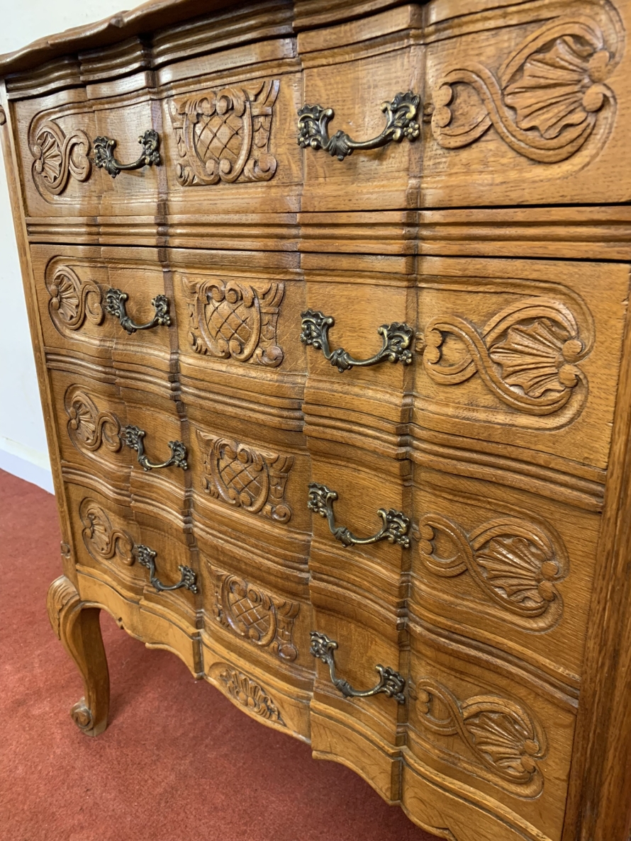 Made in glorious solid oak and in excellent condition. The shaped oversailing top sits above four serpentine shaped carved drawers, each drawer having a pair of ornate brass handles. Recessed panelled sides, shaped skirt with fabulous central carving this beautiful French chest of drawers stands on two carved cabriole shaped legs to the front.