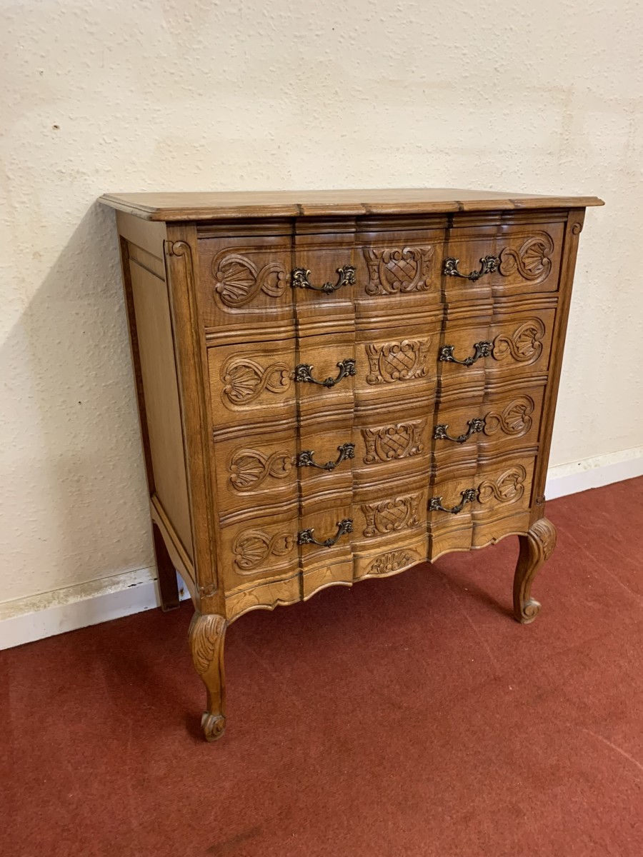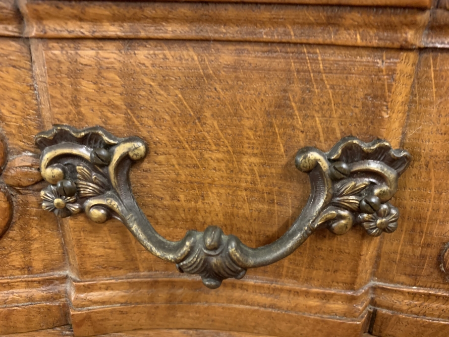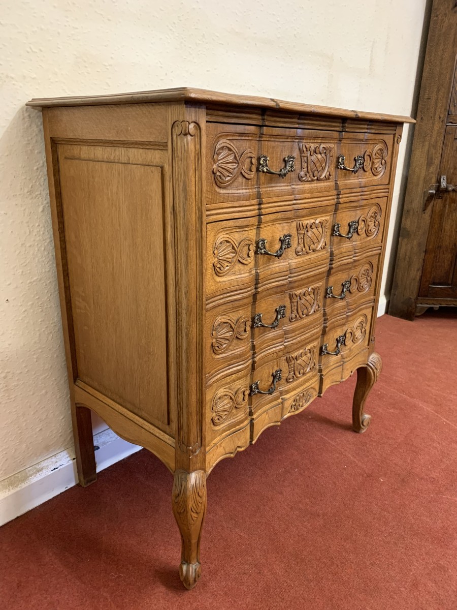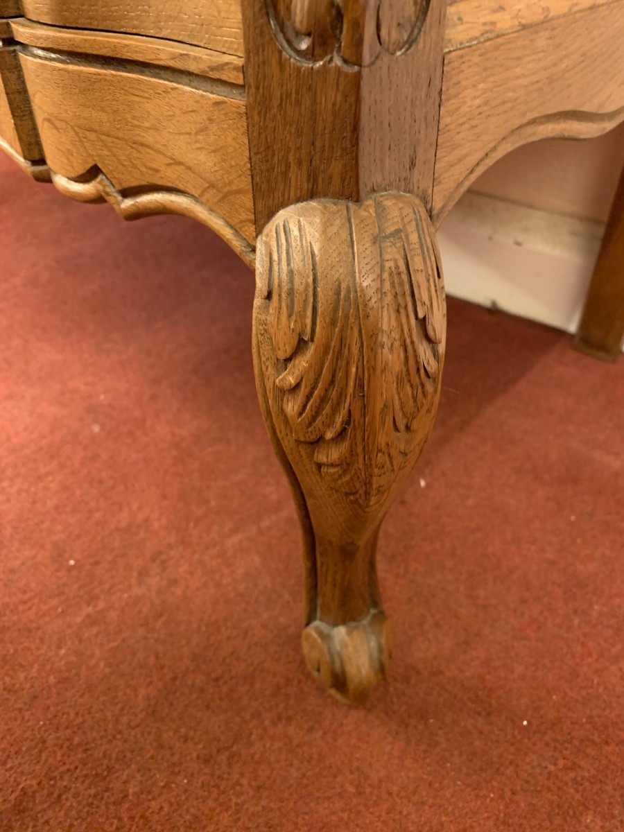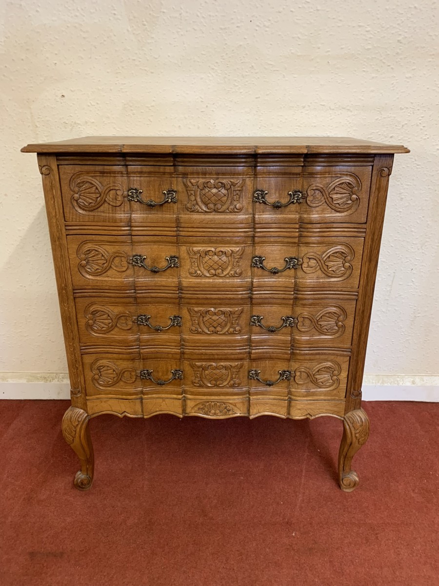 Made in glorious solid oak and in excellent condition. The shaped oversailing top sits above four serpentine shaped carved drawers, each drawer having a pair of ornate brass handles. Recessed panelled sides, shaped skirt with fabulous central carving this beautiful French chest of drawers stands on two carved cabriole shaped legs to the front.