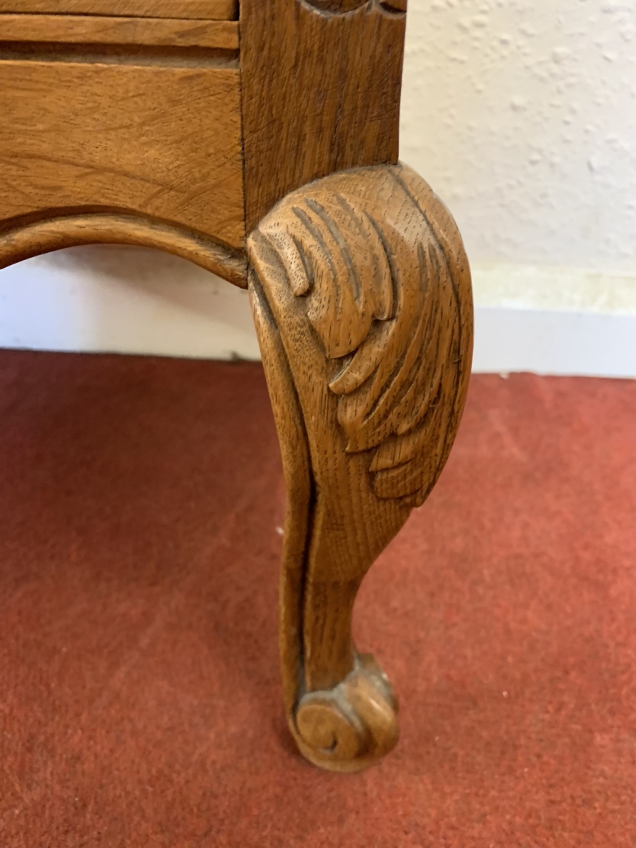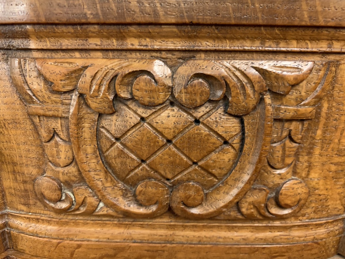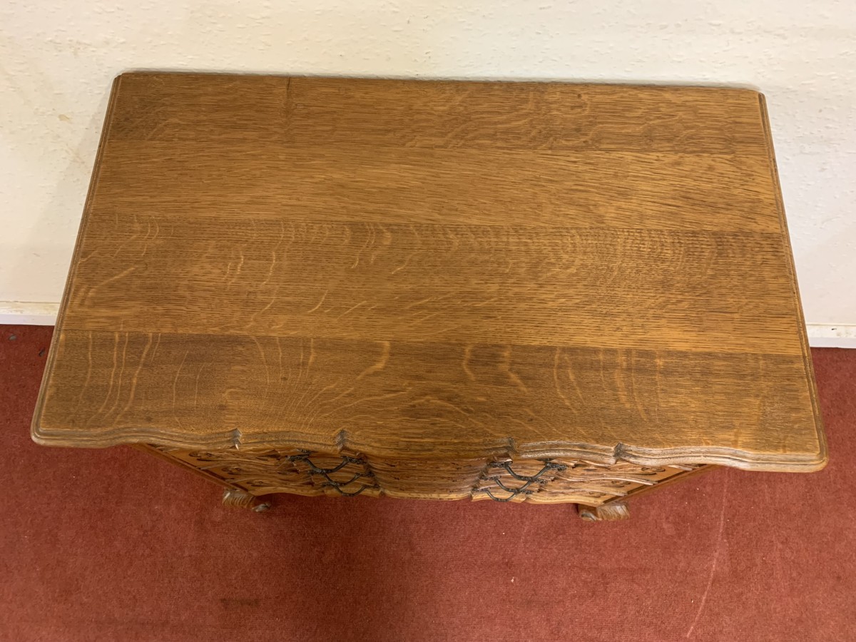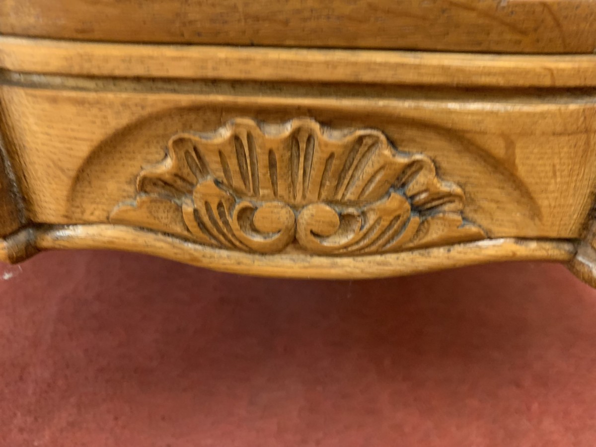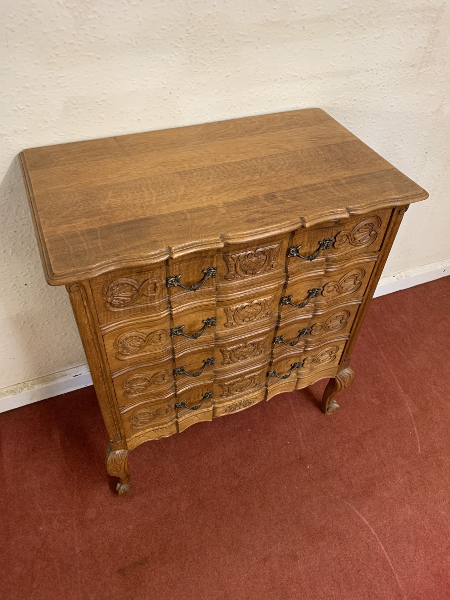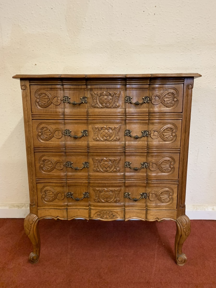 Made in glorious solid oak and in excellent condition. The shaped oversailing top sits above four serpentine shaped carved drawers, each drawer having a pair of ornate brass handles. Recessed panelled sides, shaped skirt with fabulous central carving this beautiful French chest of drawers stands on two carved cabriole shaped legs to the front.