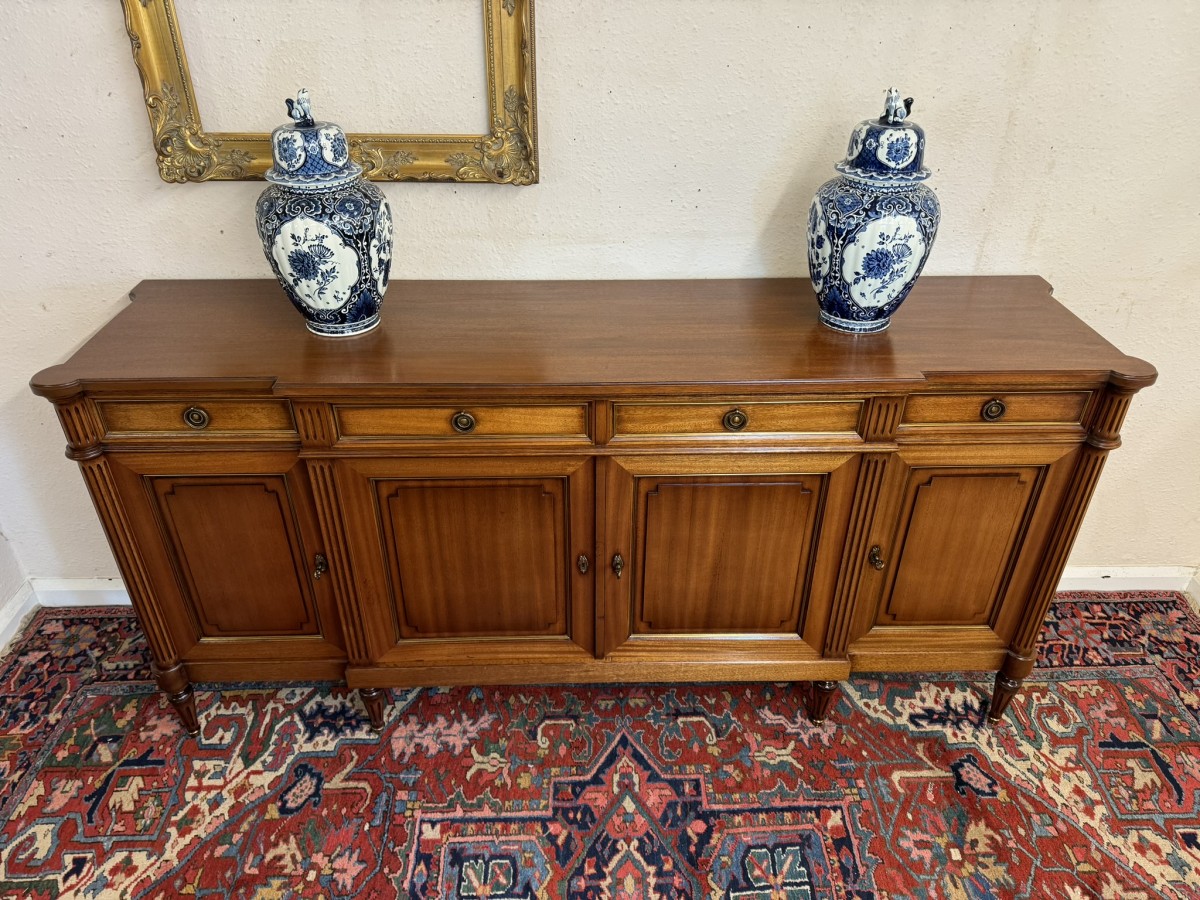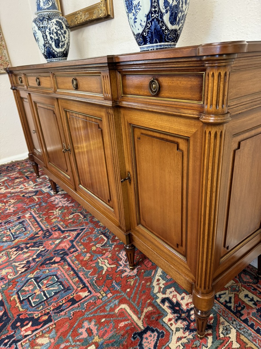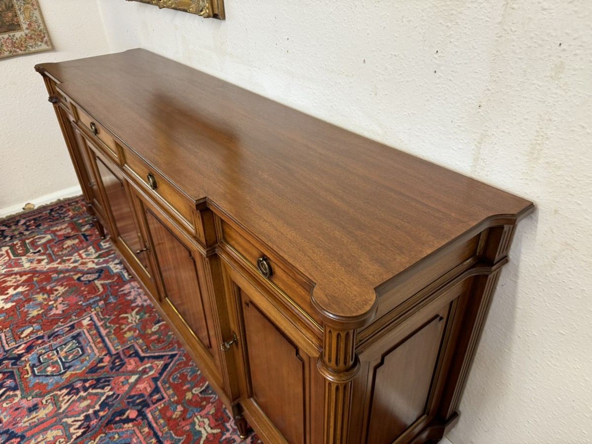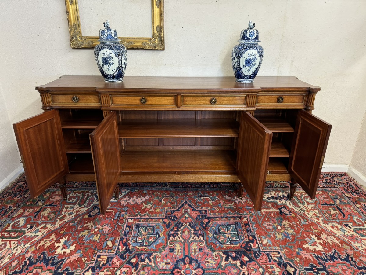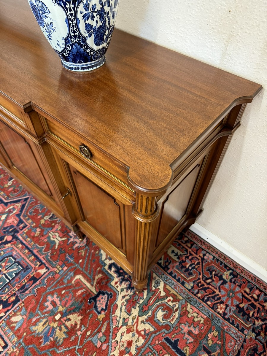This fabulous and French enfilade is in excellent condition.. Shaped oversailing top sits above four drawers, each drawer having a brass ring handle, below are four recessed panelled lockable cupboard doors, the left-hand and right-hand open to reveal two adjustable and removable shelves. The pair of central brakefront doors open to reveal one adjustable/removable shelf. Subtle brass decoration throughout, carved columns to the sides this fabulous item stands on six tapered carved legs with brass capped feet.