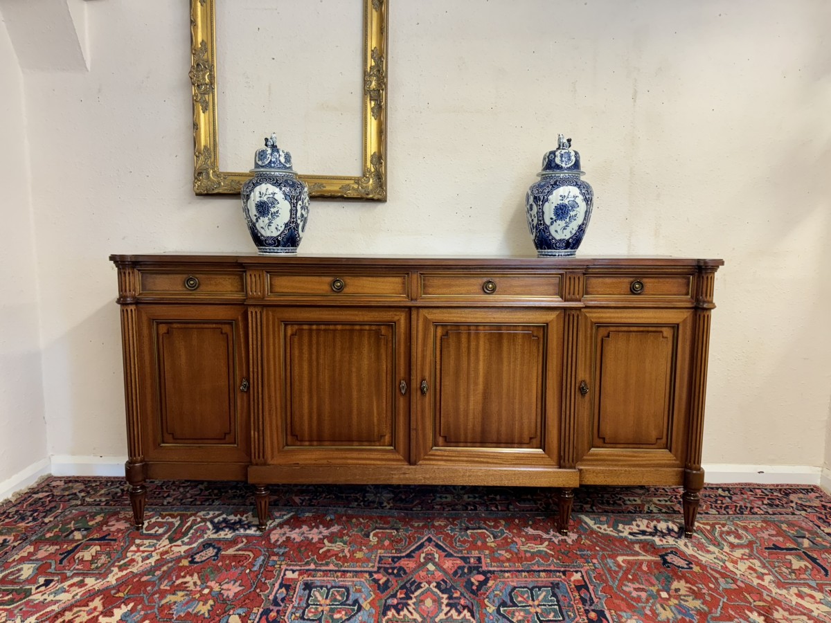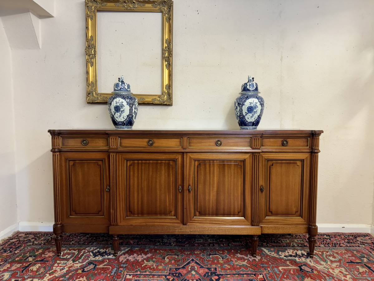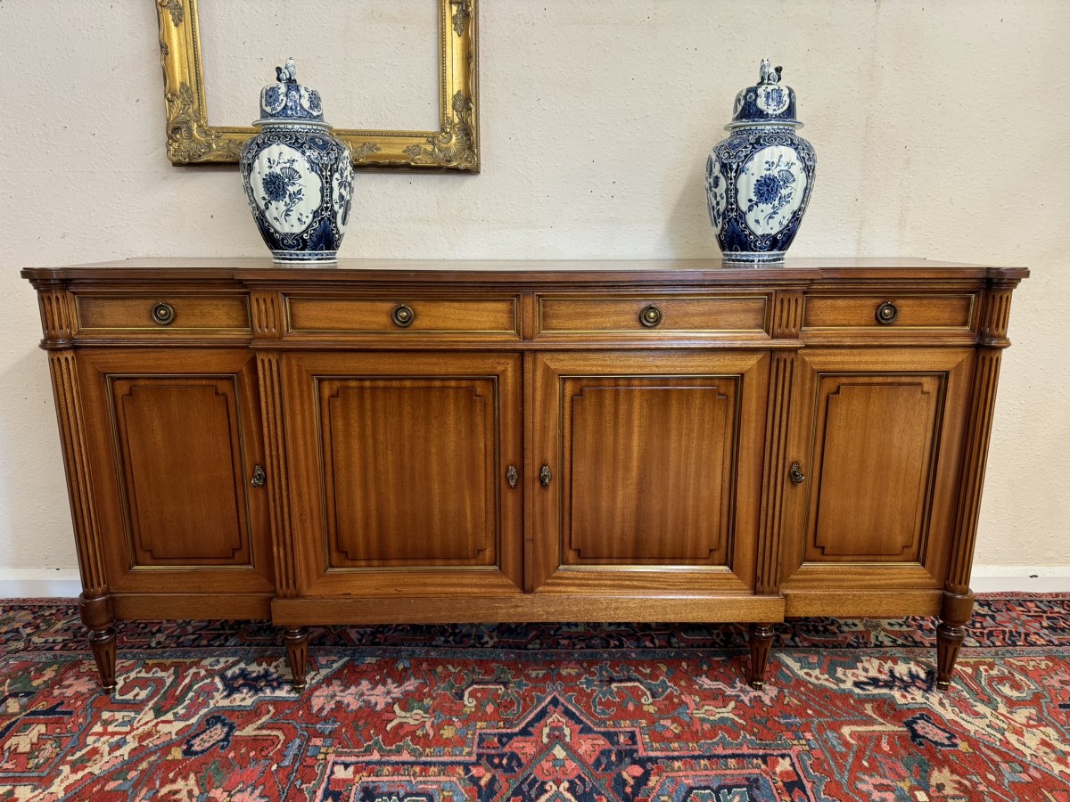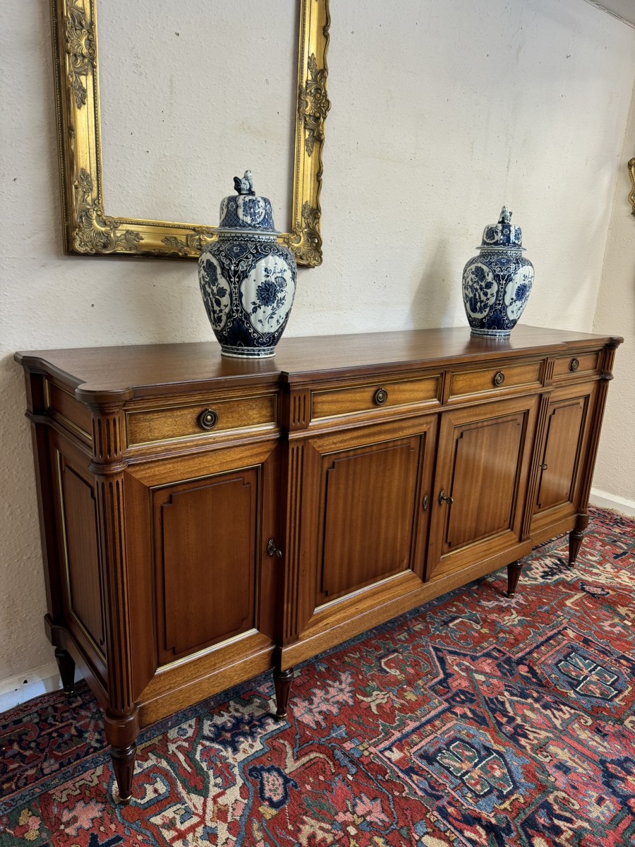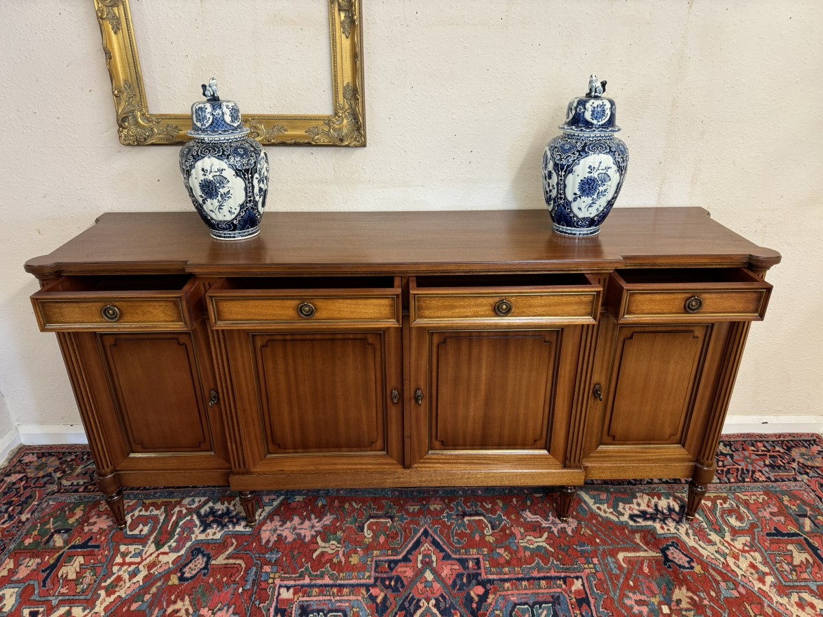 This fabulous and French enfilade is in excellent condition.. Shaped oversailing top sits above four drawers, each drawer having a brass ring handle, below are four recessed panelled lockable cupboard doors, the left-hand and right-hand open to reveal two adjustable and removable shelves. The pair of central brakefront doors open to reveal one adjustable/removable shelf. Subtle brass decoration throughout, carved columns to the sides this fabulous item stands on six tapered carved legs with brass capped feet.