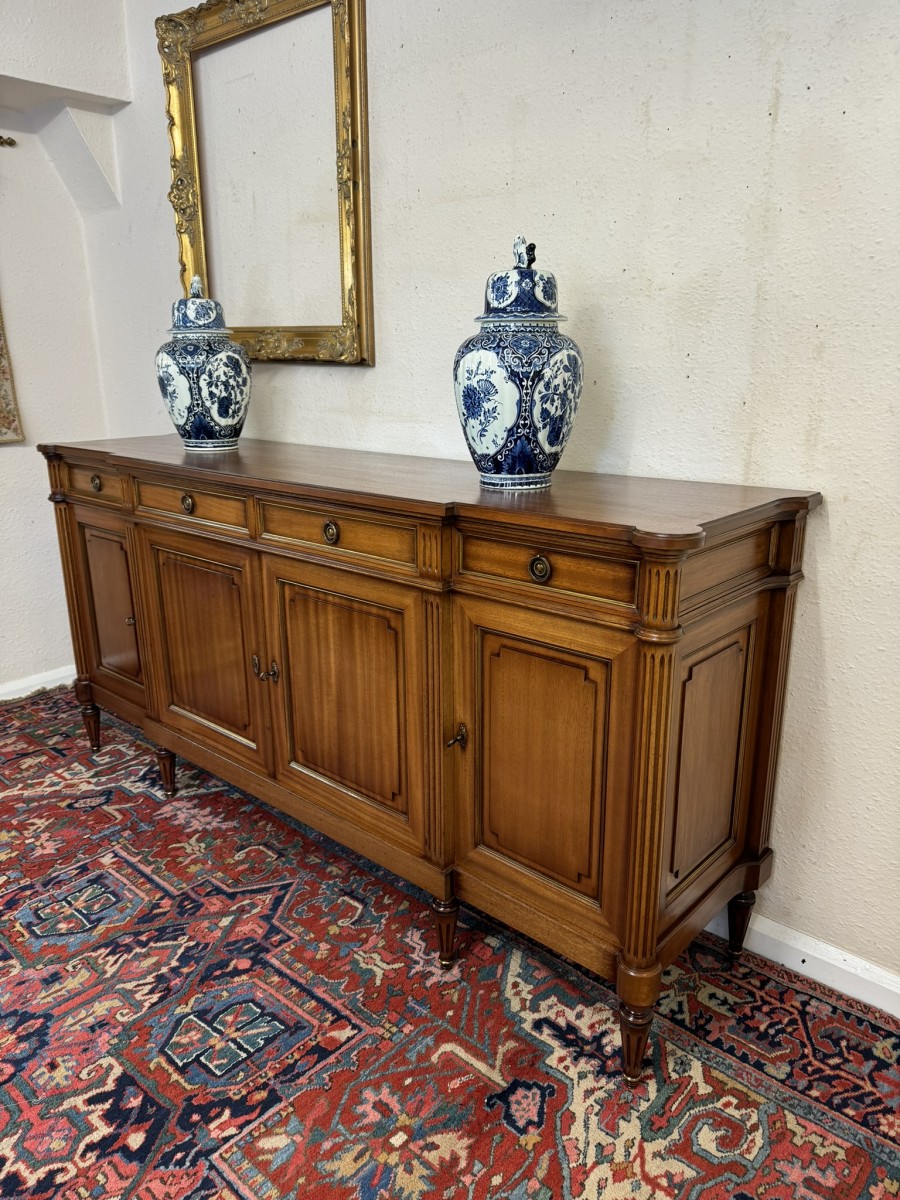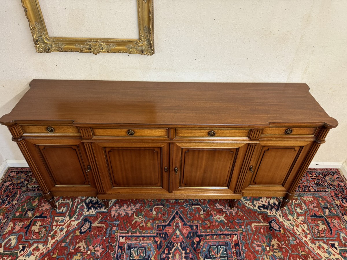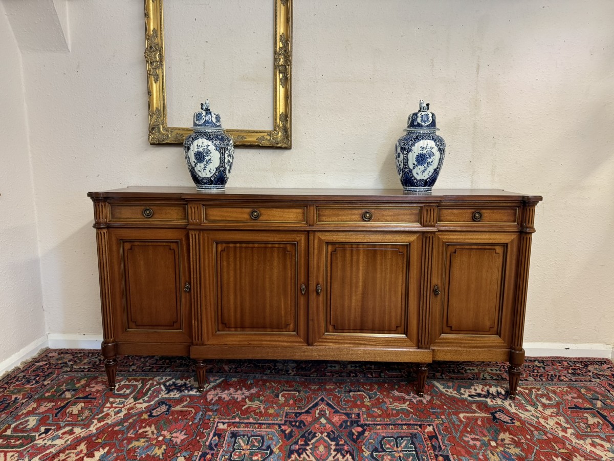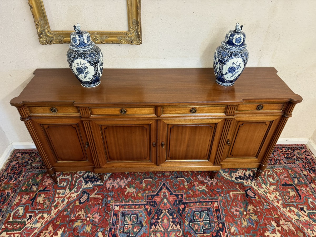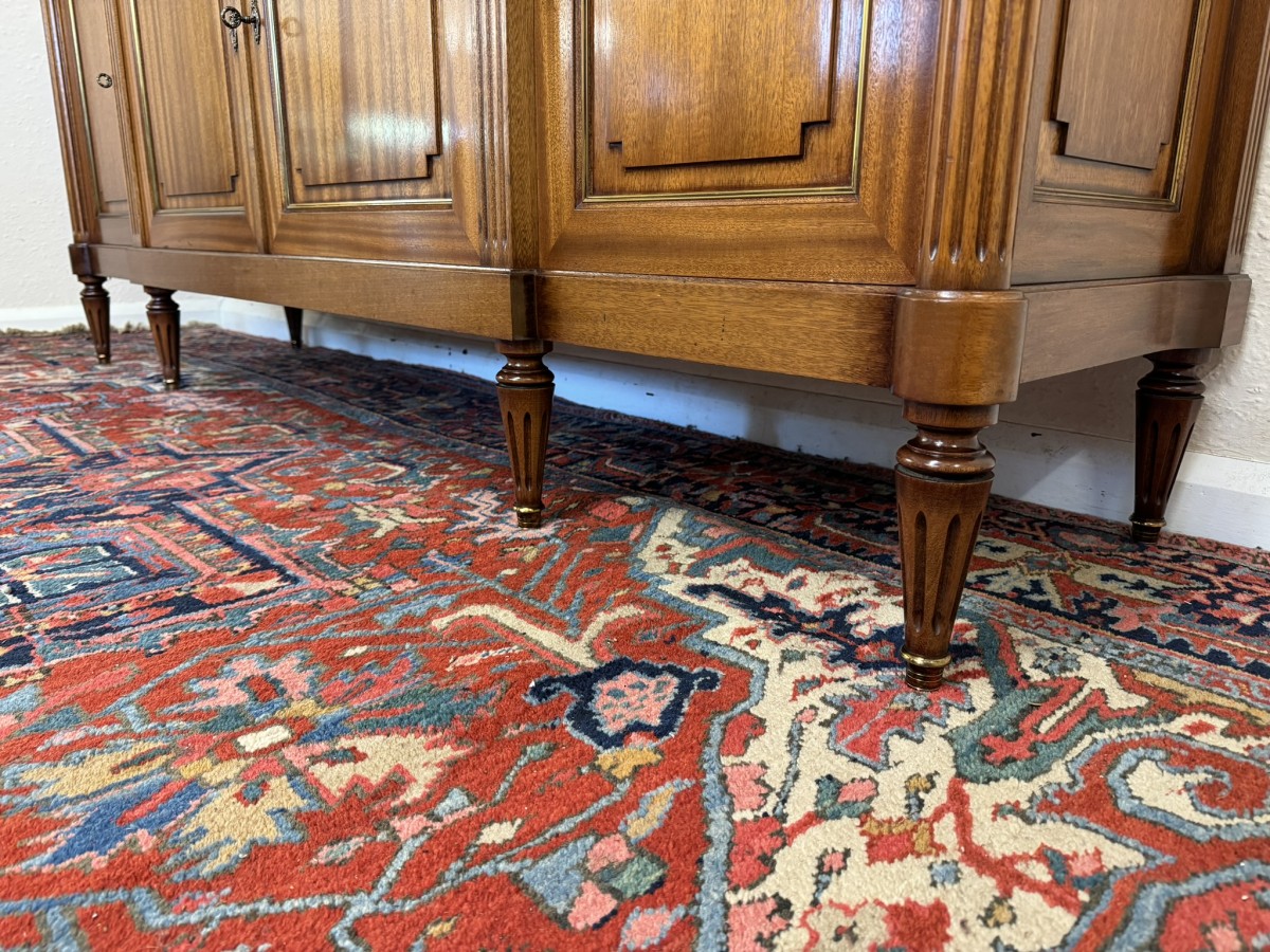 This fabulous and French enfilade is in excellent condition.. Shaped oversailing top sits above four drawers, each drawer having a brass ring handle, below are four recessed panelled lockable cupboard doors, the left-hand and right-hand open to reveal two adjustable and removable shelves. The pair of central brakefront doors open to reveal one adjustable/removable shelf. Subtle brass decoration throughout, carved columns to the sides this fabulous item stands on six tapered carved legs with brass capped feet.