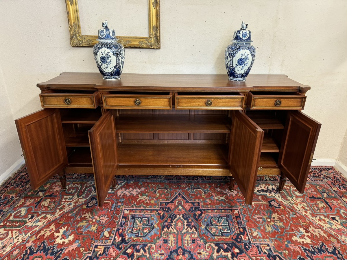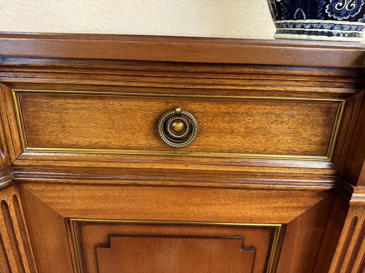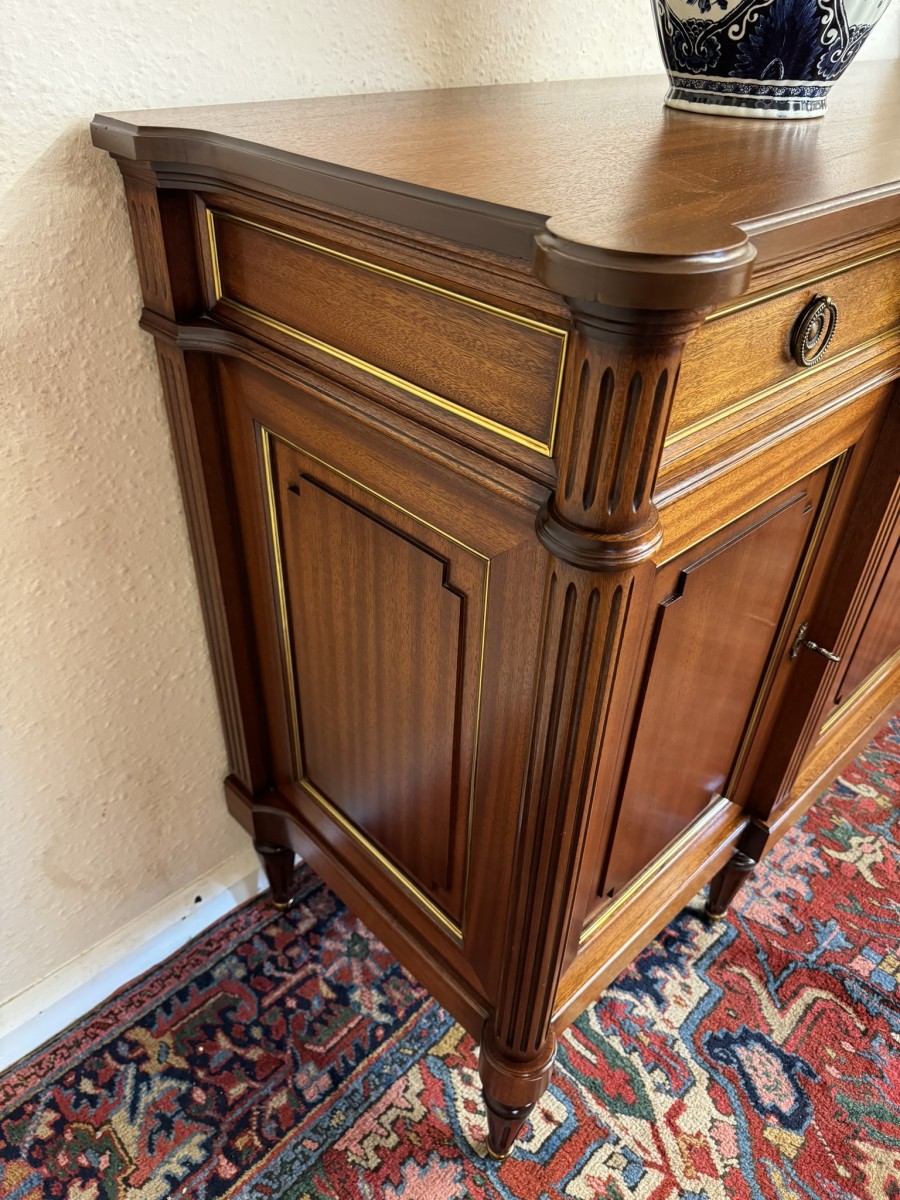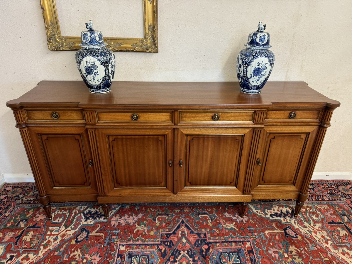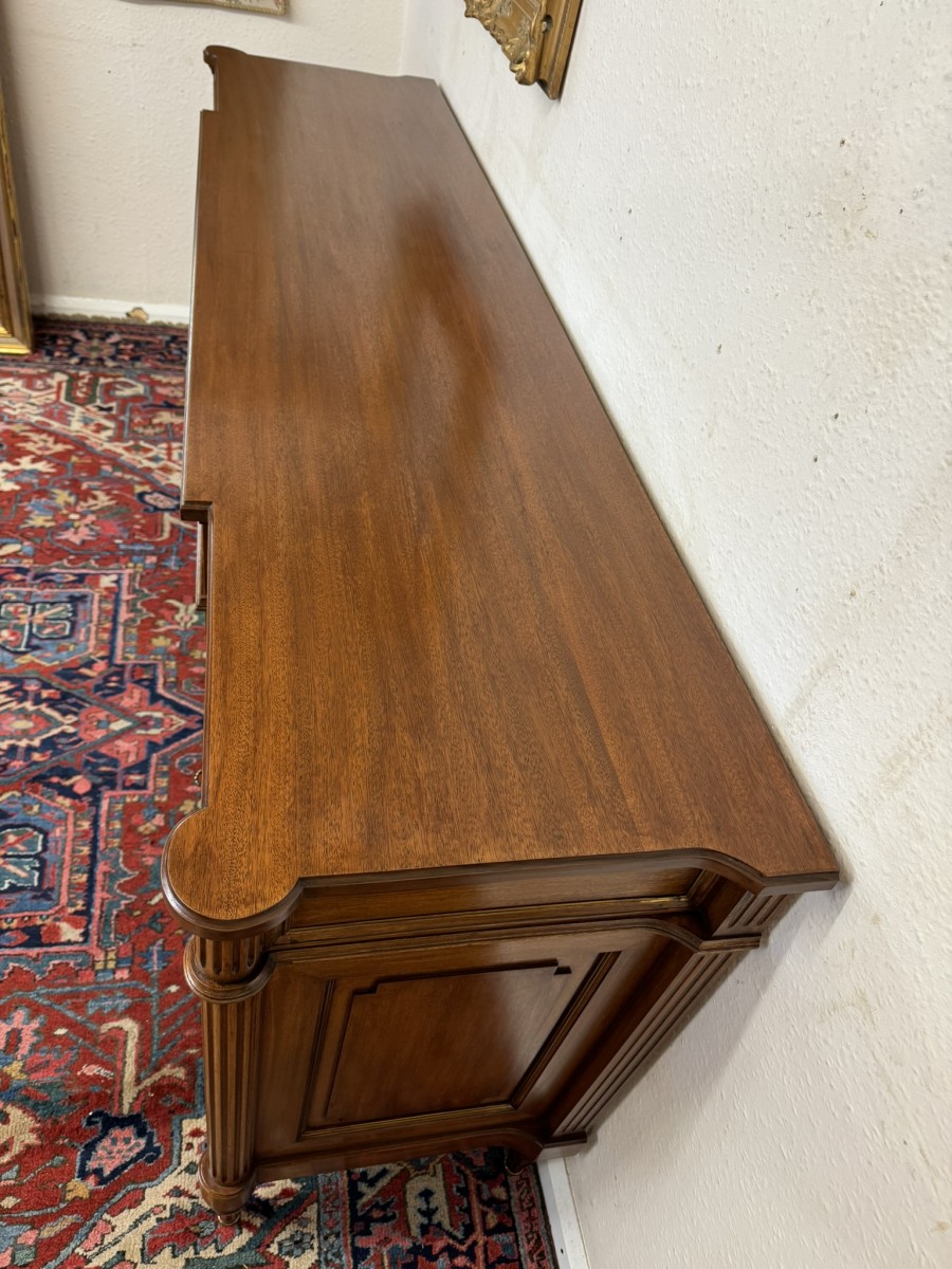 This fabulous and French enfilade is in excellent condition.. Shaped oversailing top sits above four drawers, each drawer having a brass ring handle, below are four recessed panelled lockable cupboard doors, the left-hand and right-hand open to reveal two adjustable and removable shelves. The pair of central brakefront doors open to reveal one adjustable/removable shelf. Subtle brass decoration throughout, carved columns to the sides this fabulous item stands on six tapered carved legs with brass capped feet.