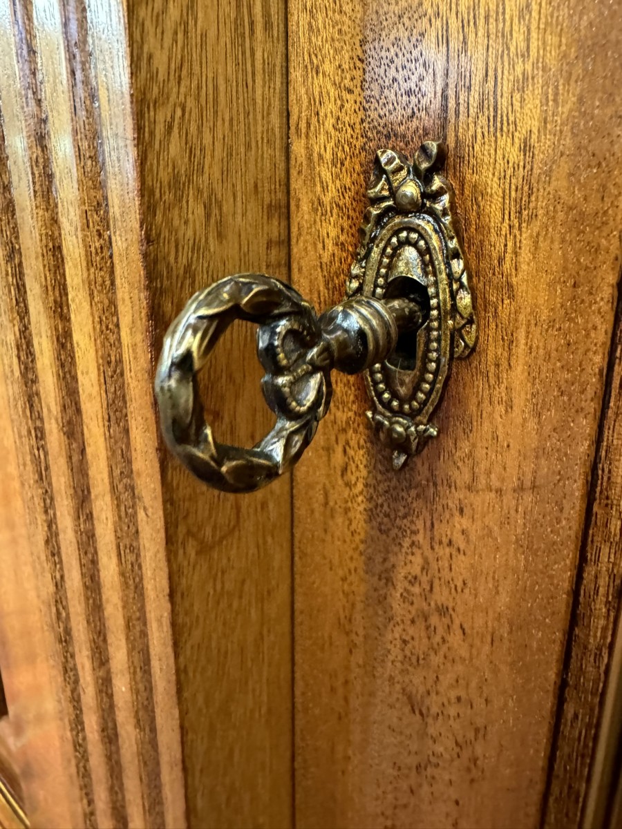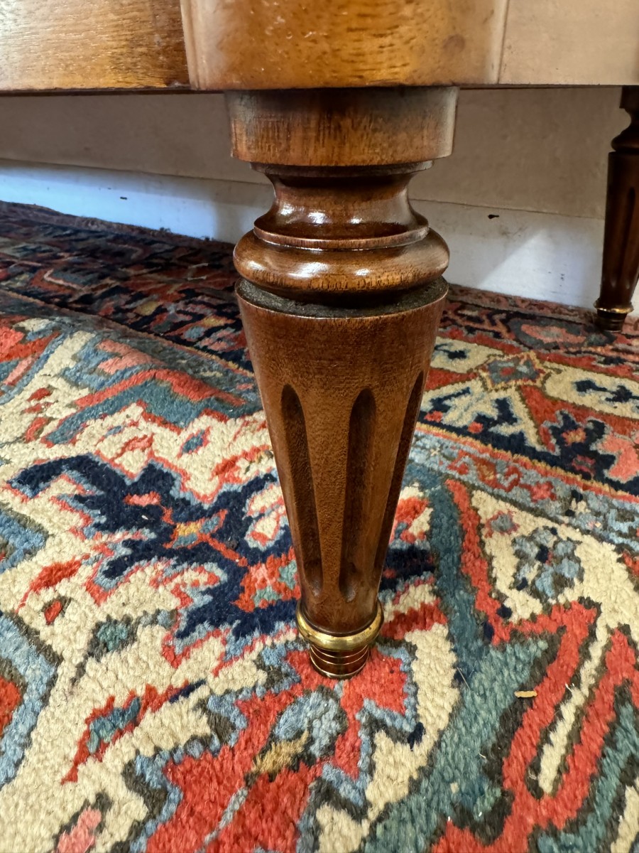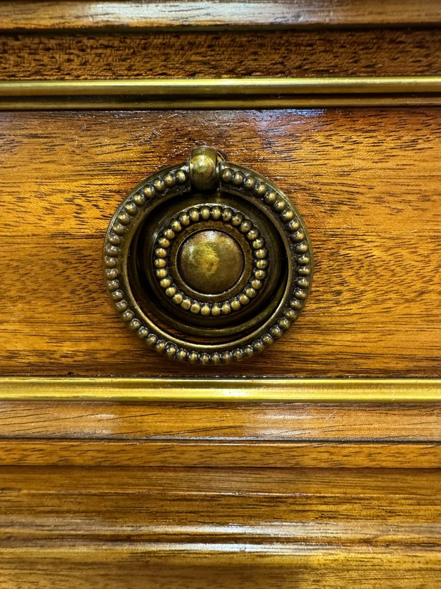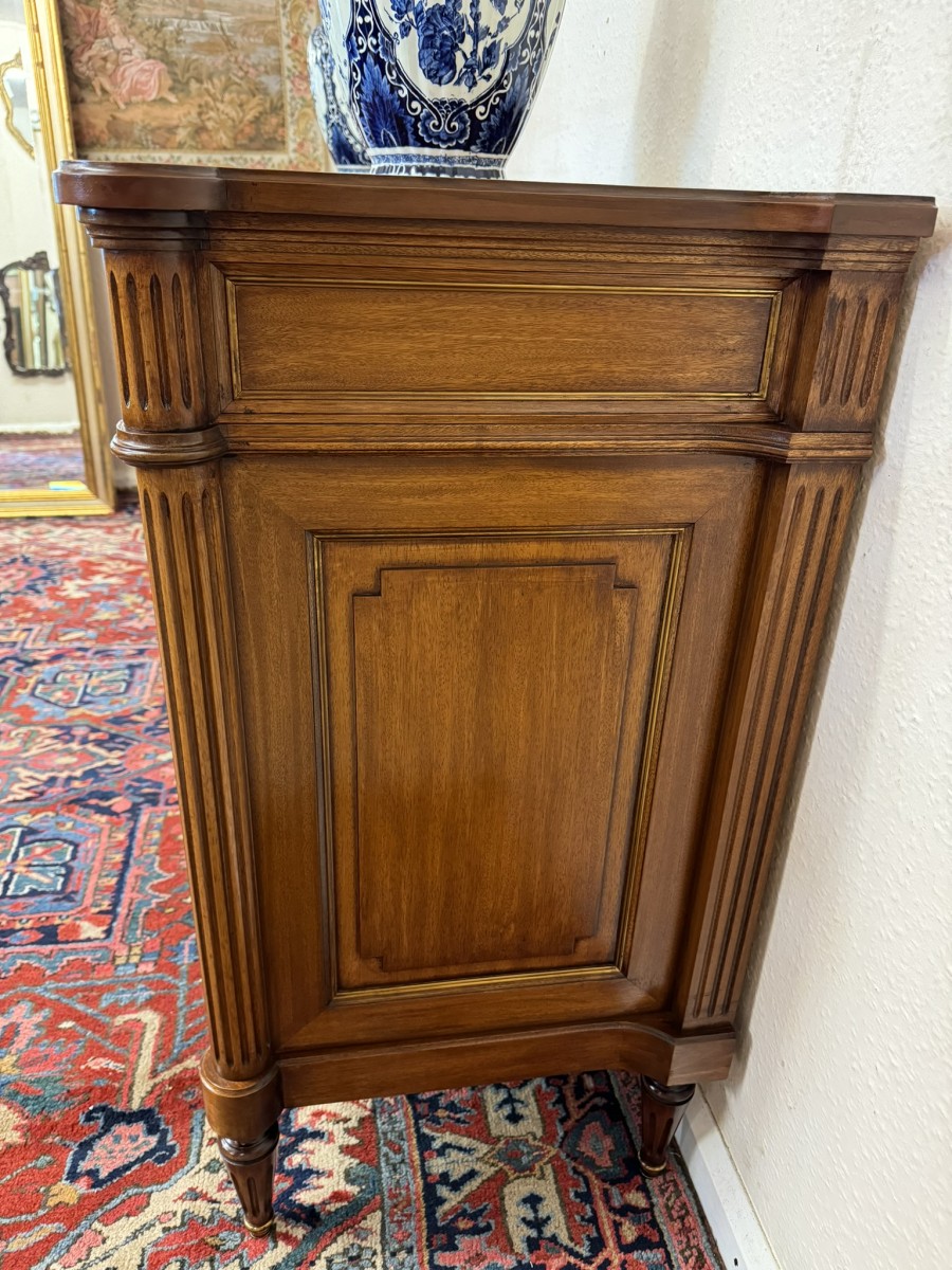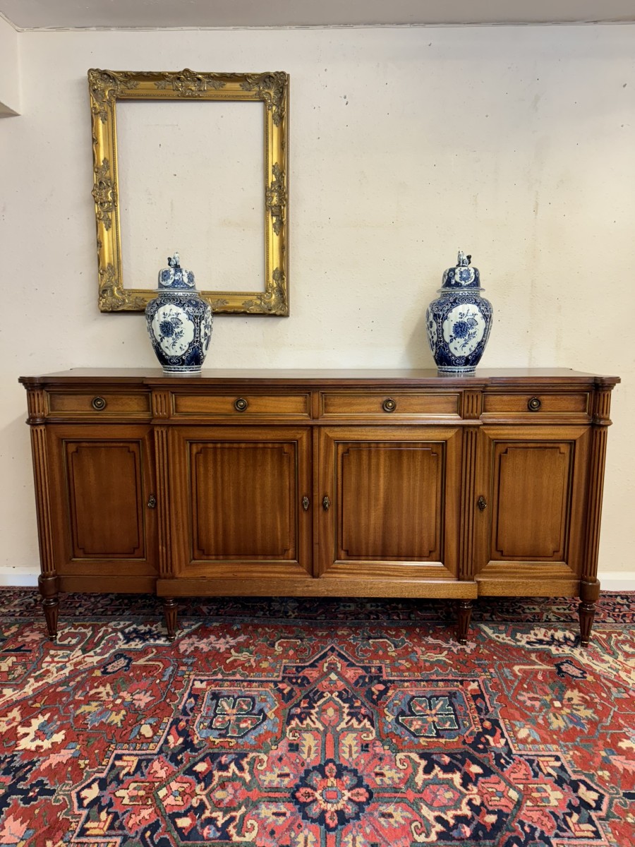 This fabulous and French enfilade is in excellent condition.. Shaped oversailing top sits above four drawers, each drawer having a brass ring handle, below are four recessed panelled lockable cupboard doors, the left-hand and right-hand open to reveal two adjustable and removable shelves. The pair of central brakefront doors open to reveal one adjustable/removable shelf. Subtle brass decoration throughout, carved columns to the sides this fabulous item stands on six tapered carved legs with brass capped feet.