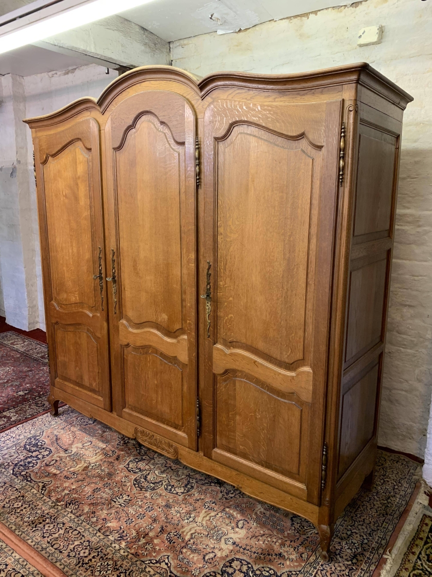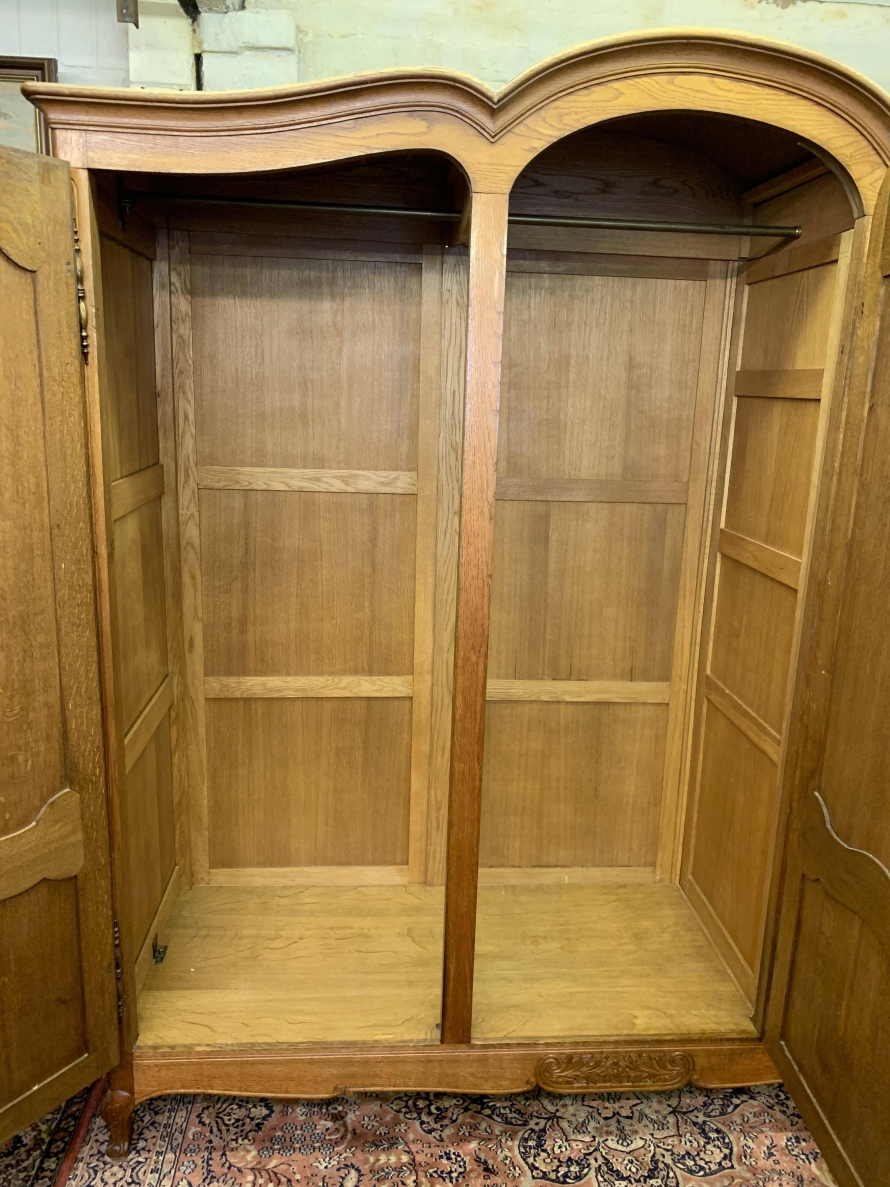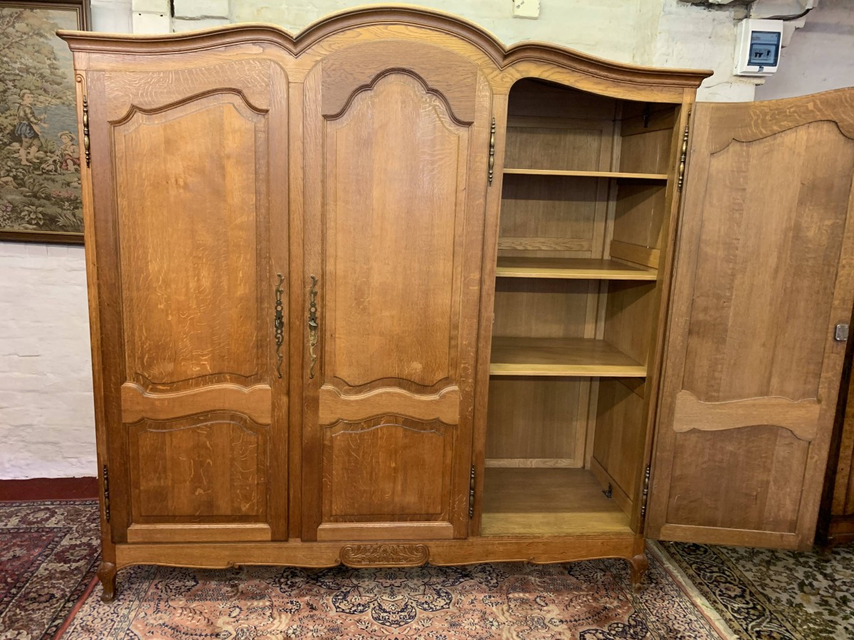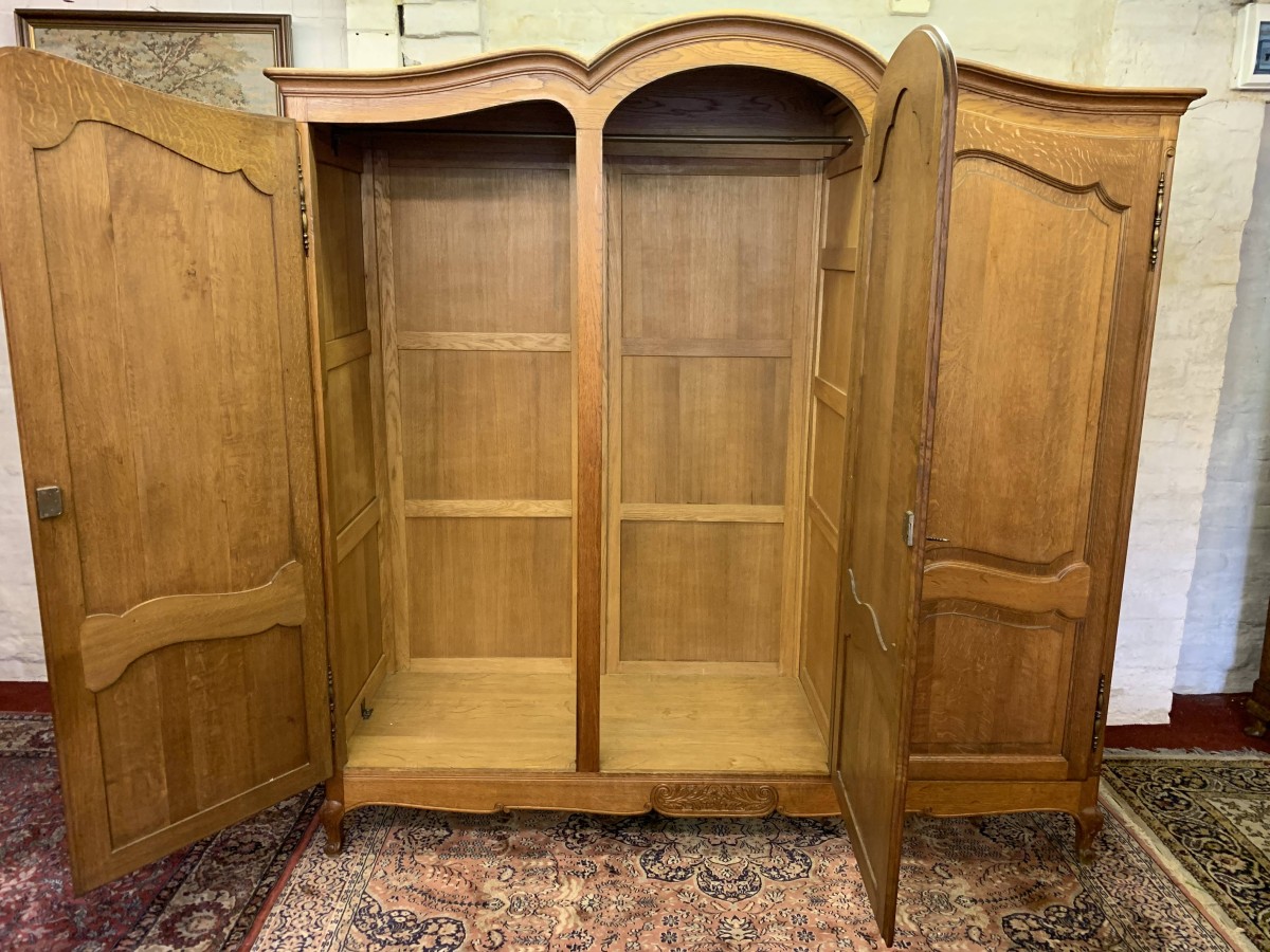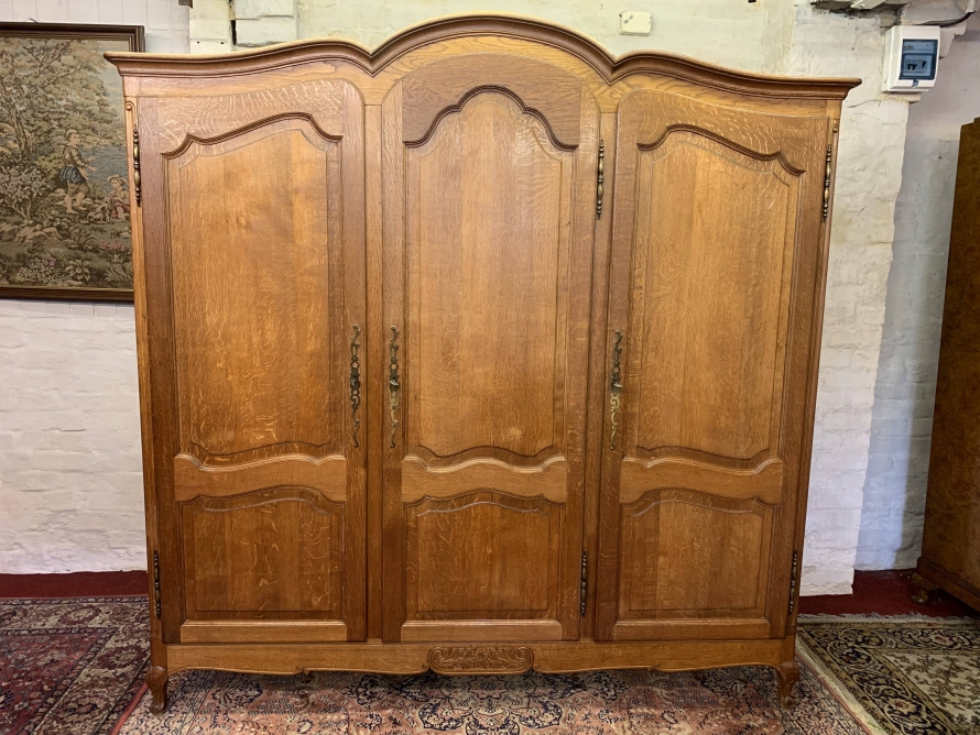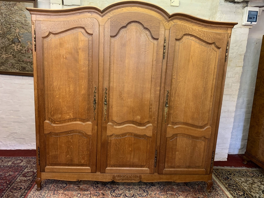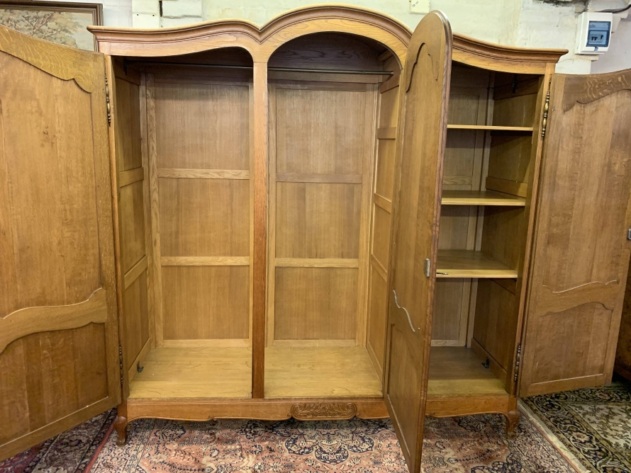 This elegant armoire is made in solid oak. The shaped top sits above three shaped recessed panelled lockable doors, each door having brass hinges, brass escutcheon is and key. The left-hand door and central door open to reveal a hanging rail. The right-hand door opens to reveal three removable shelves. Panelled sides, shaped skirt with decorative central carvings this stunning French armoire stands on two carved cabriole shaped legs to the front.