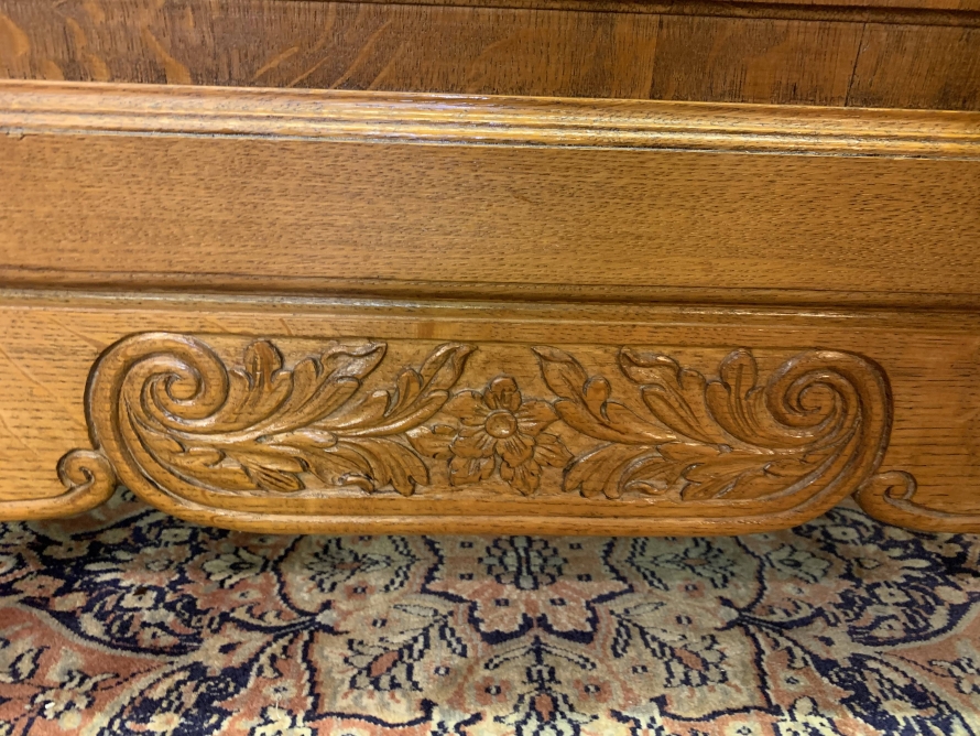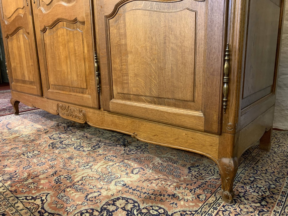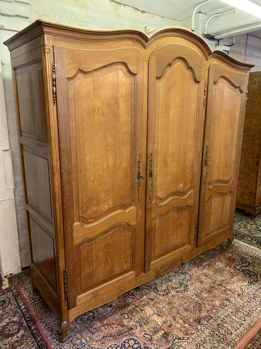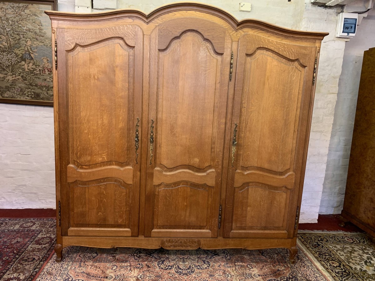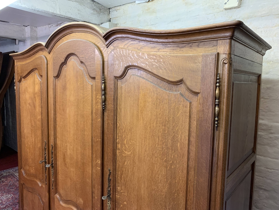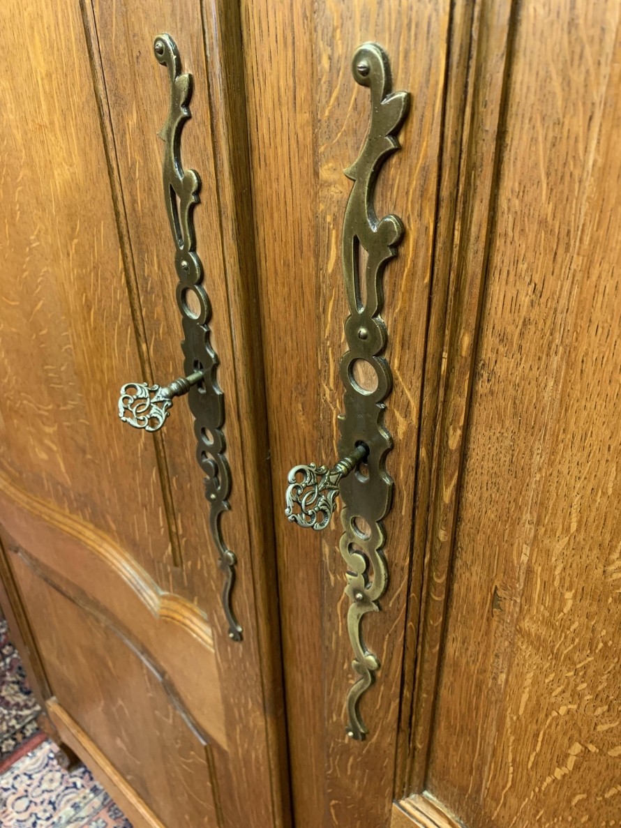 This elegant armoire is made in solid oak. The shaped top sits above three shaped recessed panelled lockable doors, each door having brass hinges, brass escutcheon is and key. The left-hand door and central door open to reveal a hanging rail. The right-hand door opens to reveal three removable shelves. Panelled sides, shaped skirt with decorative central carvings this stunning French armoire stands on two carved cabriole shaped legs to the front.