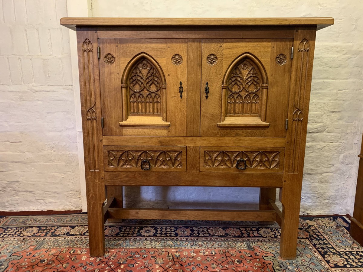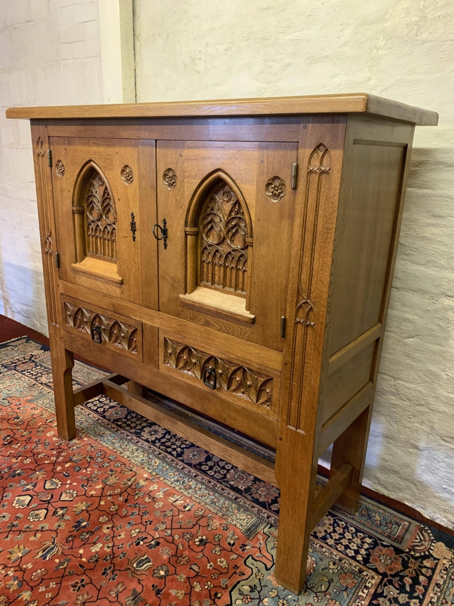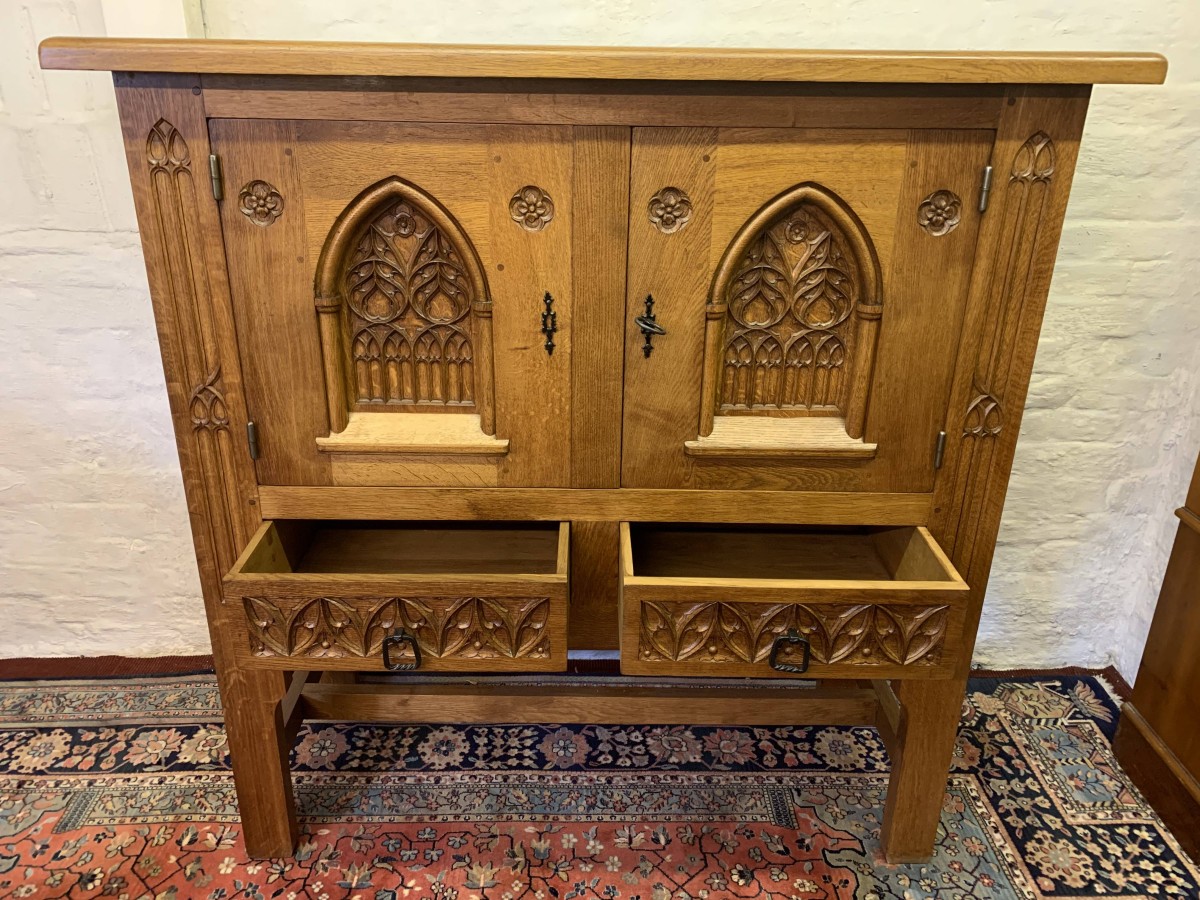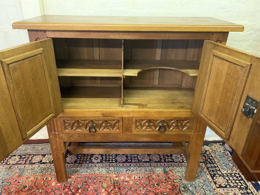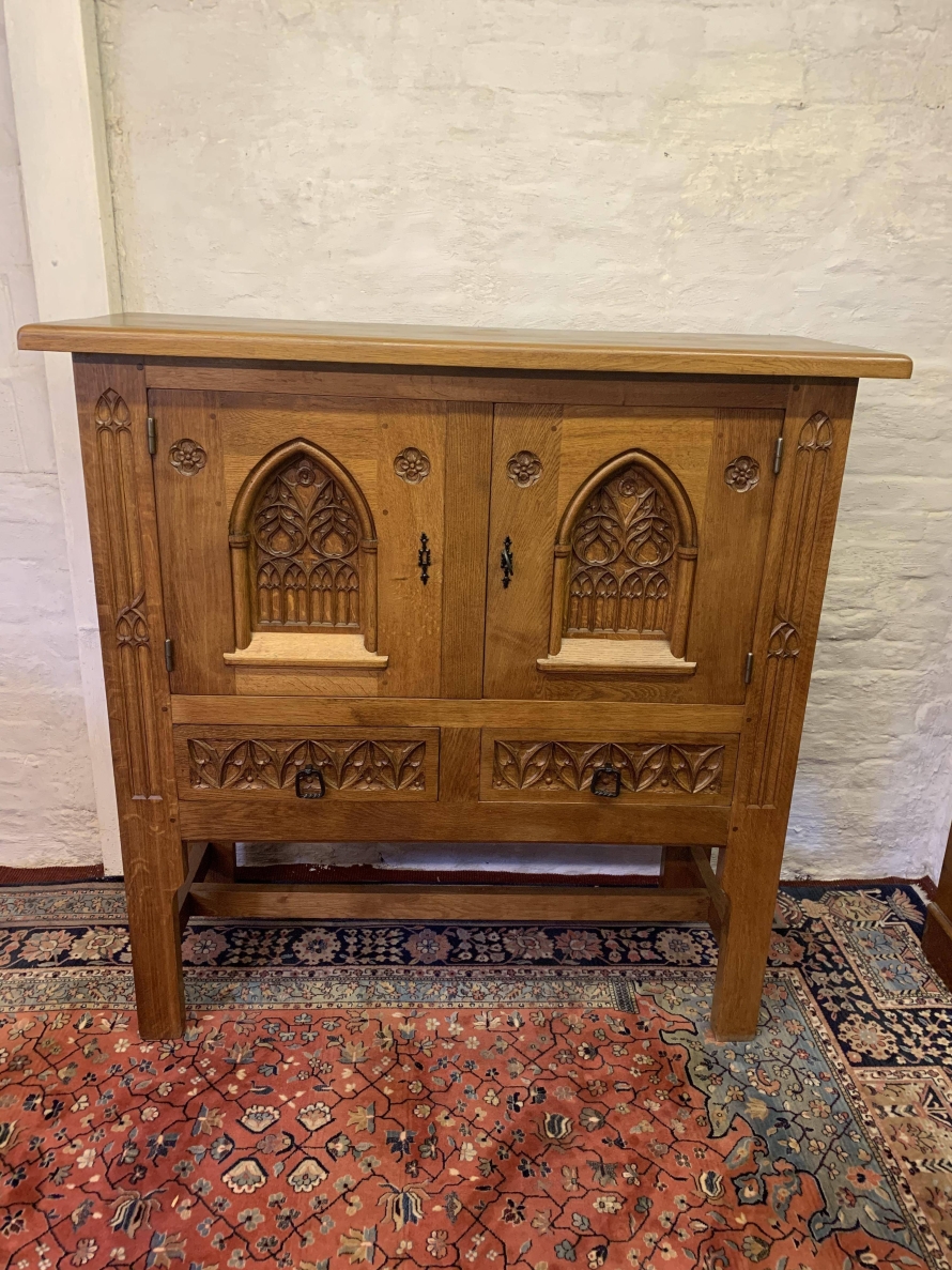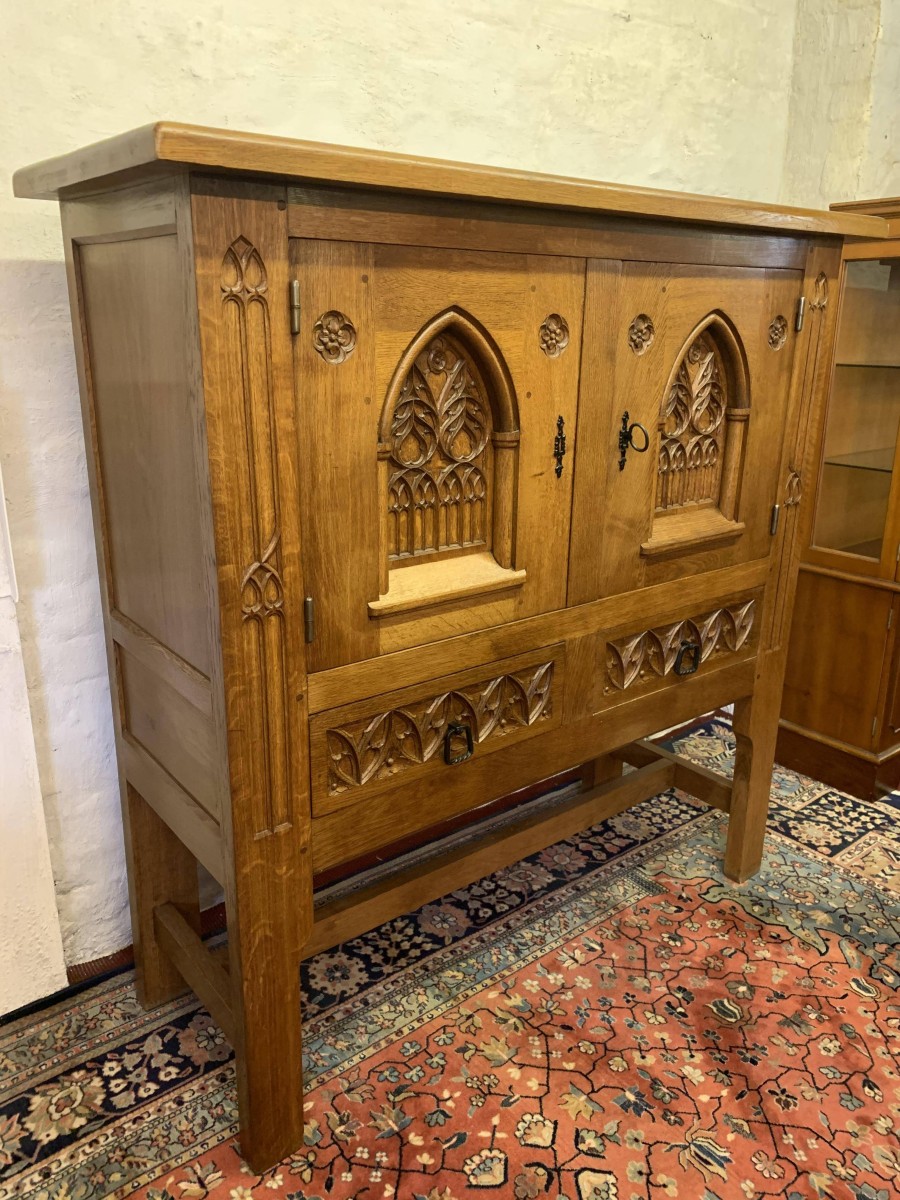 This super cabinet is made in exquisite carved oak. The oversailing top sits above a pair of lockable doors. Each door having stunning central arched carving with two small carvings to the sides. The doors have a substantial key and escutcheons. The doors open to reveal two removable shelves. Below are a pair of ornately carved drawers, each drawer having mediaeval style drop handle. Flowing carving to the sides, this outstanding quality solid oak cabinet stands on four legs with stretcher supports.