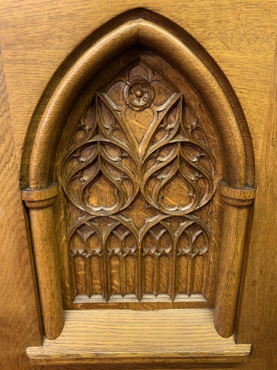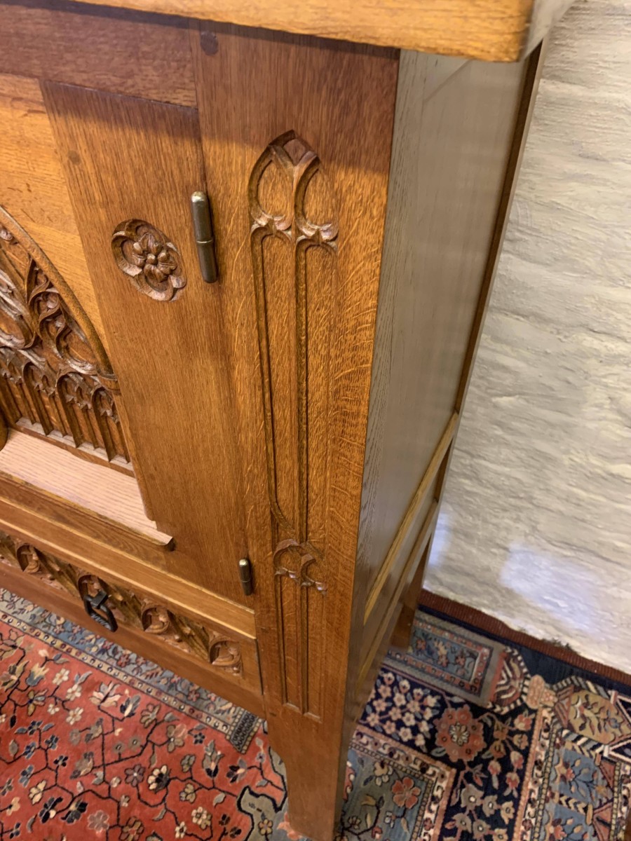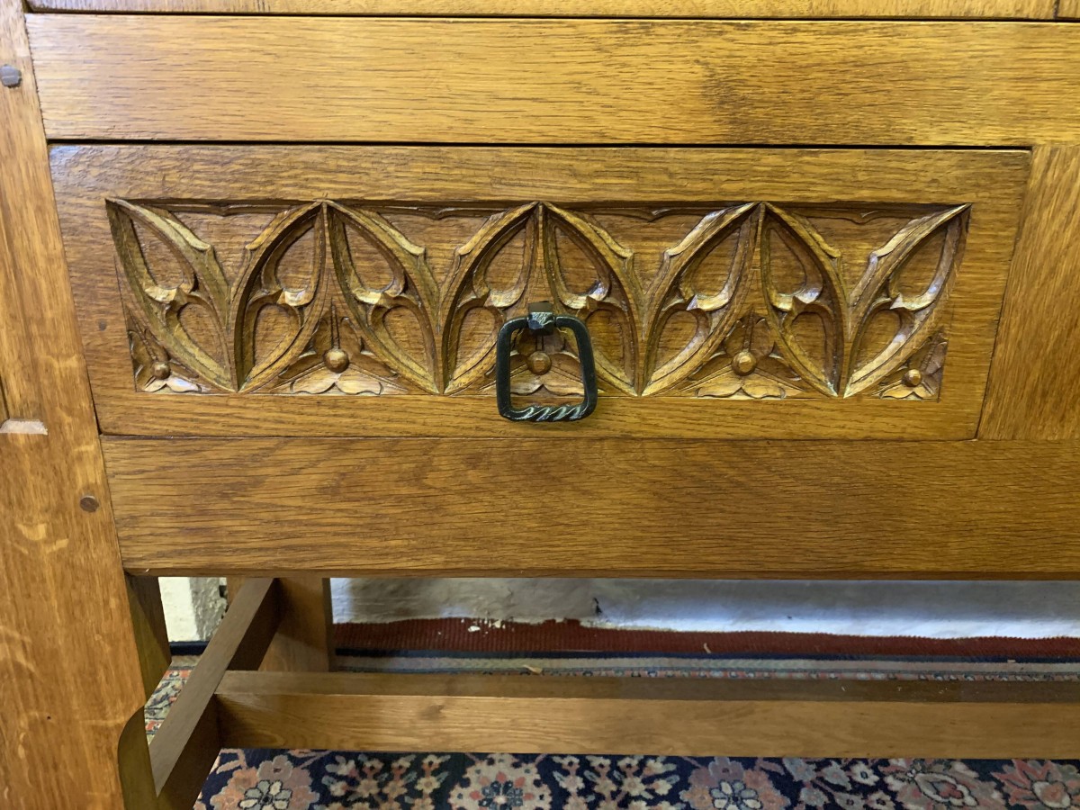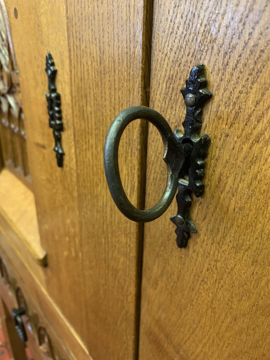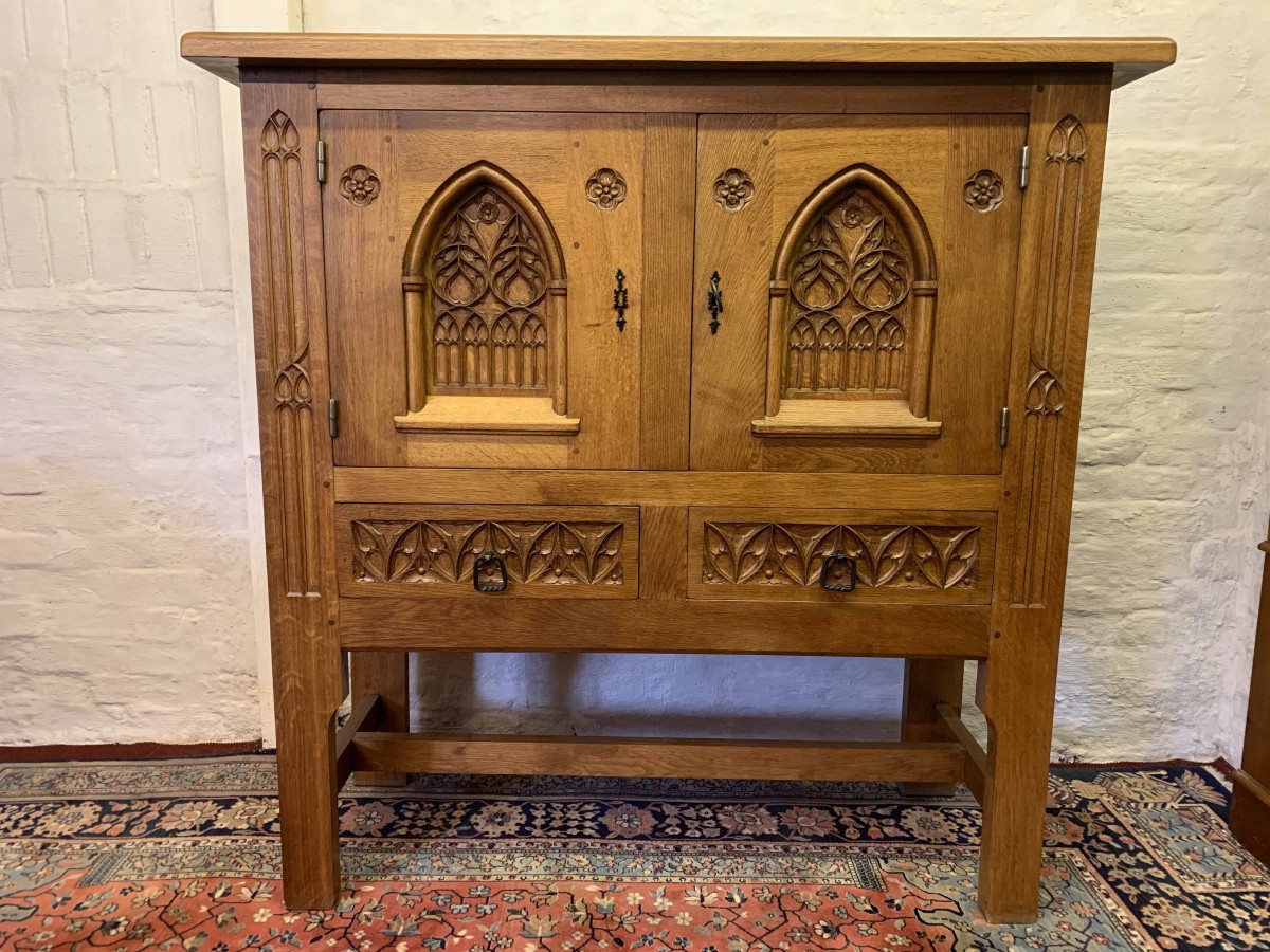 This super cabinet is made in exquisite carved oak. The oversailing top sits above a pair of lockable doors. Each door having stunning central arched carving with two small carvings to the sides. The doors have a substantial key and escutcheons. The doors open to reveal two removable shelves. Below are a pair of ornately carved drawers, each drawer having mediaeval style drop handle. Flowing carving to the sides, this outstanding quality solid oak cabinet stands on four legs with stretcher supports.