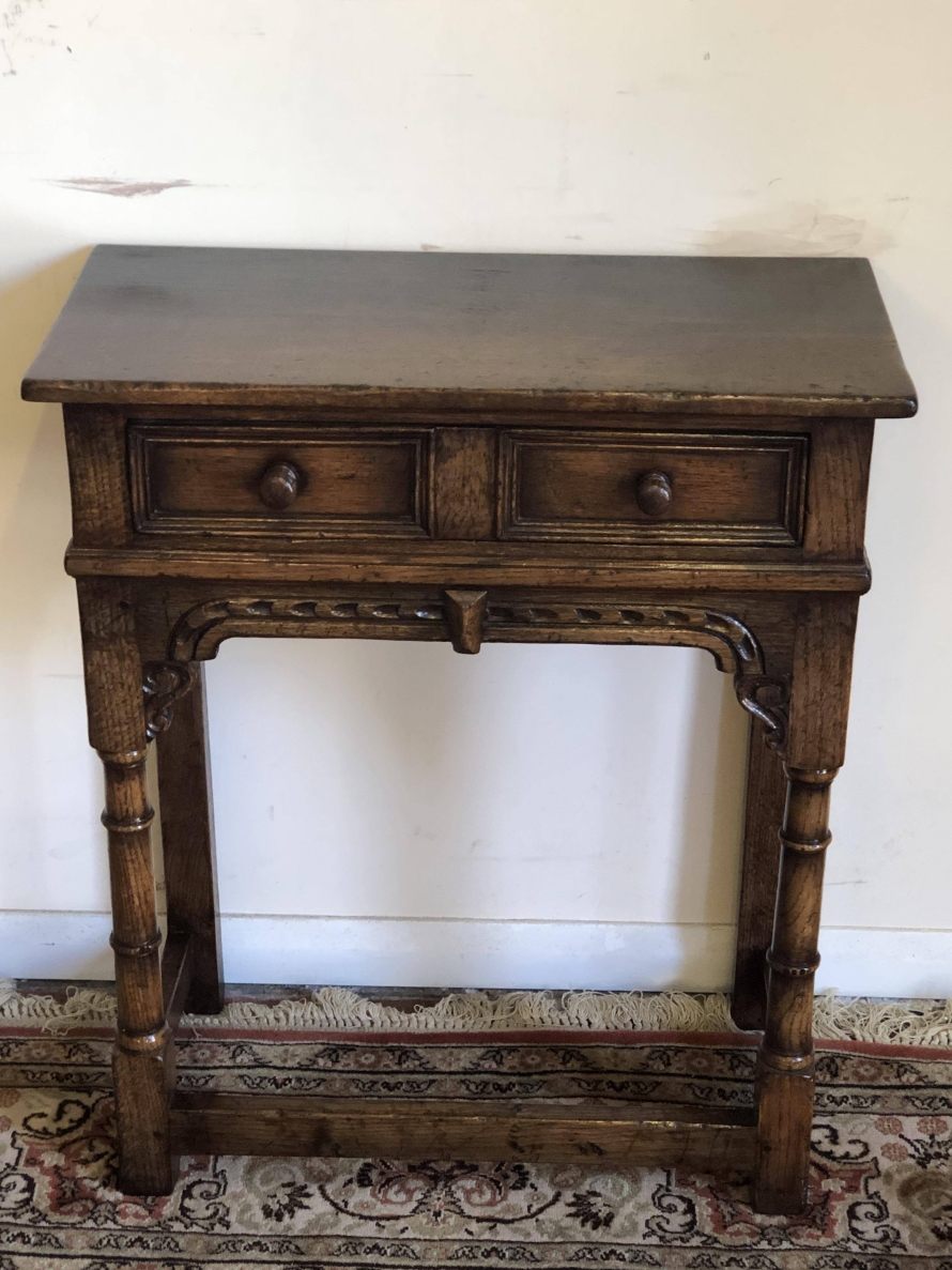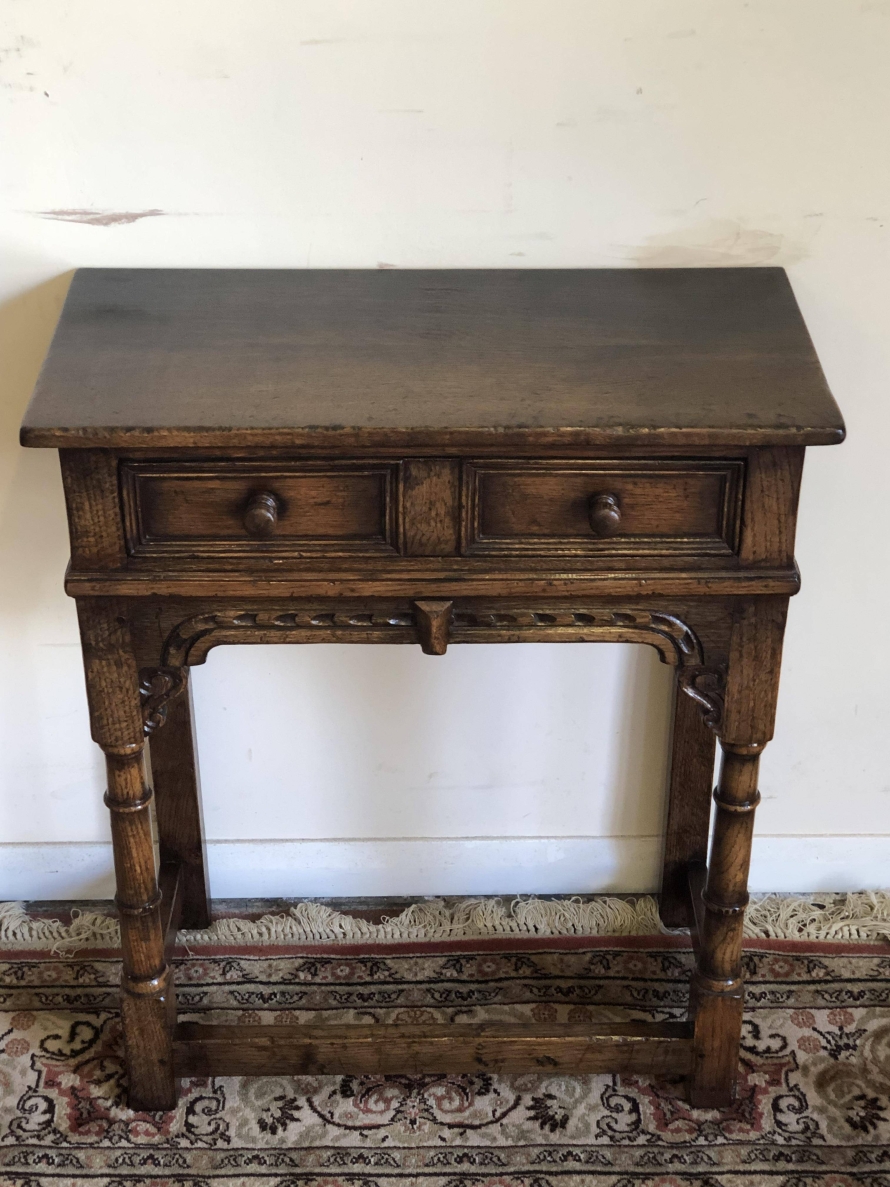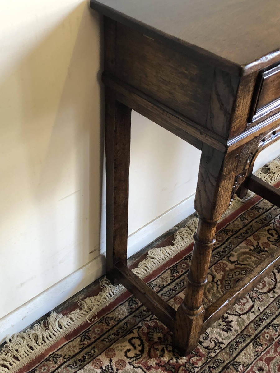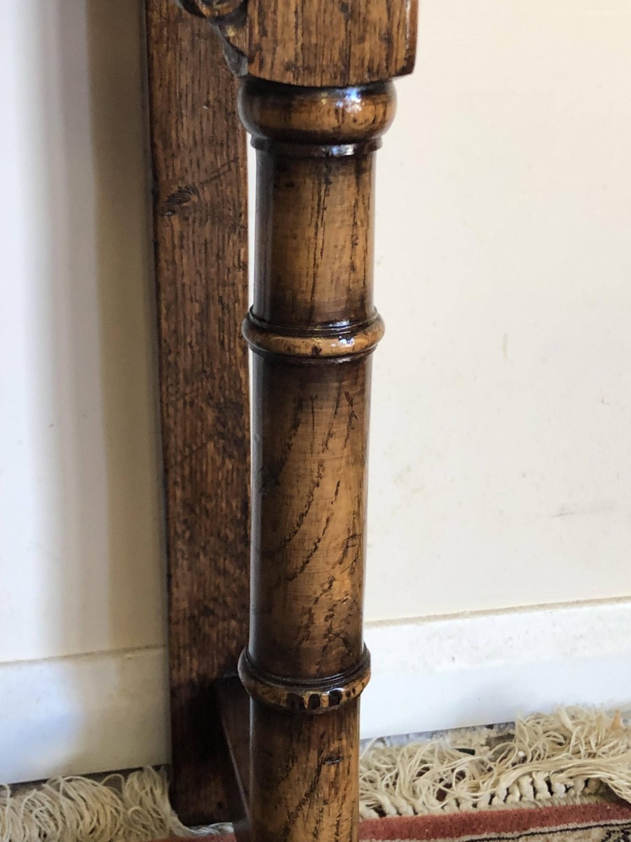 A gorgeous hall table which oozes quality and style. The over sailing top sits above a drawer, the drawer having two turned handles, chip carved arch below with a central keystone.The hall table stands on traditional ring turned legs with front and side stretchers. Please note the item is made entirely of English oak.