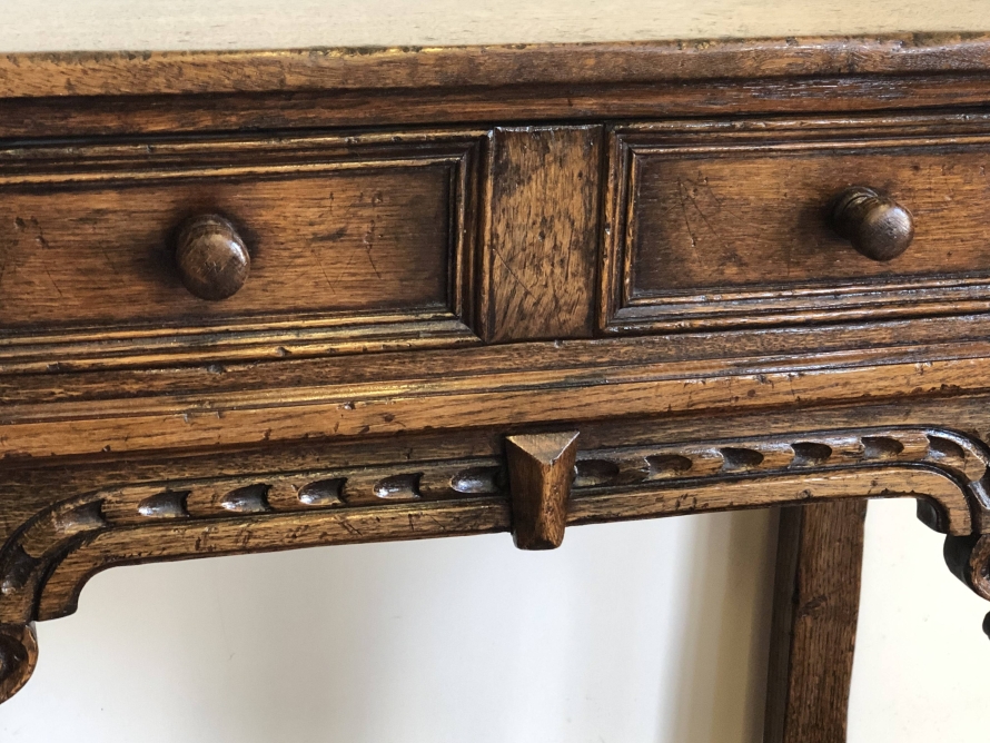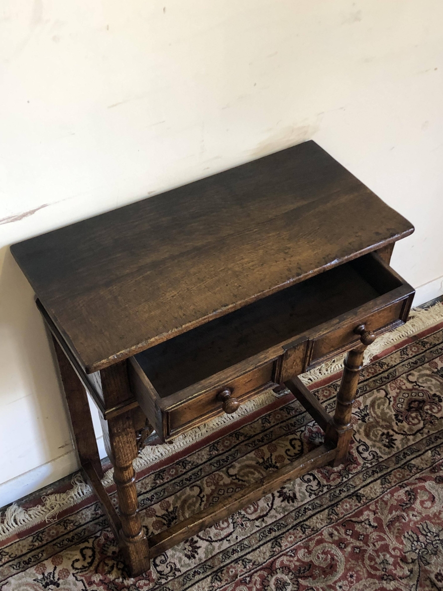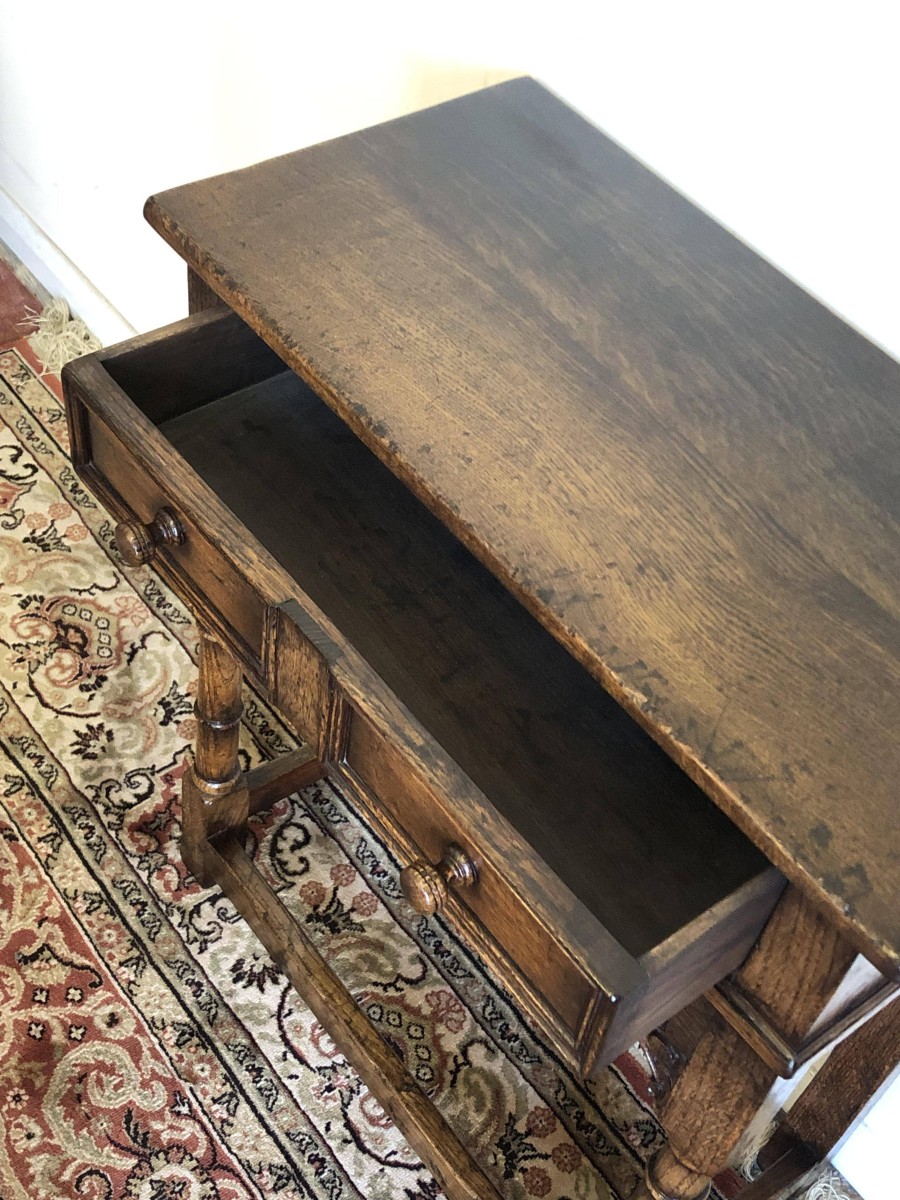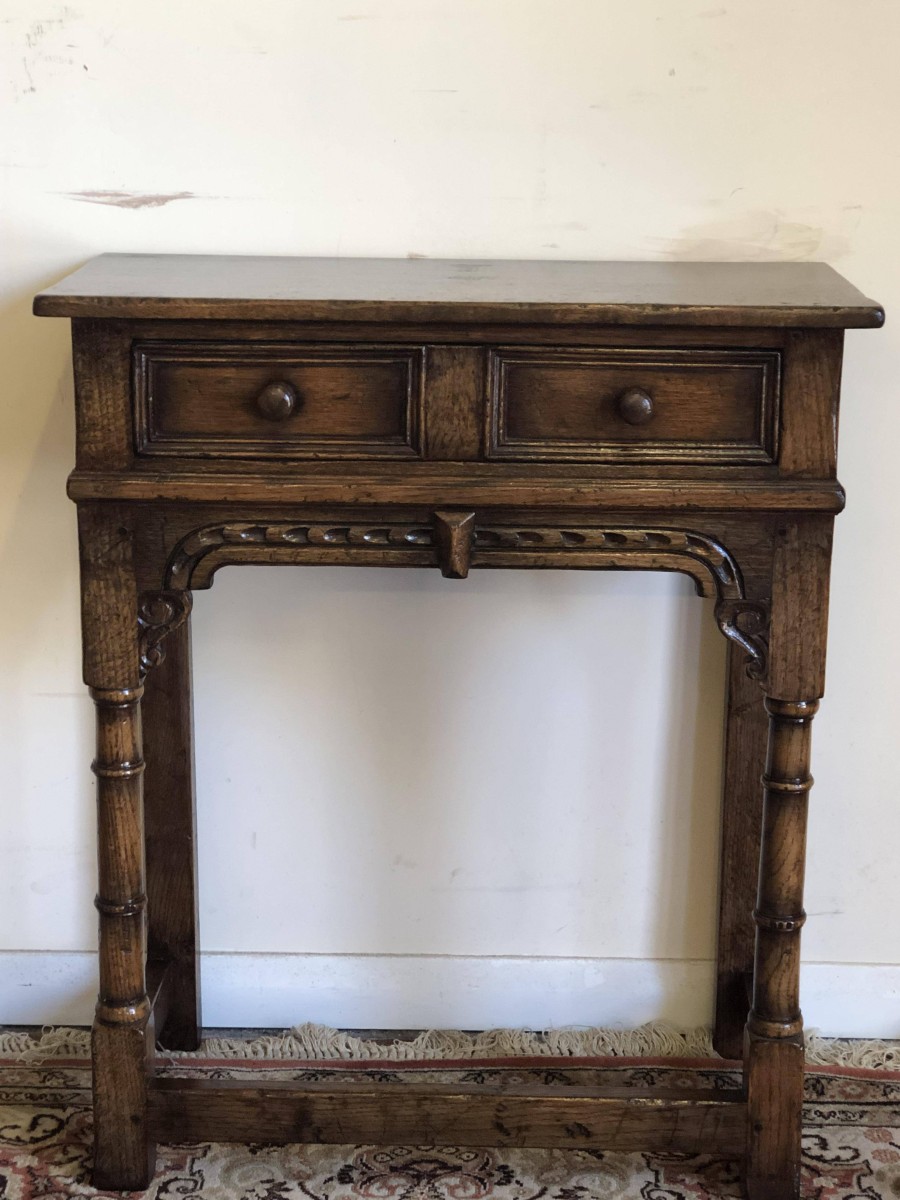 A gorgeous hall table which oozes quality and style. The over sailing top sits above a drawer, the drawer having two turned handles, chip carved arch below with a central keystone.The hall table stands on traditional ring turned legs with front and side stretchers. Please note the item is made entirely of English oak.