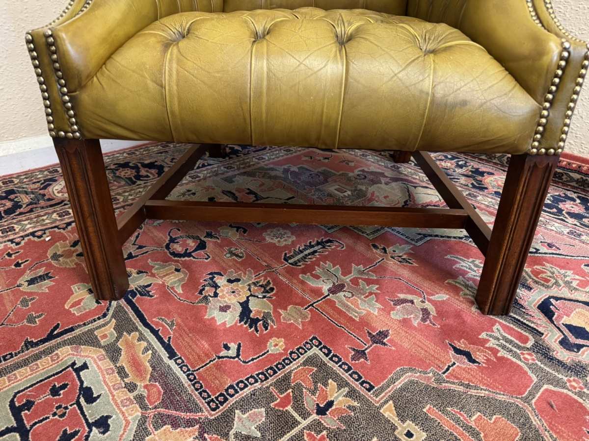 This stunning chair oozes quality and style. The chair has a deep buttoned back, wing arms and seat, all with brass studded decoration. Standing on four legs with stretcher supports. A handsome chair.