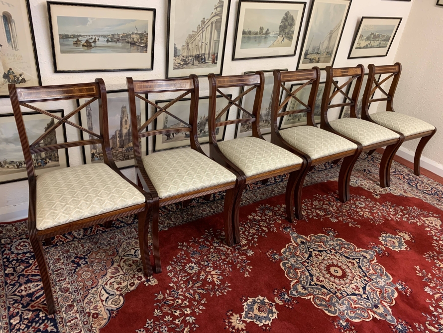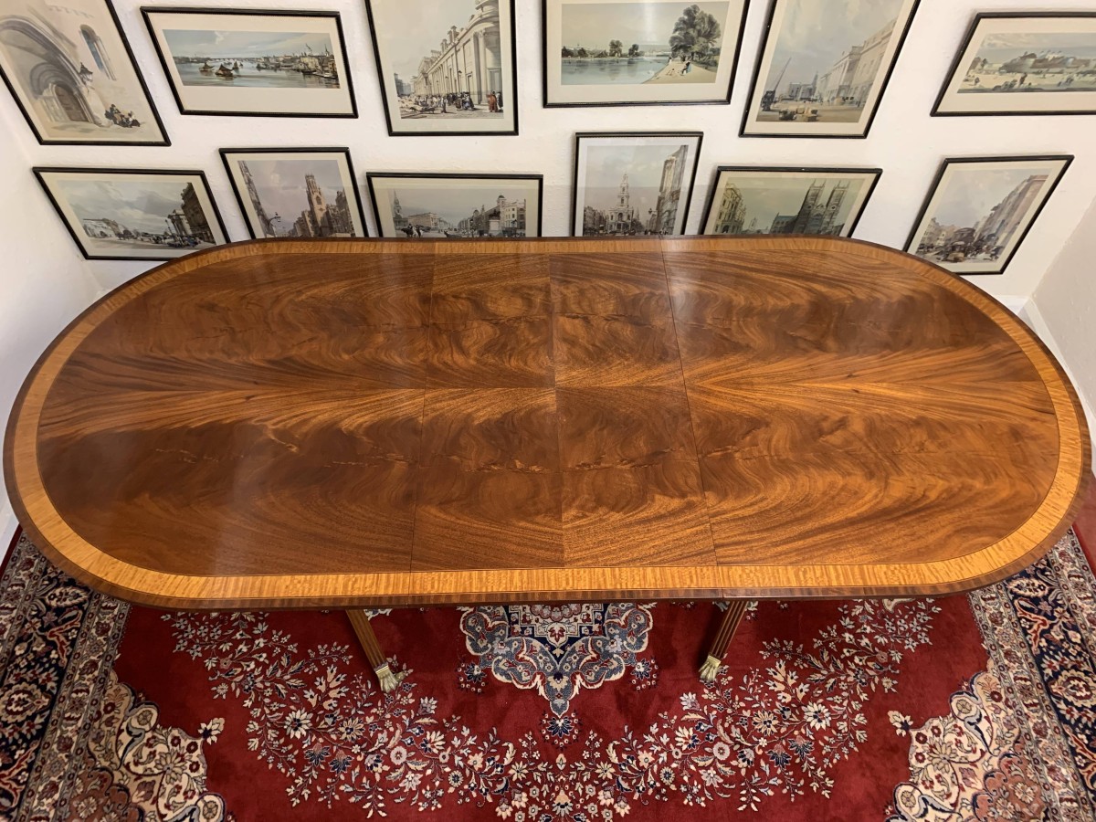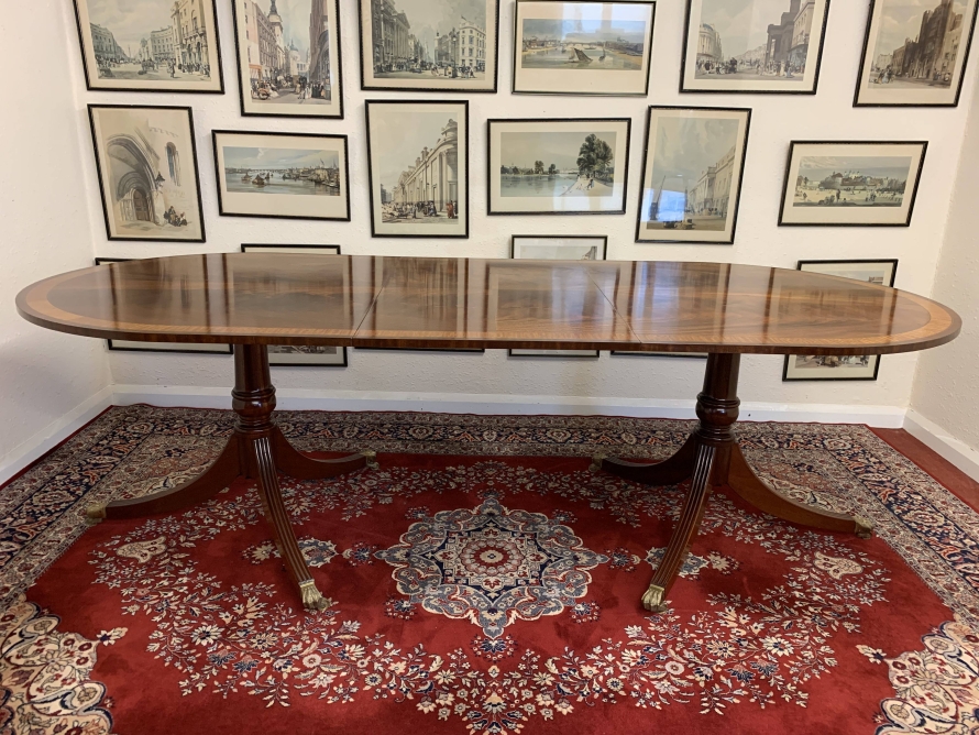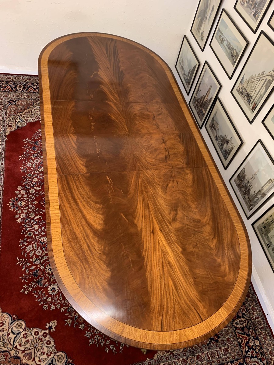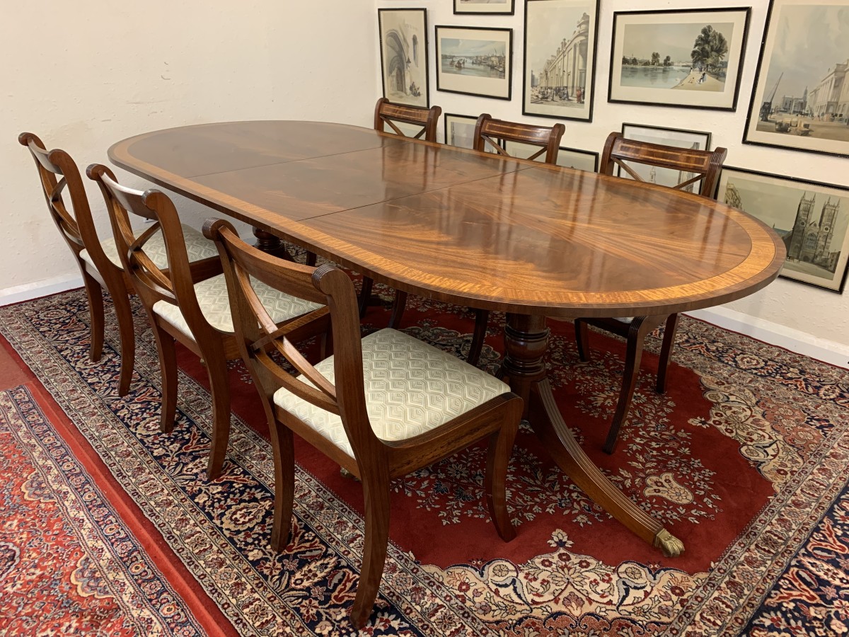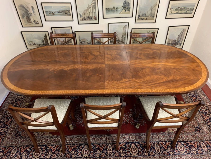 The glorious table is made of solid mahoagny and has a satinwood crossbanded edging with ebony string inlaid piping. Please note that the patina of the mahogany and satinwood is striking. The table stands on two elegant shaped pedestals, each pedestal has three sweeping reeded legs, each leg has brass “paw” feet and sit on brass casters. The six matching chairs have a satinwood inlaid back rail with a cross stretcher back rest. The chairs have a removable cushioned seat pad and reeded decoration throughout.