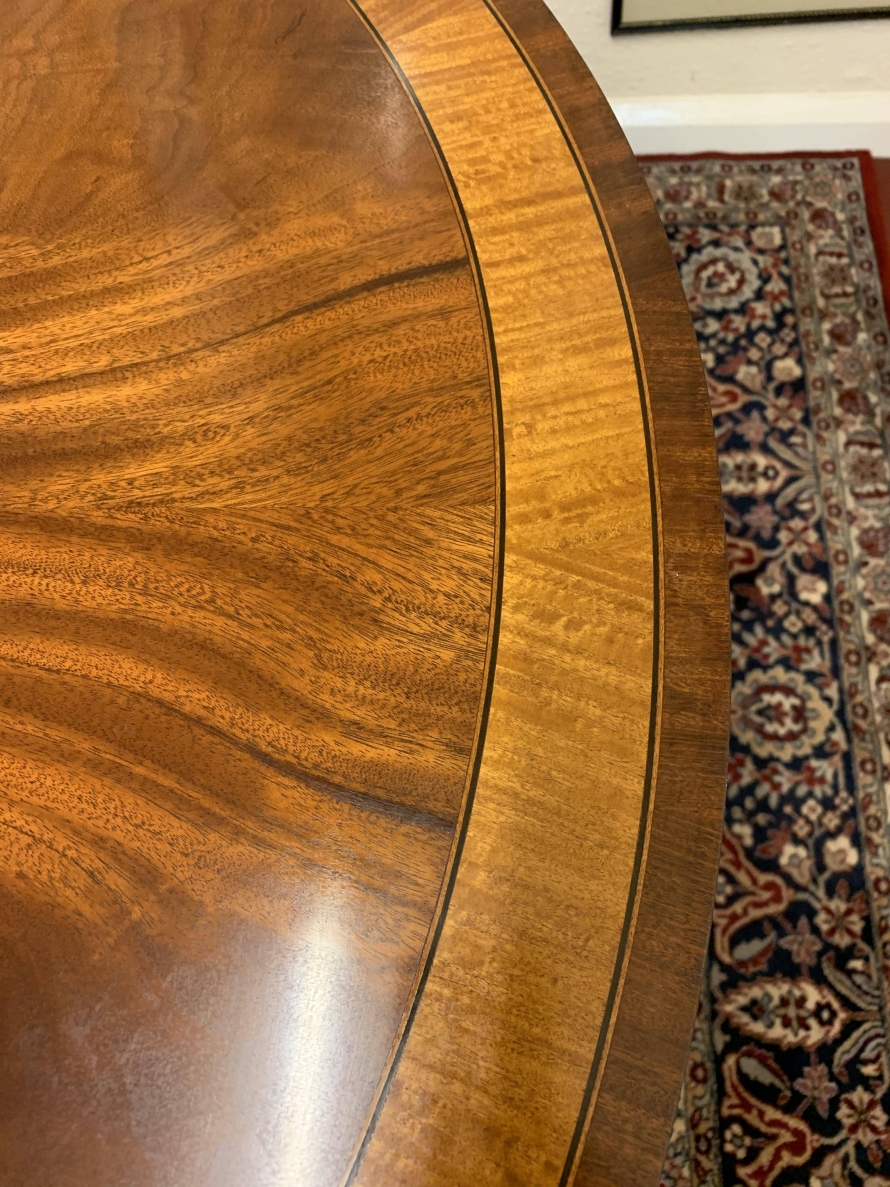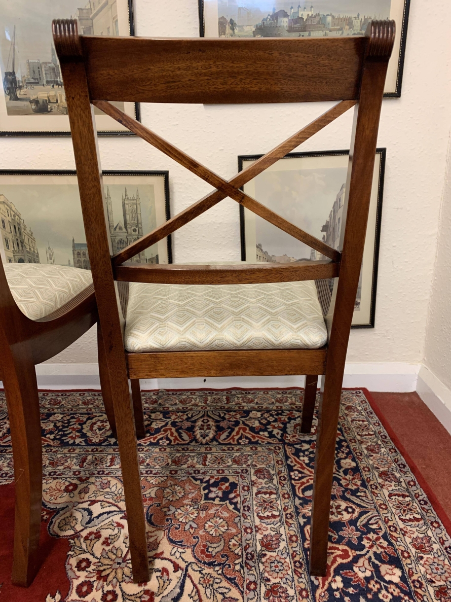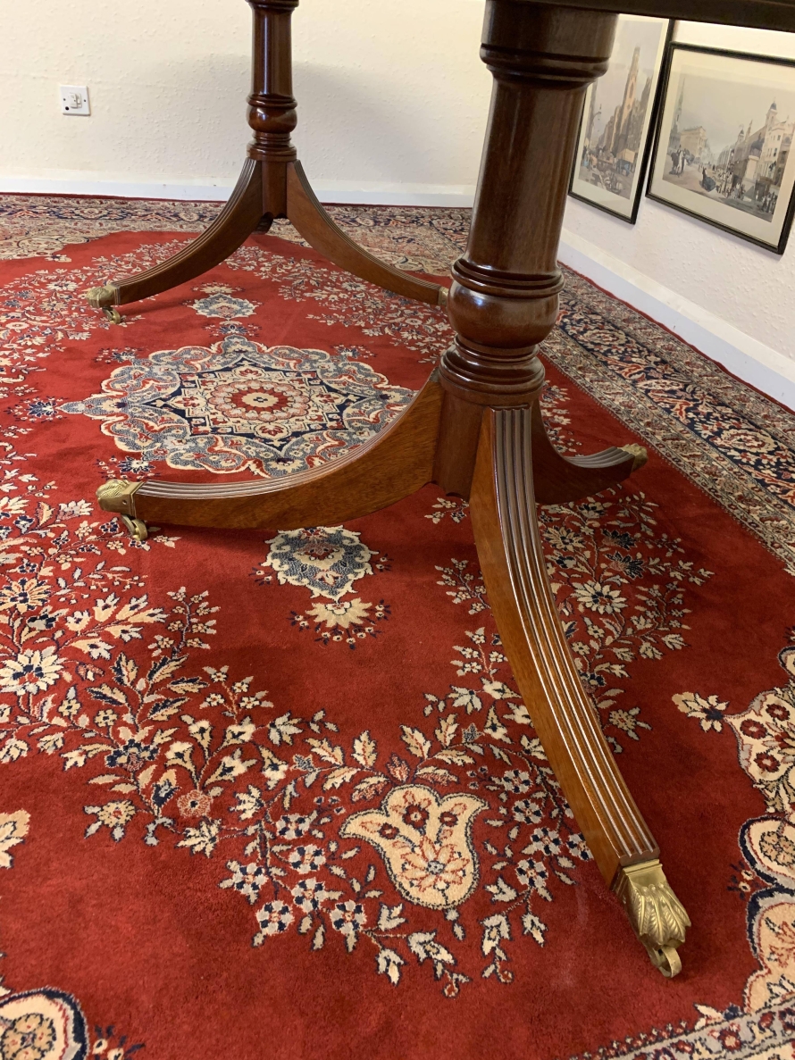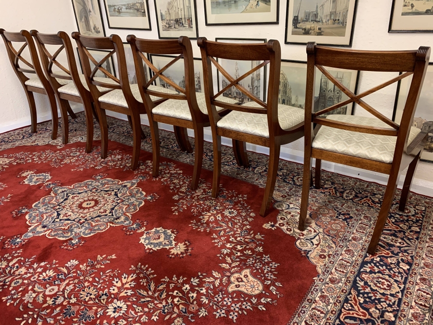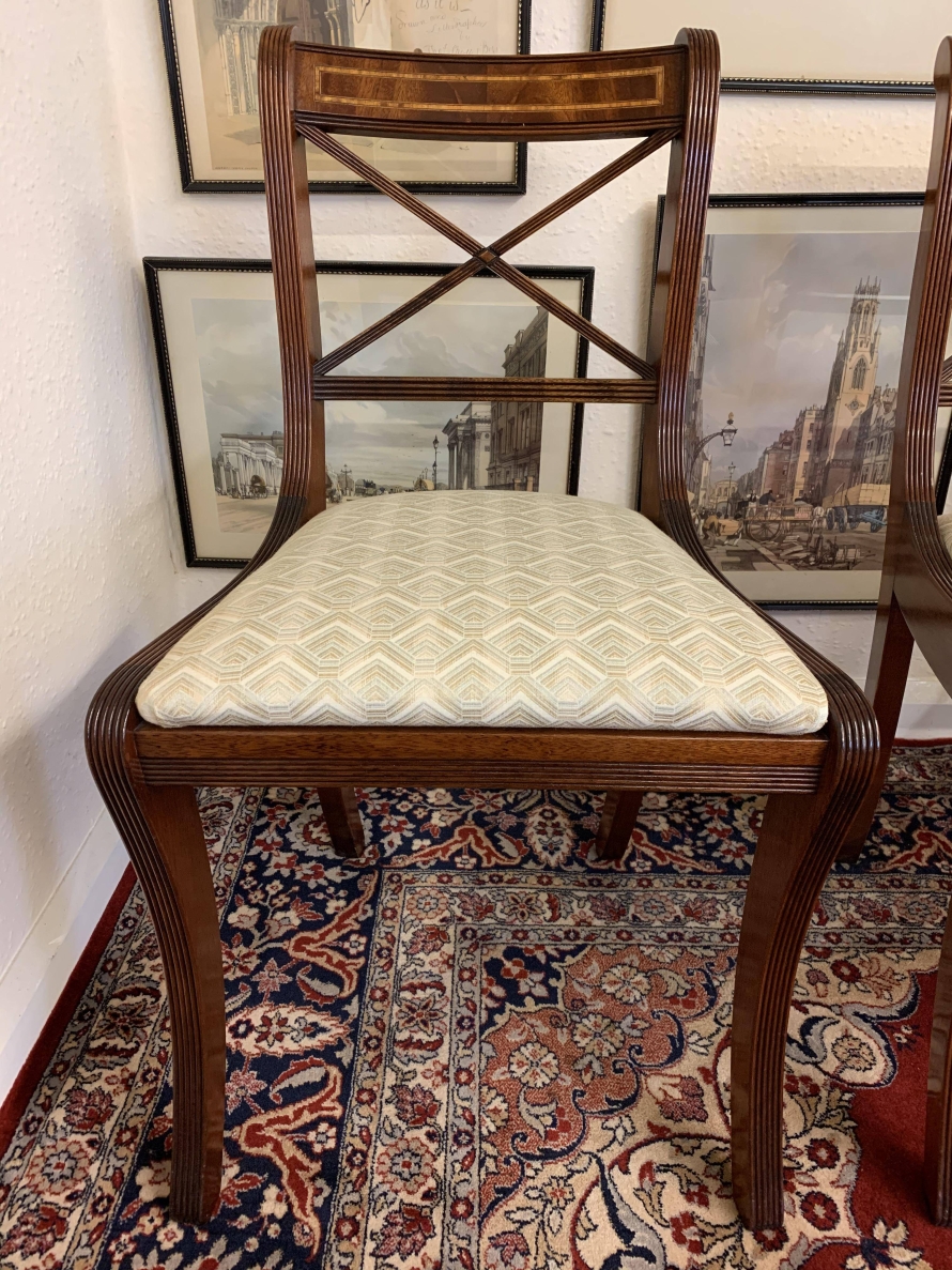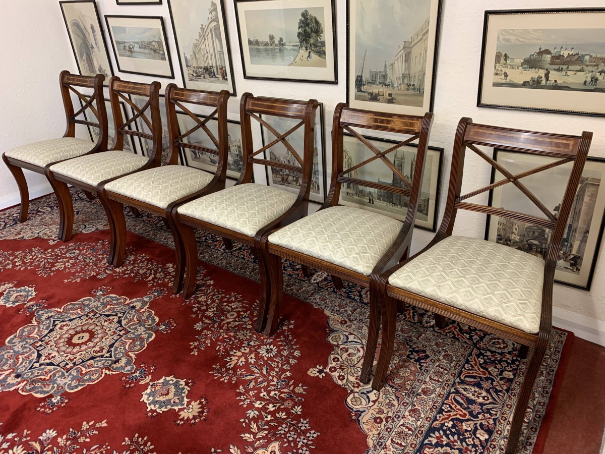 The glorious table is made of solid mahoagny and has a satinwood crossbanded edging with ebony string inlaid piping. Please note that the patina of the mahogany and satinwood is striking. The table stands on two elegant shaped pedestals, each pedestal has three sweeping reeded legs, each leg has brass “paw” feet and sit on brass casters. The six matching chairs have a satinwood inlaid back rail with a cross stretcher back rest. The chairs have a removable cushioned seat pad and reeded decoration throughout.