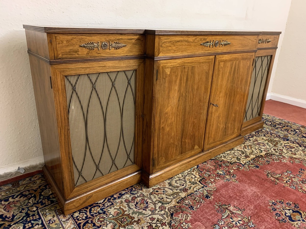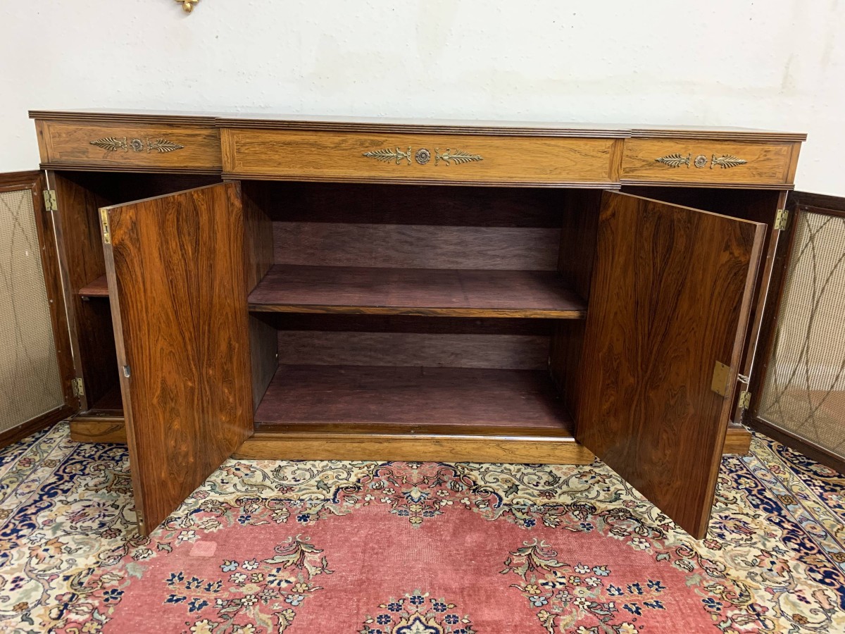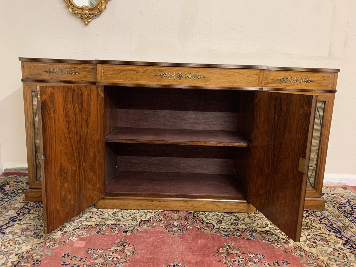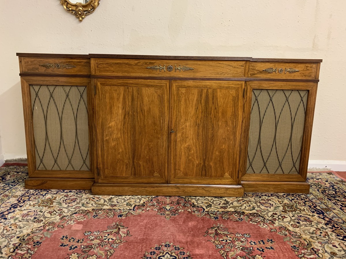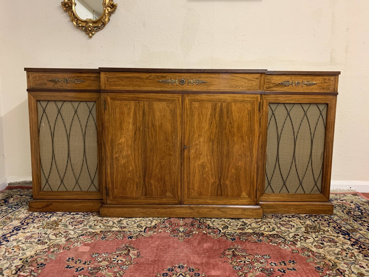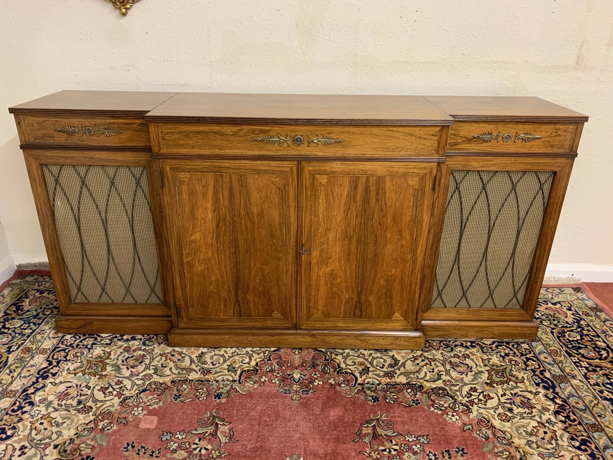 The oversailing top has string inlay decoration and a reeded front. Below are four lockable doors, the two central brakefront doors have string inlay decoration and an ormolu mount above. Flanked by a pair of grilled doors which also have string inlay decoration and ormolu mounts above the pair of central doors open to reveal a fixed shelf, the grilled doors open to reveal a removable shelf. The credenza has a platform plinth base.