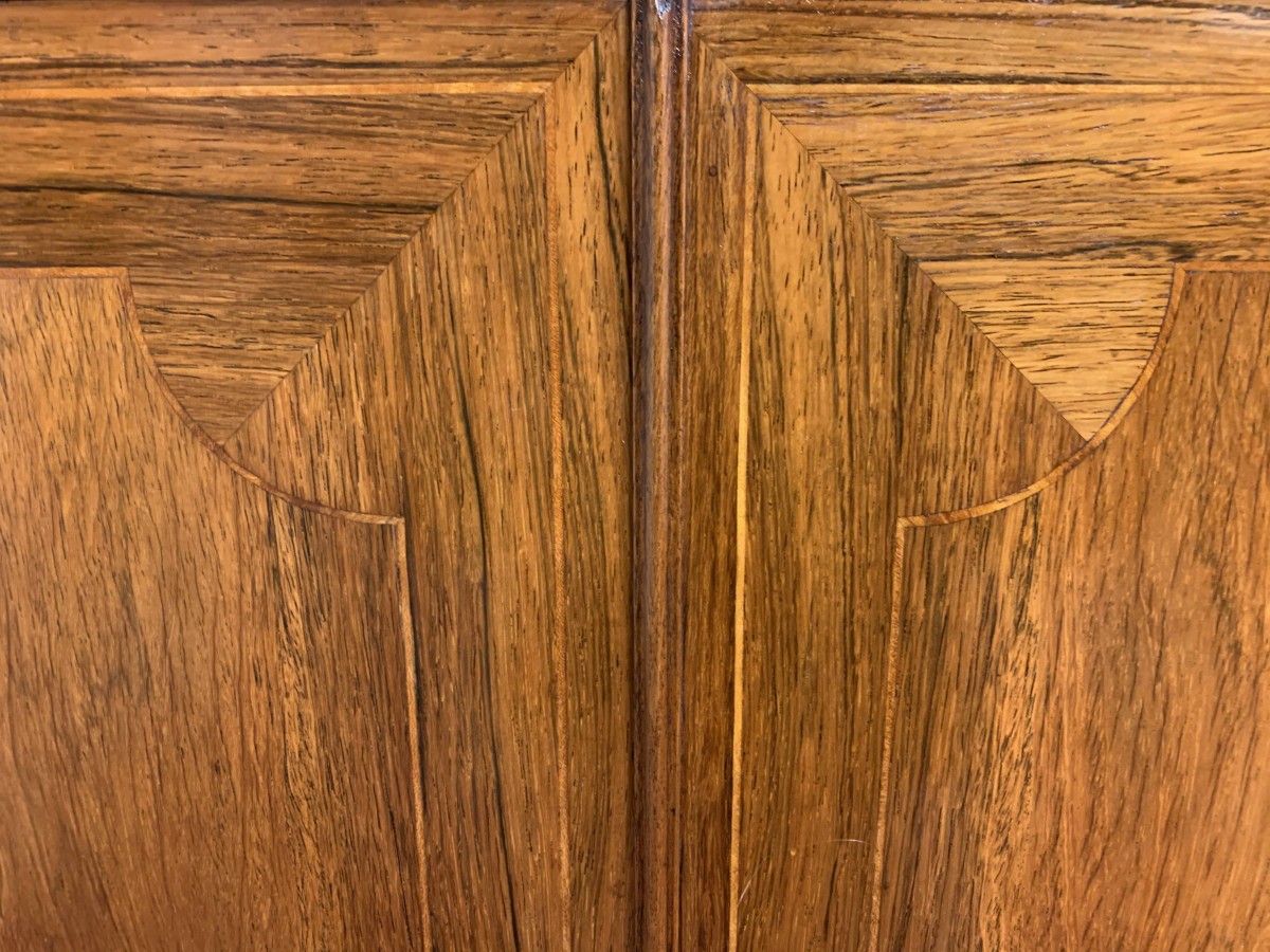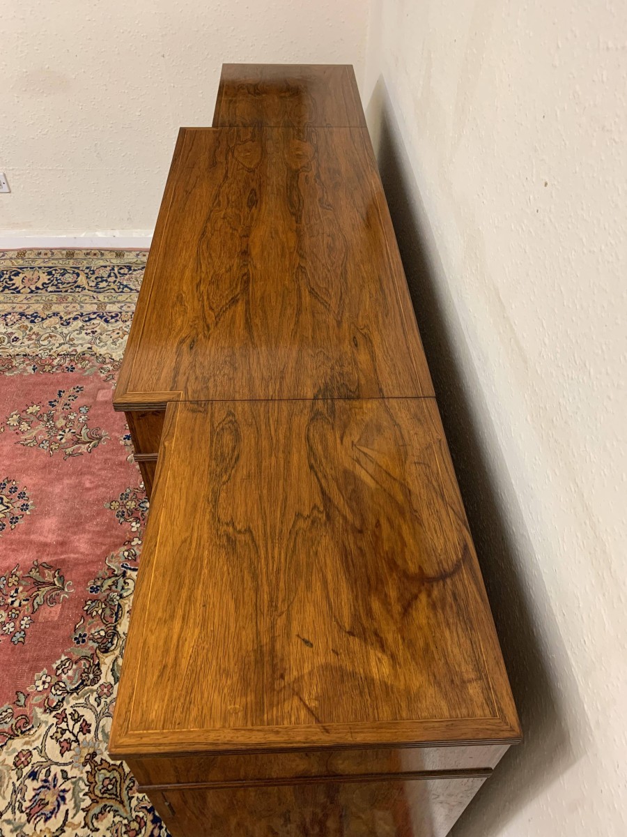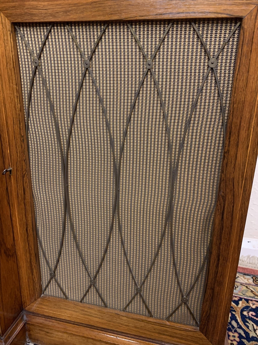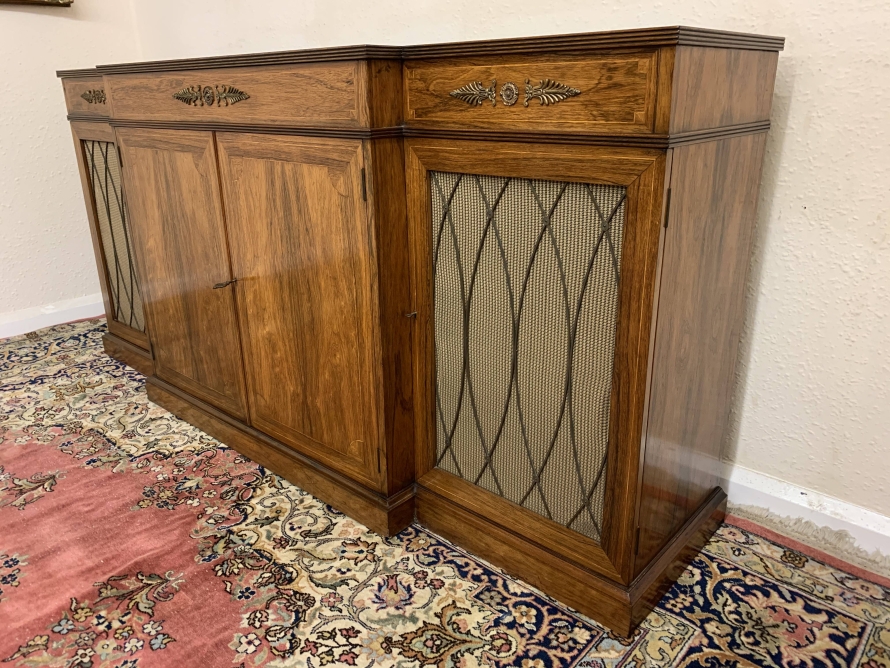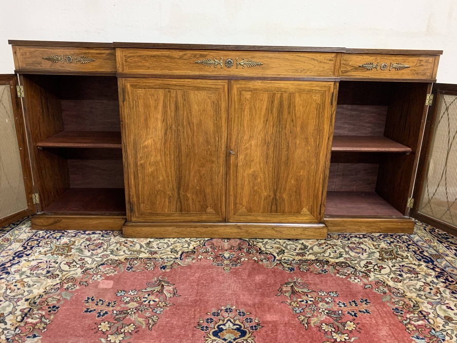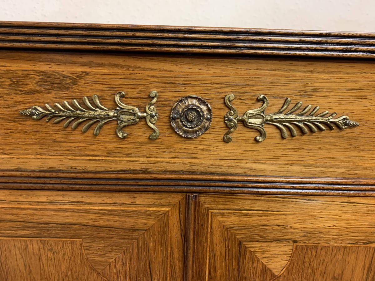 The oversailing top has string inlay decoration and a reeded front. Below are four lockable doors, the two central brakefront doors have string inlay decoration and an ormolu mount above. Flanked by a pair of grilled doors which also have string inlay decoration and ormolu mounts above the pair of central doors open to reveal a fixed shelf, the grilled doors open to reveal a removable shelf. The credenza has a platform plinth base.