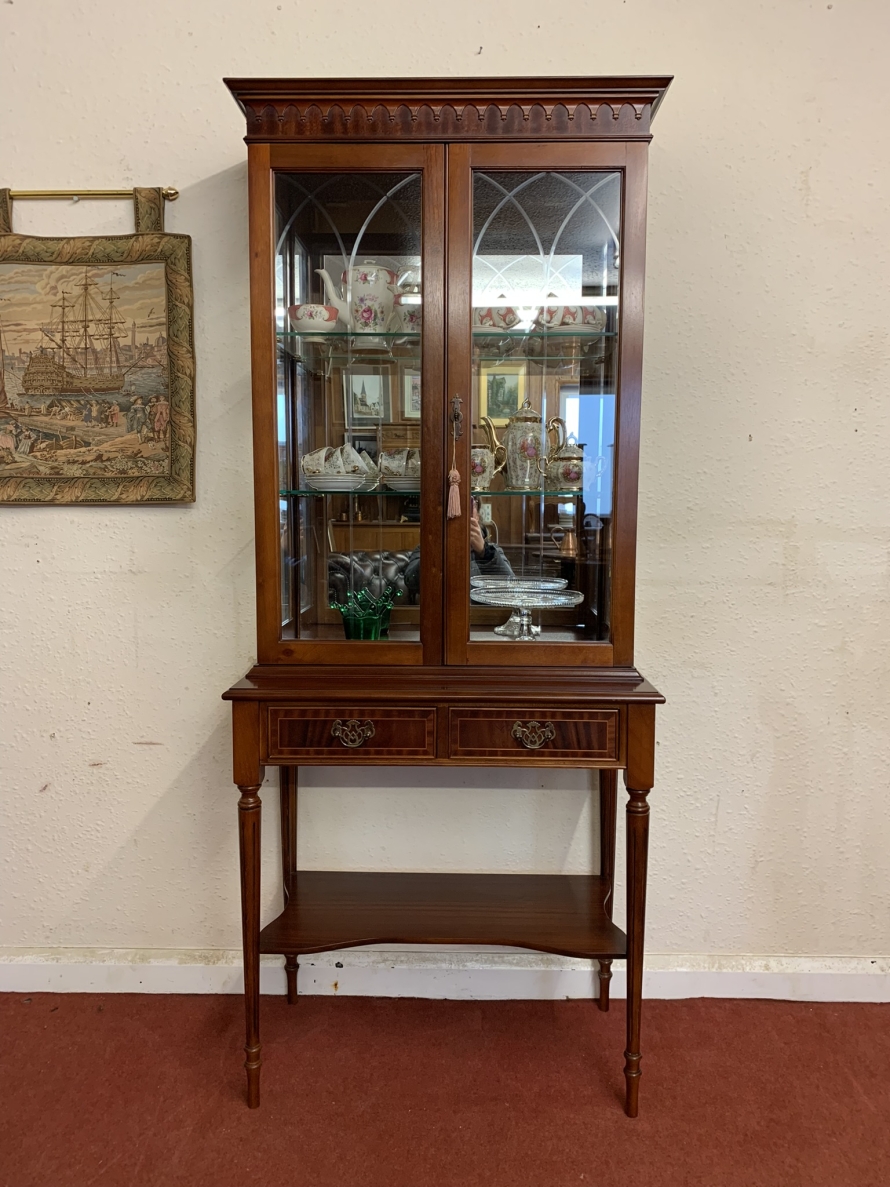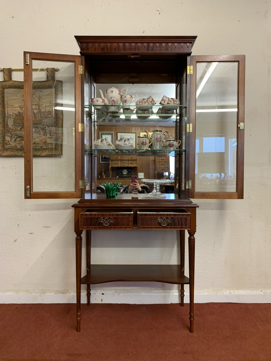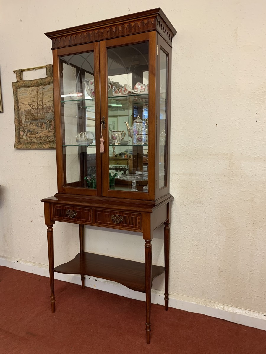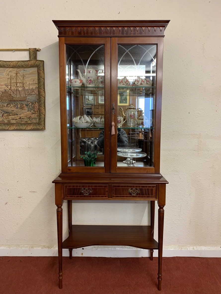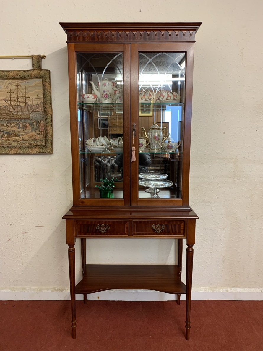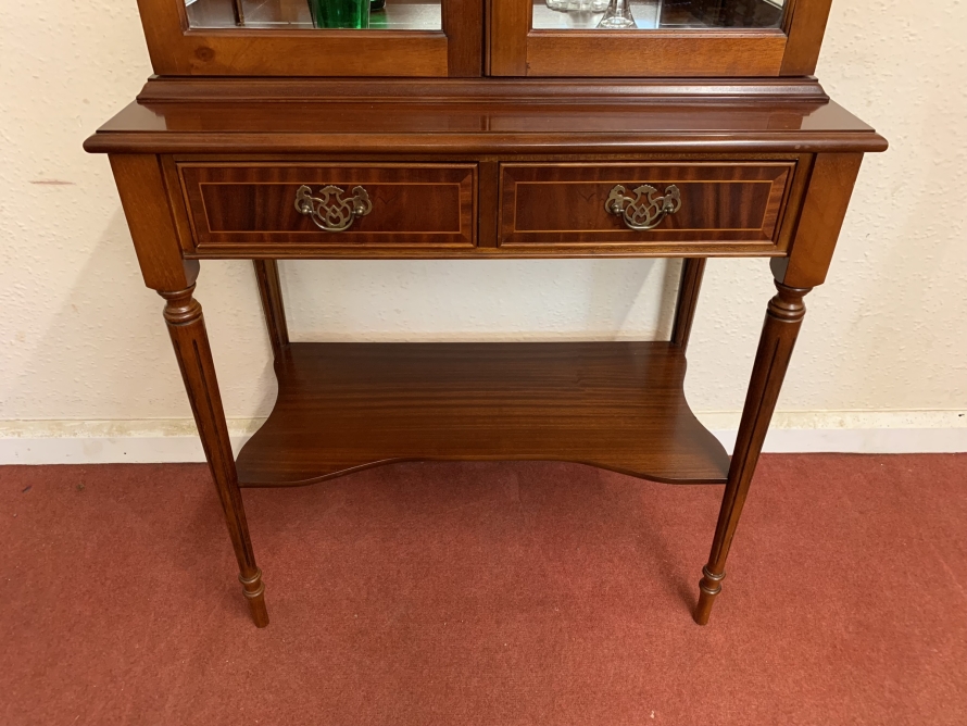 The oversailing top having carved decoration below. The pair of lockable etched glass doors open to reveal two glass display shelves. This top section having glass sides. Below are a pair of inlaid drawers, each drawer having a decorative brass handle. Shelf below, this excellent mahogany cabinet which is in excellent condition sits on four fluted legs.