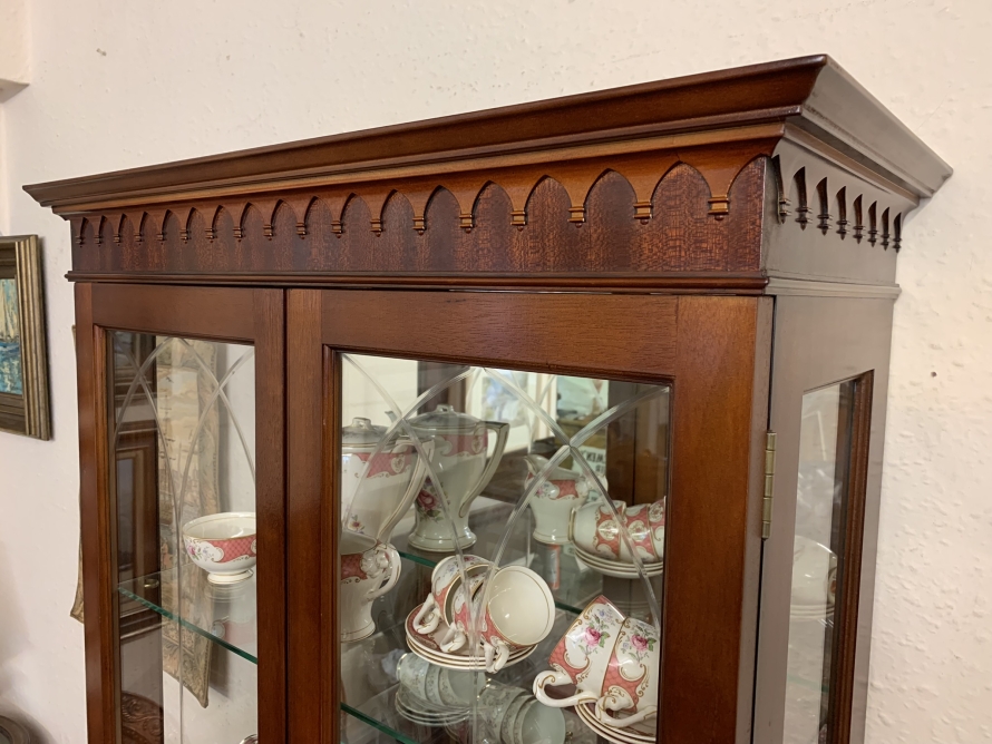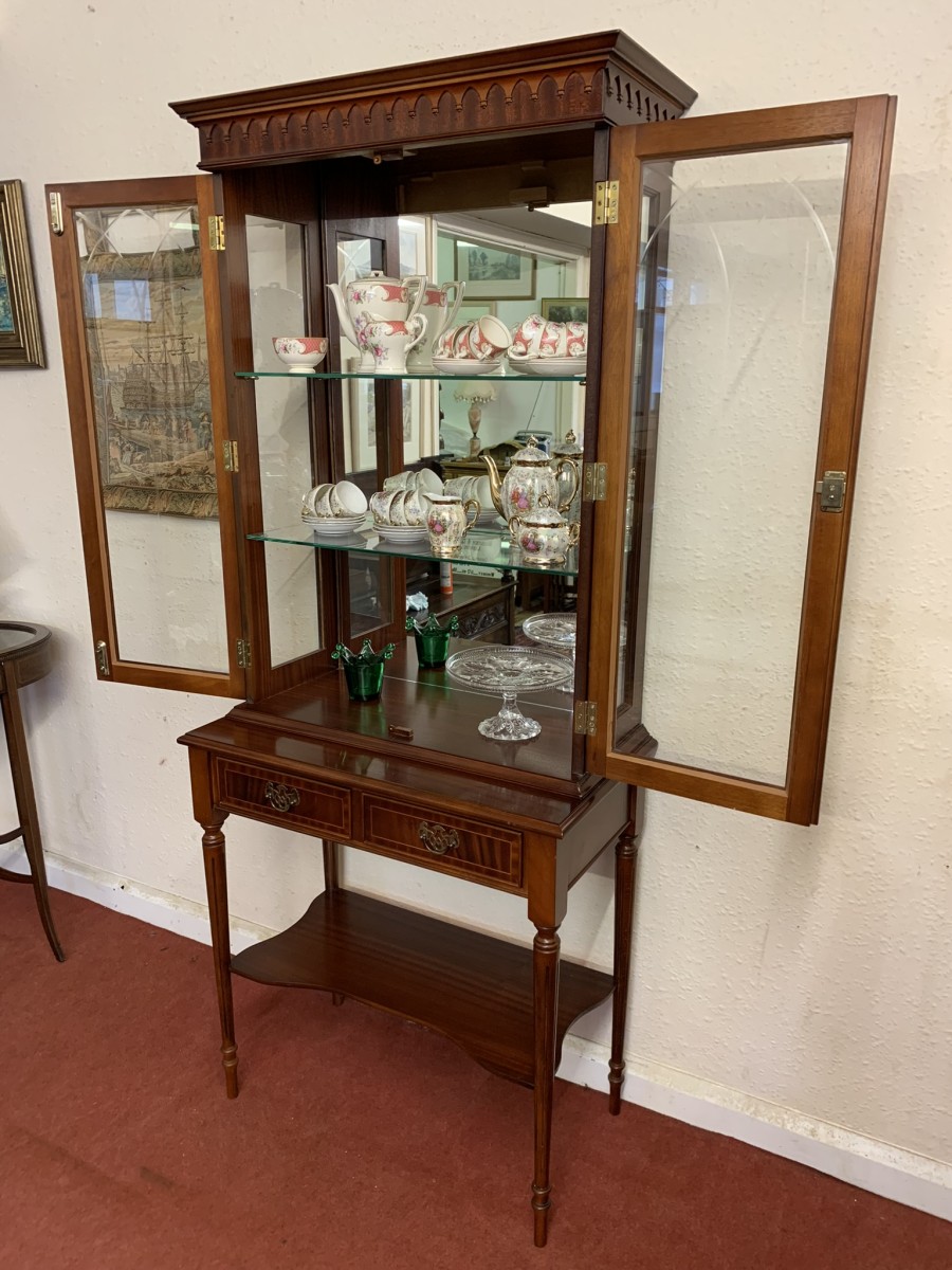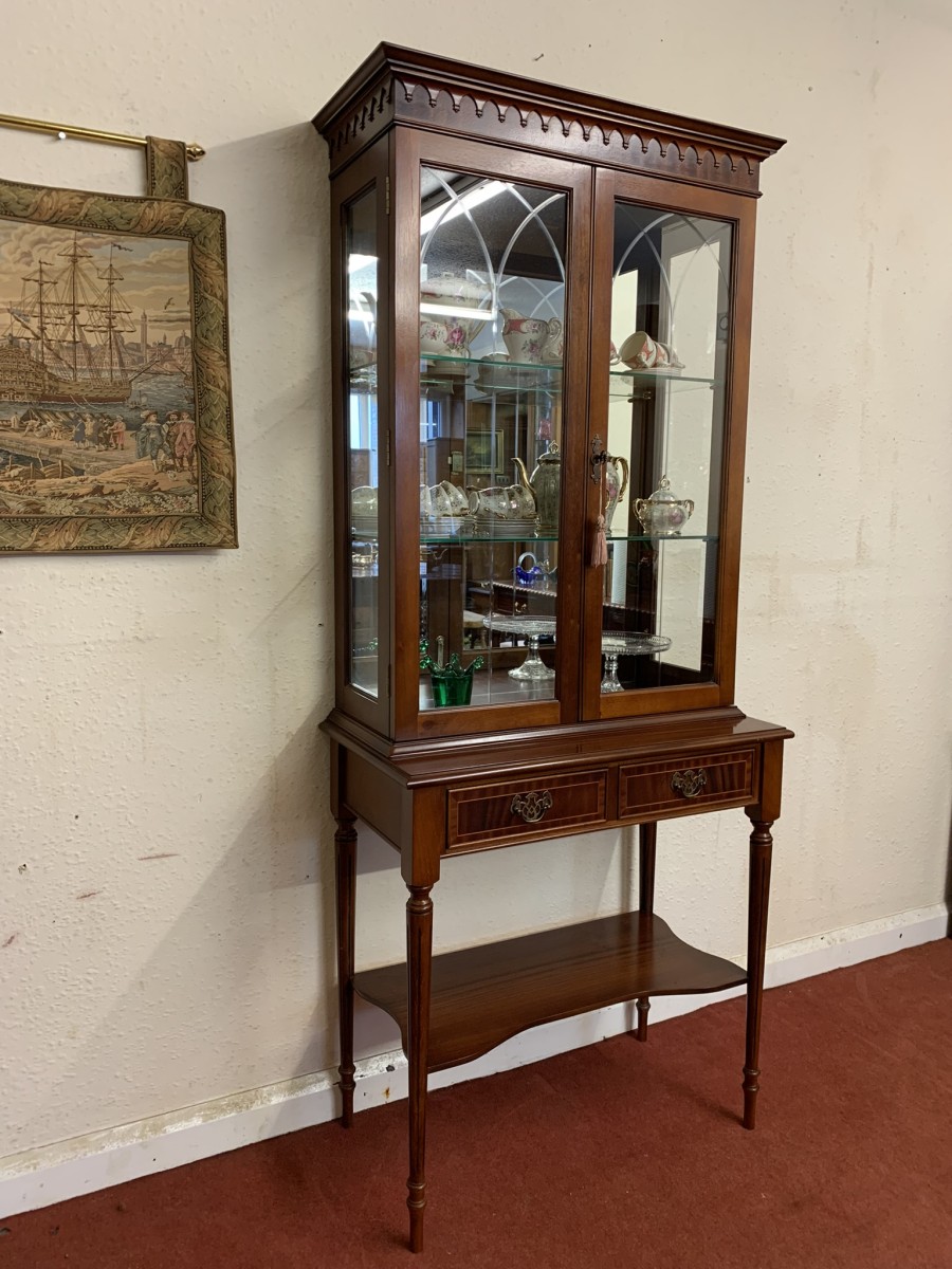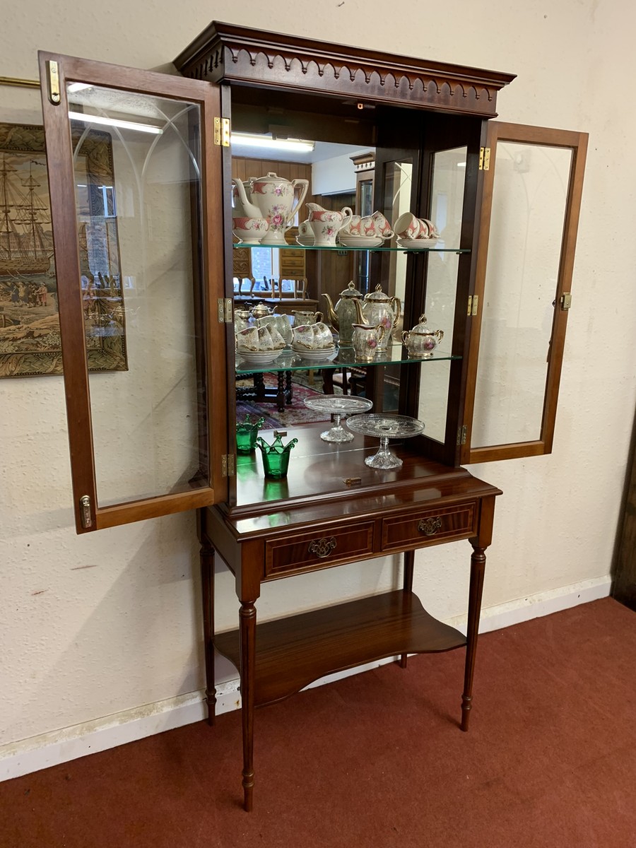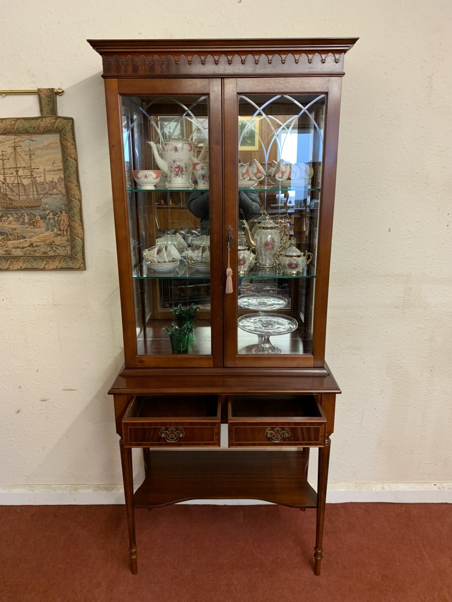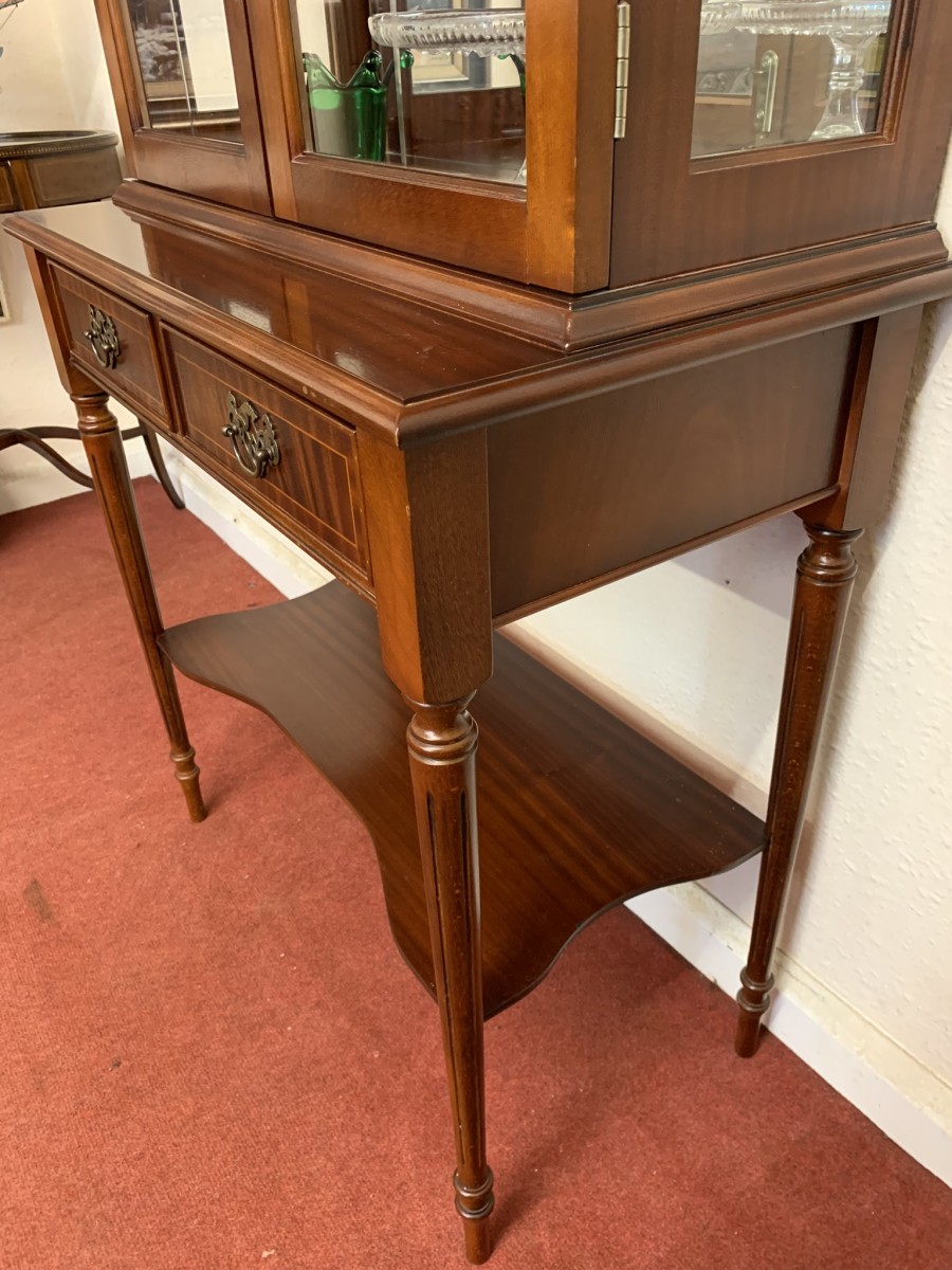 The oversailing top having carved decoration below. The pair of lockable etched glass doors open to reveal two glass display shelves. This top section having glass sides. Below are a pair of inlaid drawers, each drawer having a decorative brass handle. Shelf below, this excellent mahogany cabinet which is in excellent condition sits on four fluted legs.