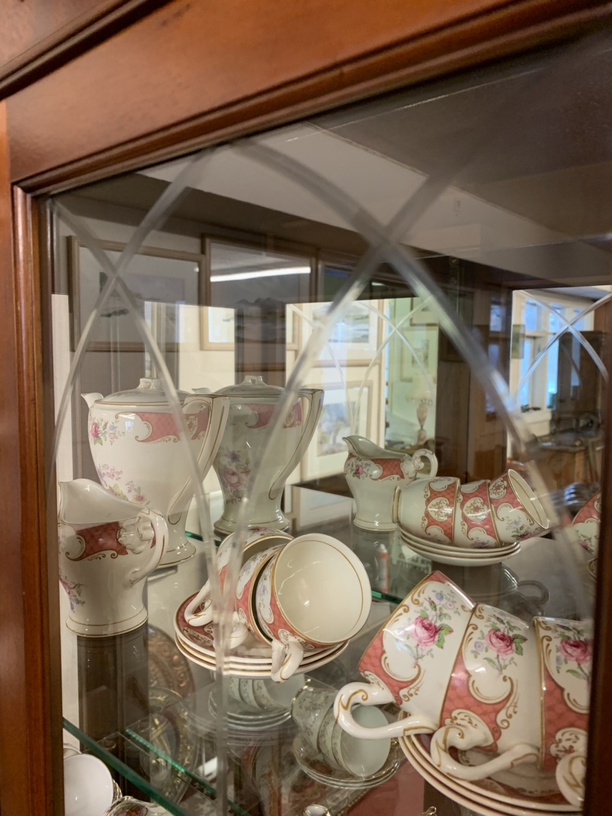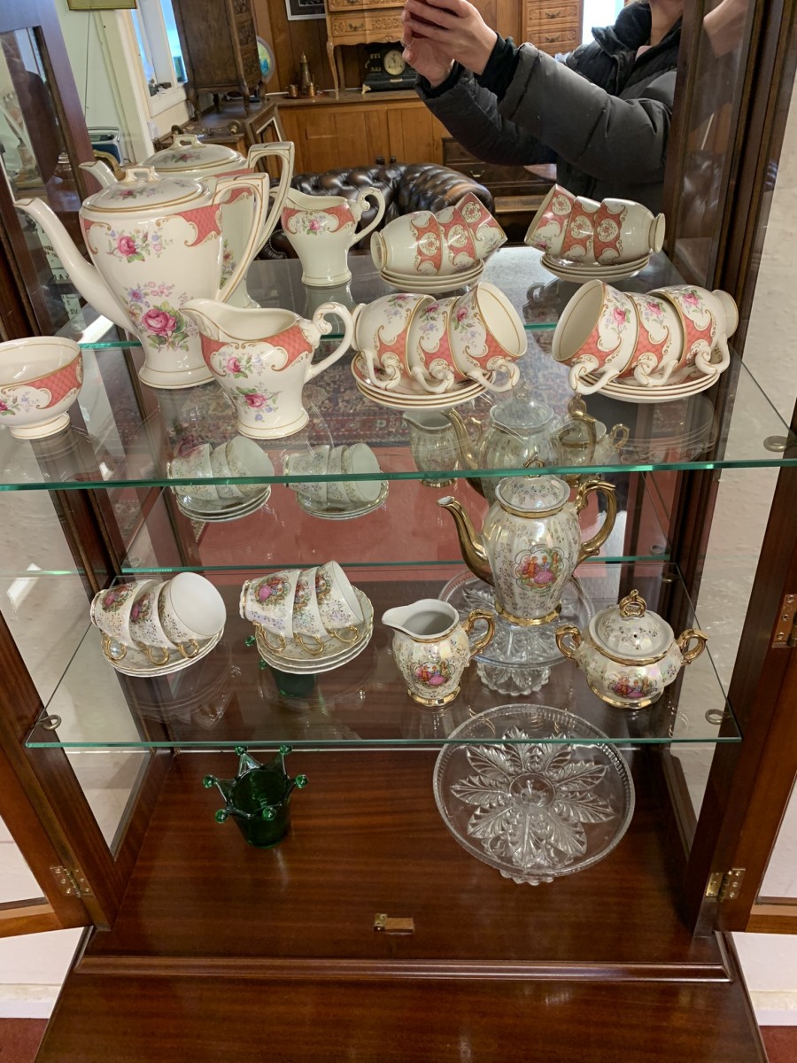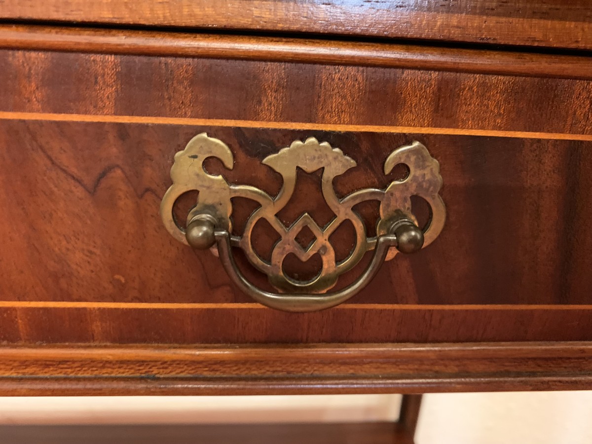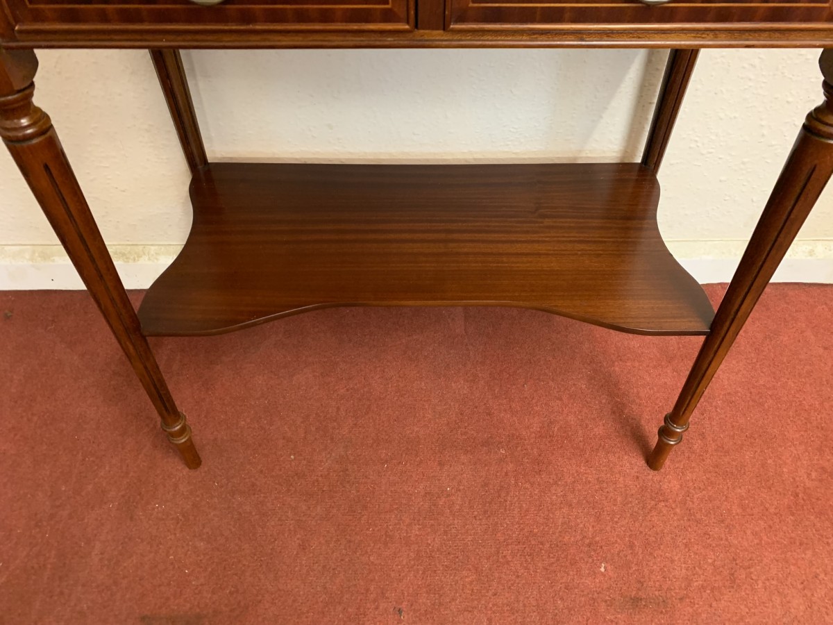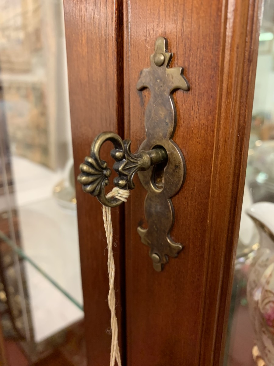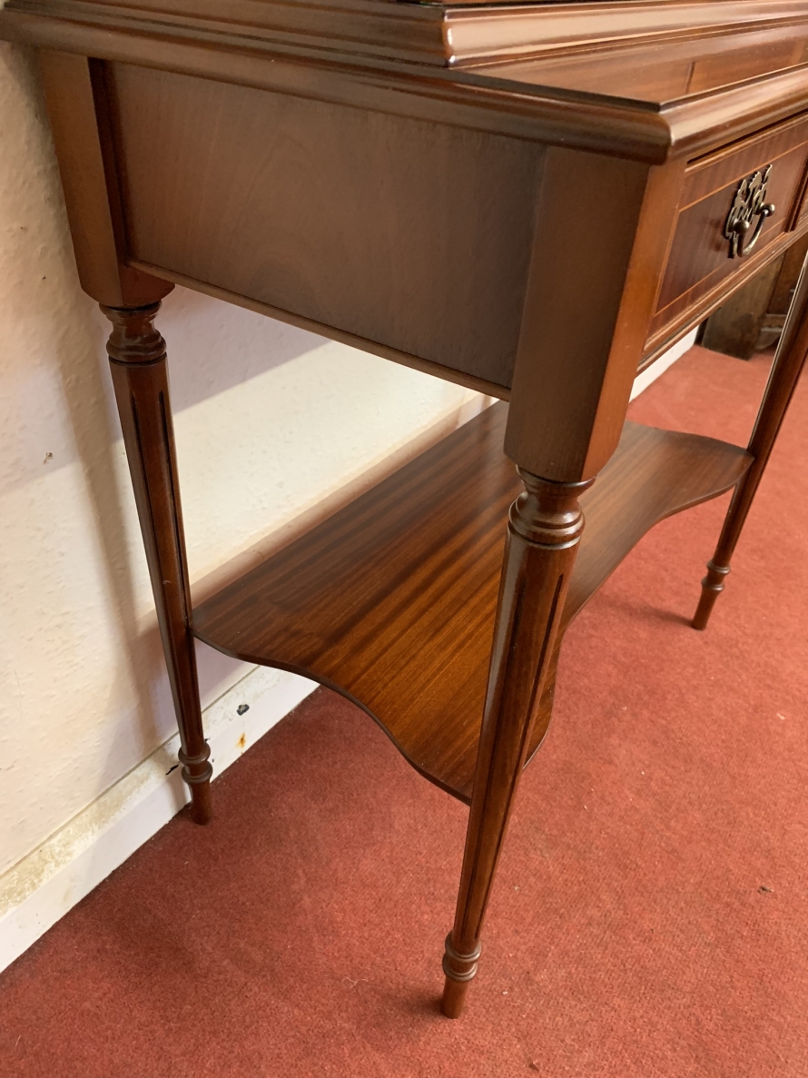 The oversailing top having carved decoration below. The pair of lockable etched glass doors open to reveal two glass display shelves. This top section having glass sides. Below are a pair of inlaid drawers, each drawer having a decorative brass handle. Shelf below, this excellent mahogany cabinet which is in excellent condition sits on four fluted legs.