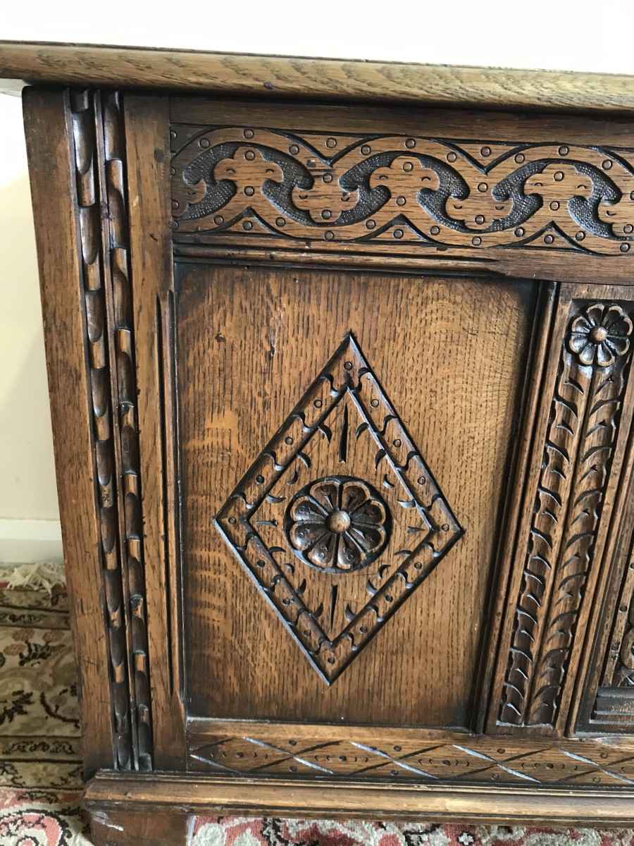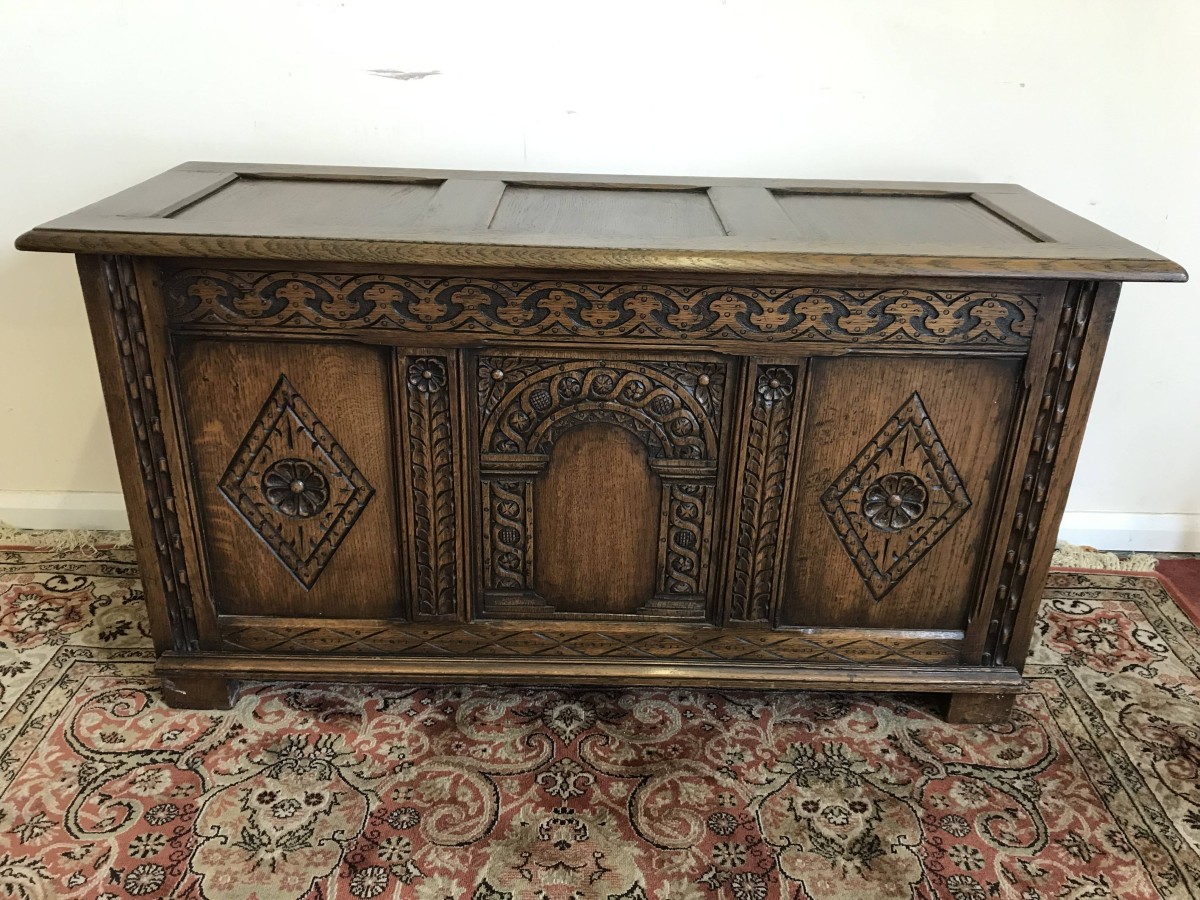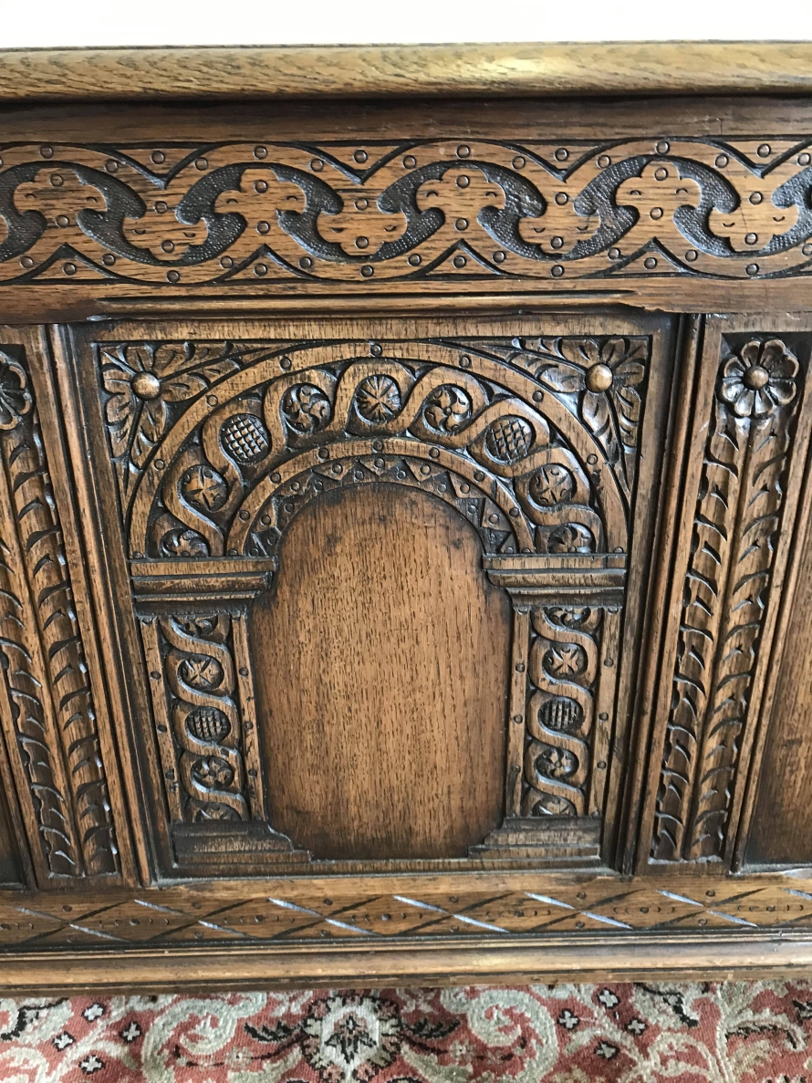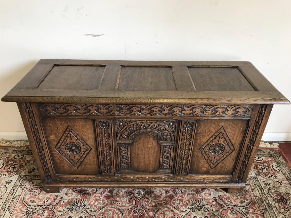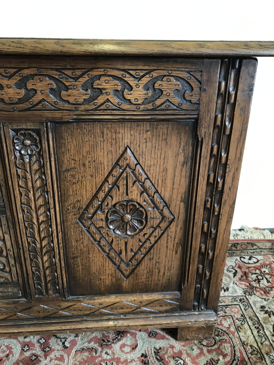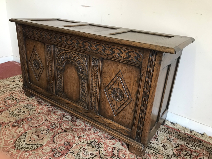 We are delighted to offer this fantastic quality blanket box which is in pristine condition. The lift up lid has three recessed panels and lifts up to reveal ample storage space. Below are three carved recessed panels, the panels have ornate carving above, below and to the sides. Recessed panelled sides the box sits on traditional oak block feet.
