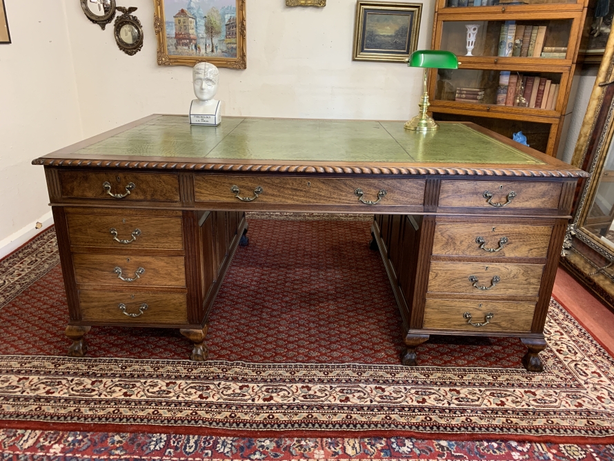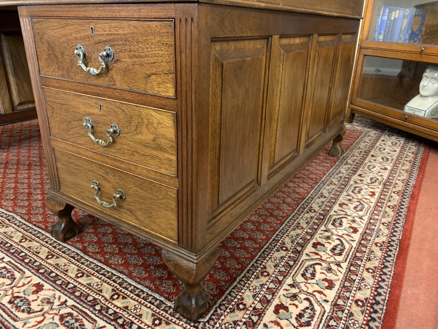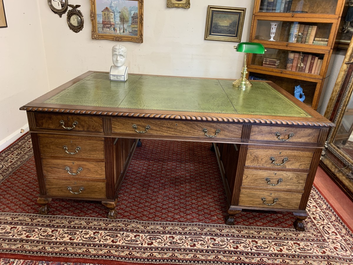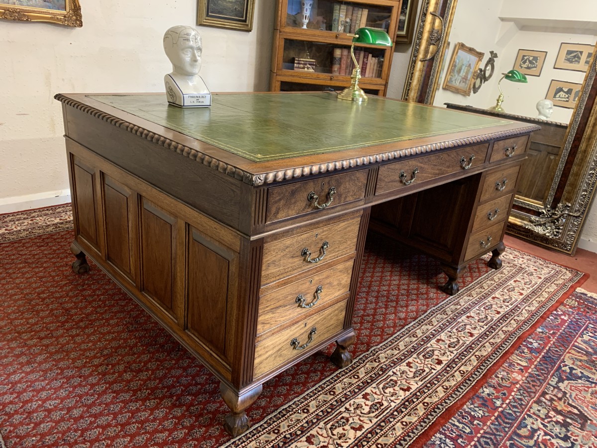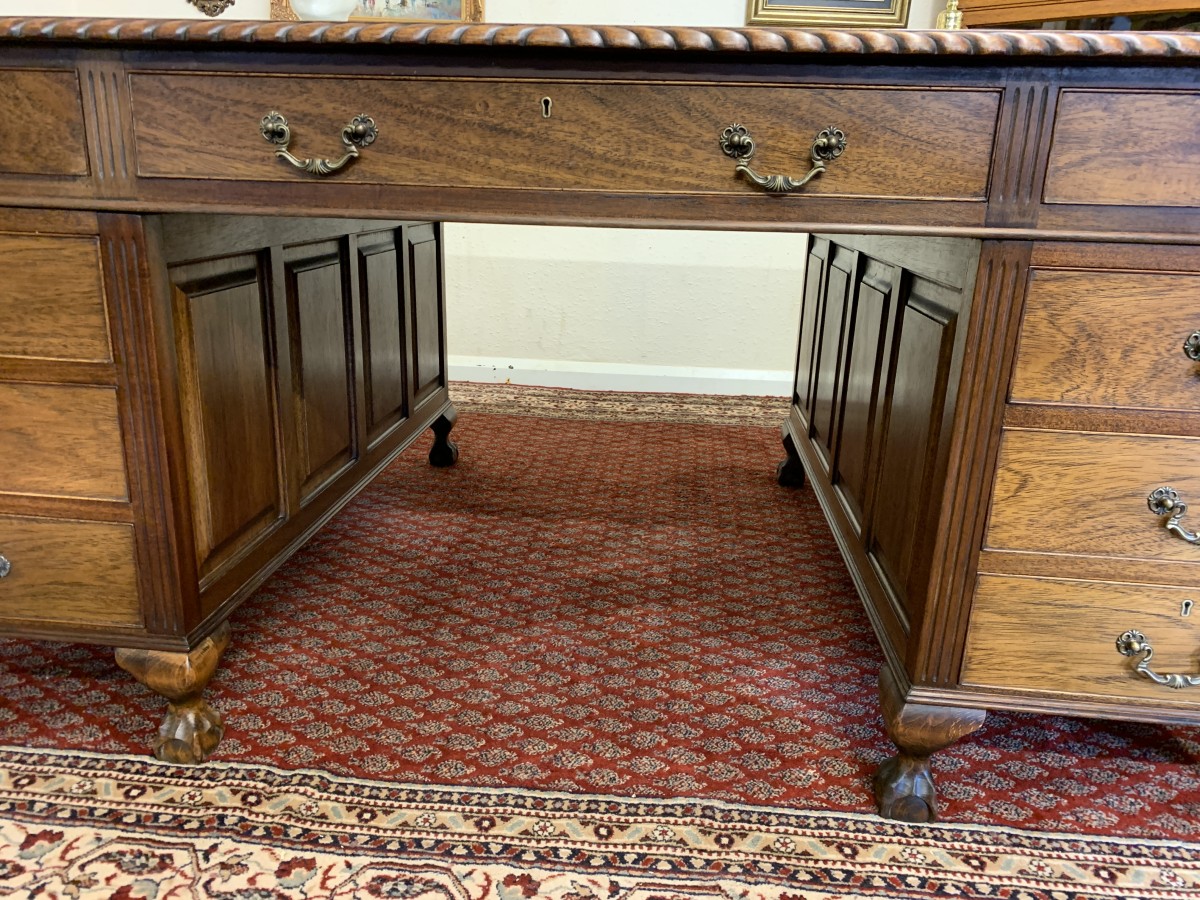 This fabulous large desk dates circa 1920. The top has an antique green leather surface with gold tooling decoration. The desk has rope edged carved decoration. The central knee hole has a drawer which has a pair of ornate brass handles. Central knee hole section is flanked by a pair of four drawer pedestals, each drawer having an ornate brass handle. The pedestal has fabulous fielded panels, the back of the desk also has fielded panels. This superb quality mahogany desk stands on eight ball and claw feet.