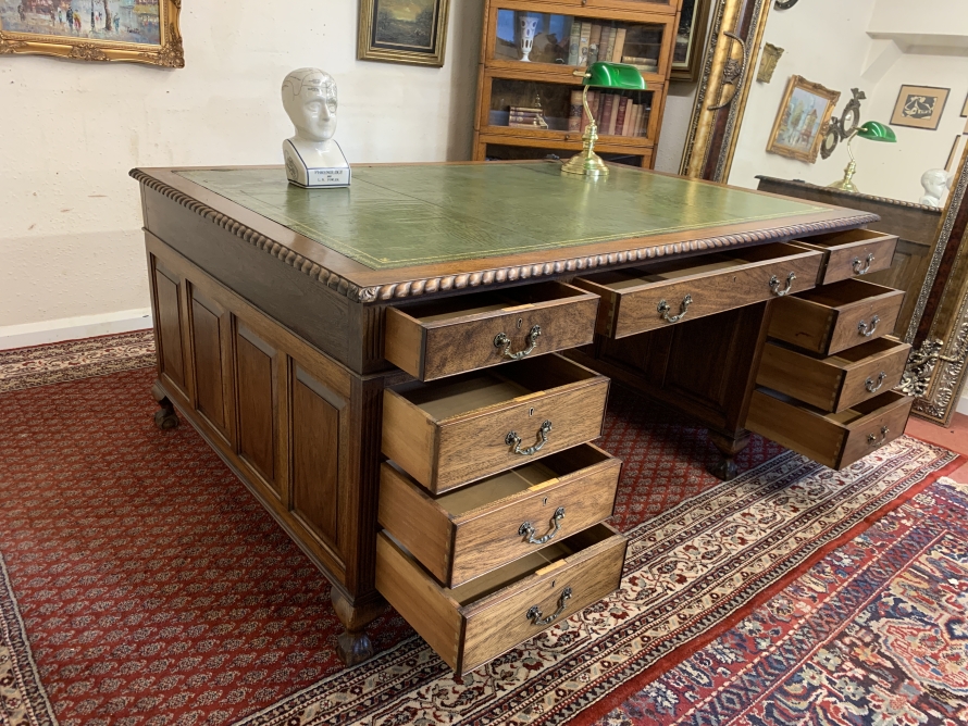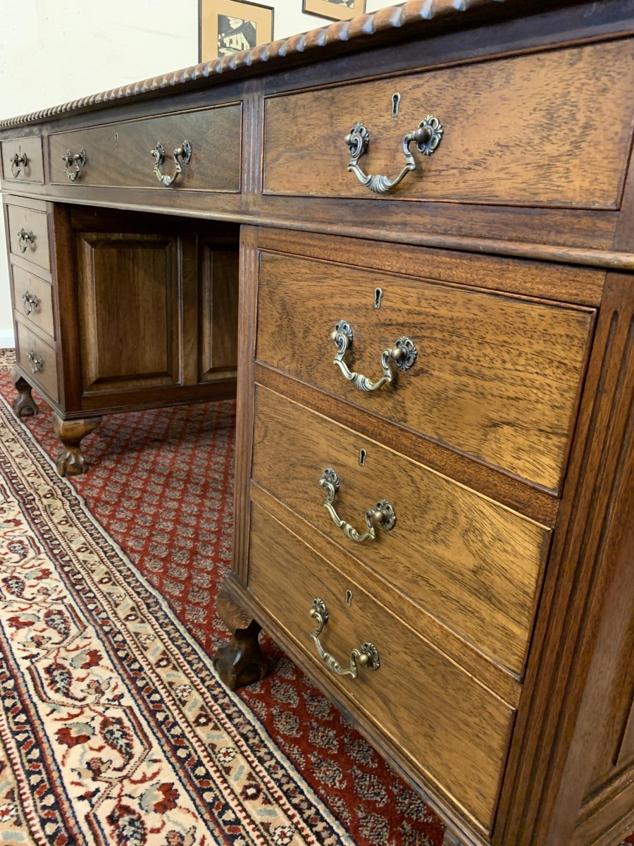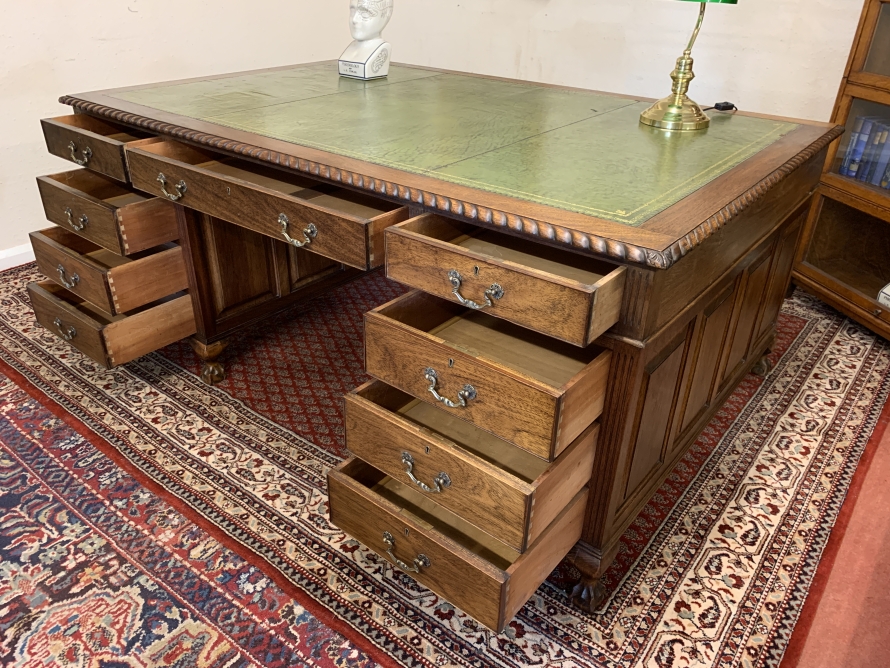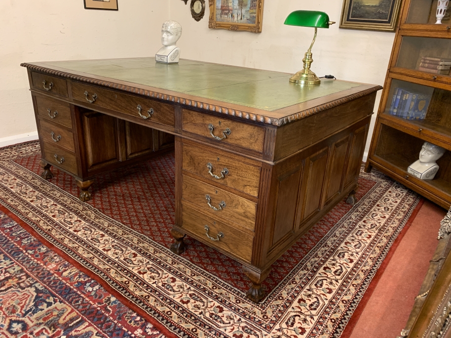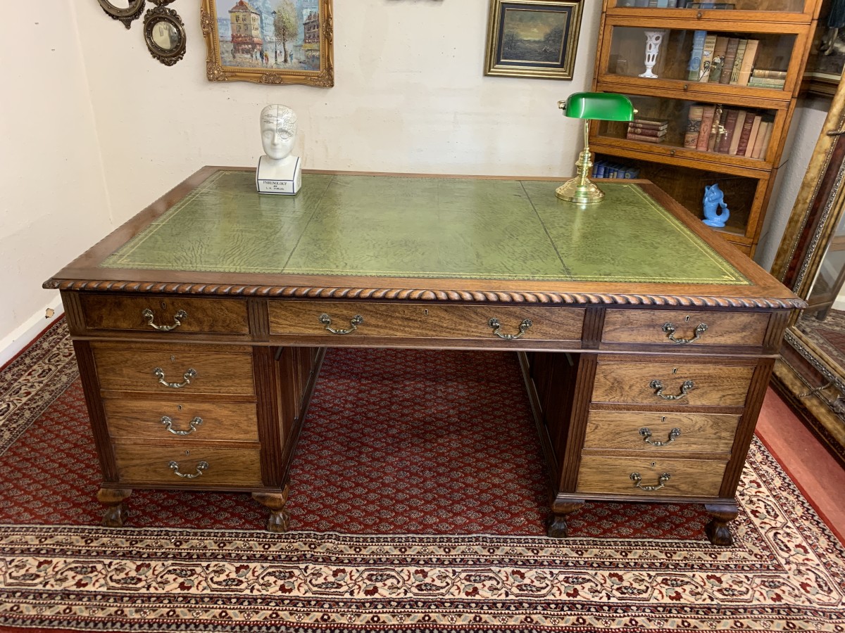 This fabulous large desk dates circa 1920. The top has an antique green leather surface with gold tooling decoration. The desk has rope edged carved decoration. The central knee hole has a drawer which has a pair of ornate brass handles. Central knee hole section is flanked by a pair of four drawer pedestals, each drawer having an ornate brass handle. The pedestal has fabulous fielded panels, the back of the desk also has fielded panels. This superb quality mahogany desk stands on eight ball and claw feet.