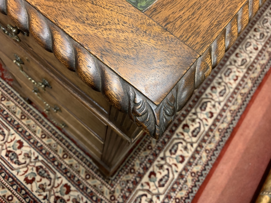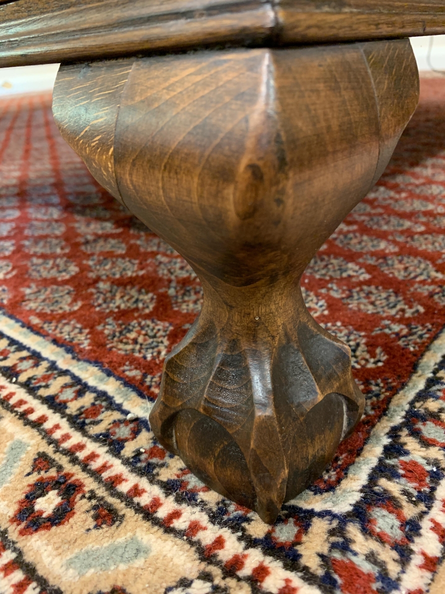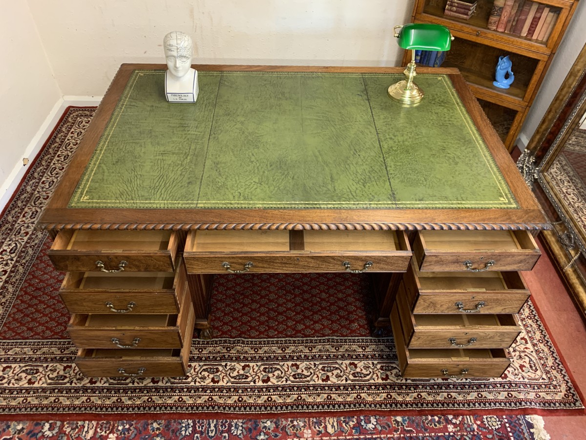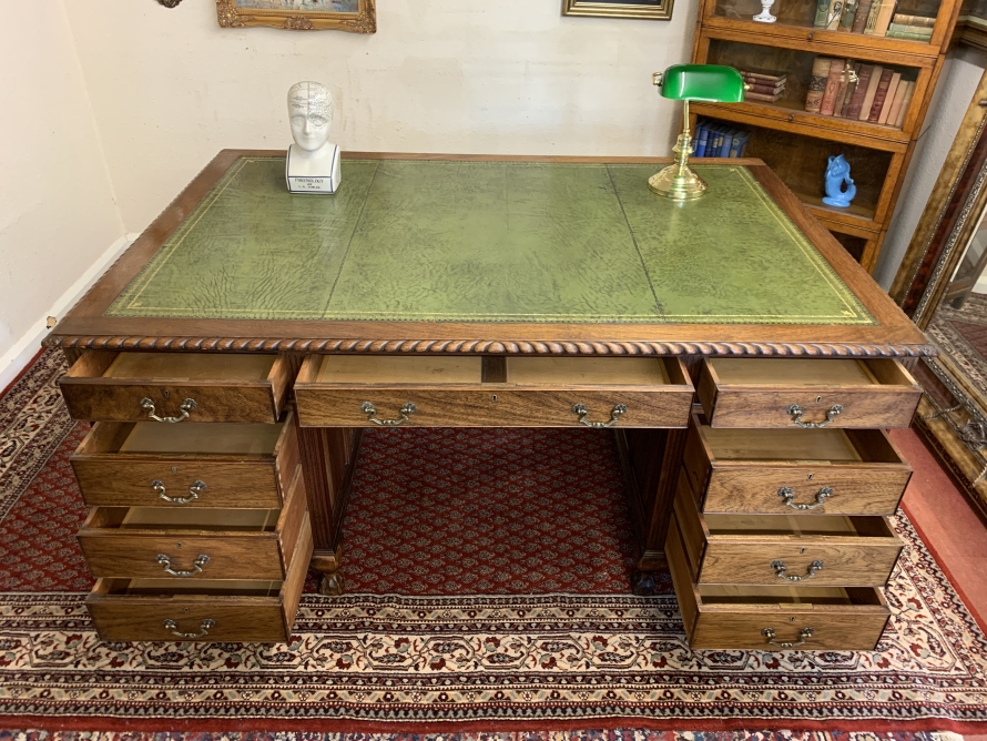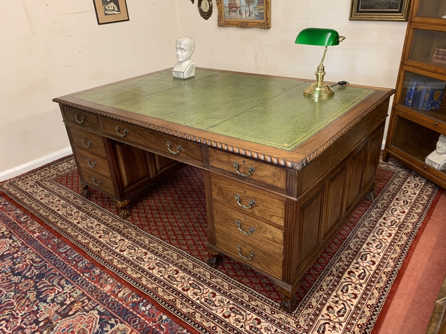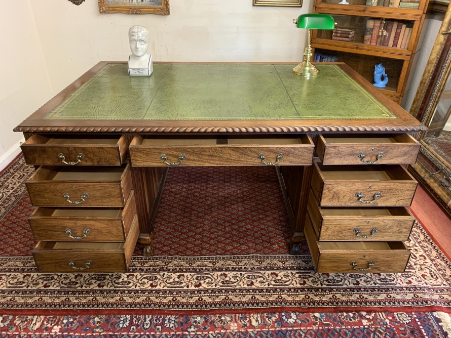 This fabulous large desk dates circa 1920. The top has an antique green leather surface with gold tooling decoration. The desk has rope edged carved decoration. The central knee hole has a drawer which has a pair of ornate brass handles. Central knee hole section is flanked by a pair of four drawer pedestals, each drawer having an ornate brass handle. The pedestal has fabulous fielded panels, the back of the desk also has fielded panels. This superb quality mahogany desk stands on eight ball and claw feet.