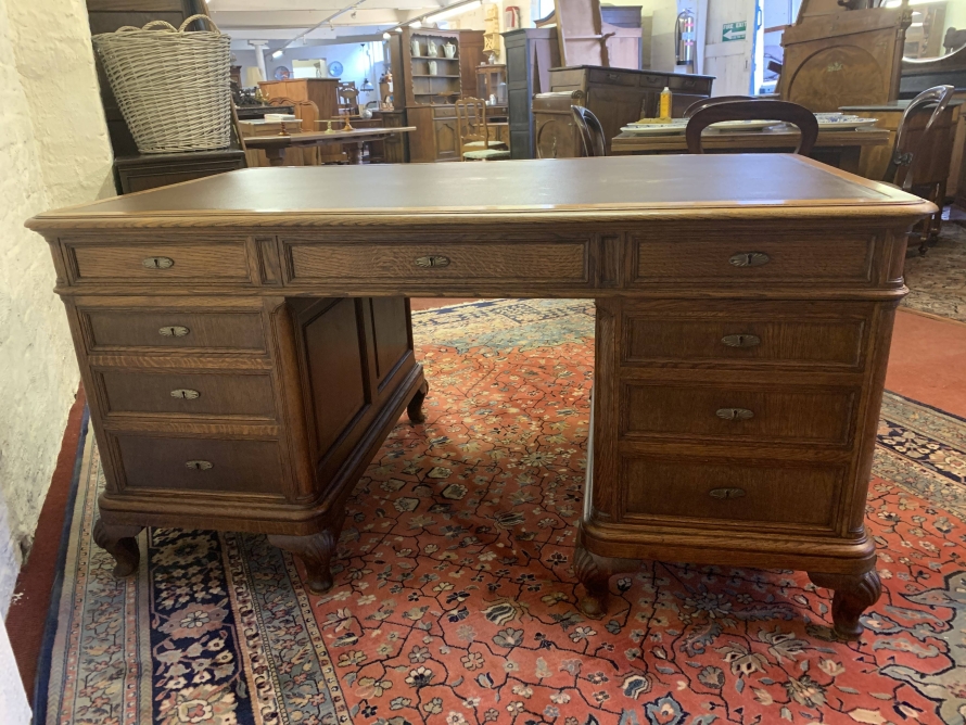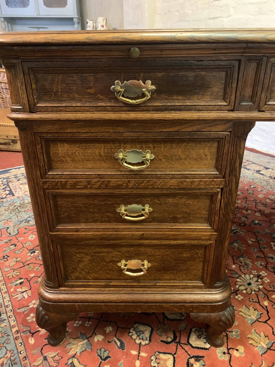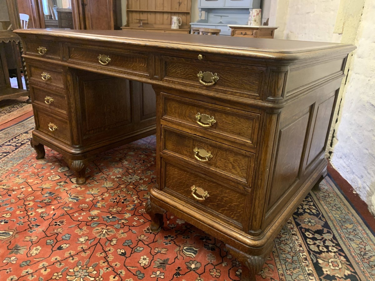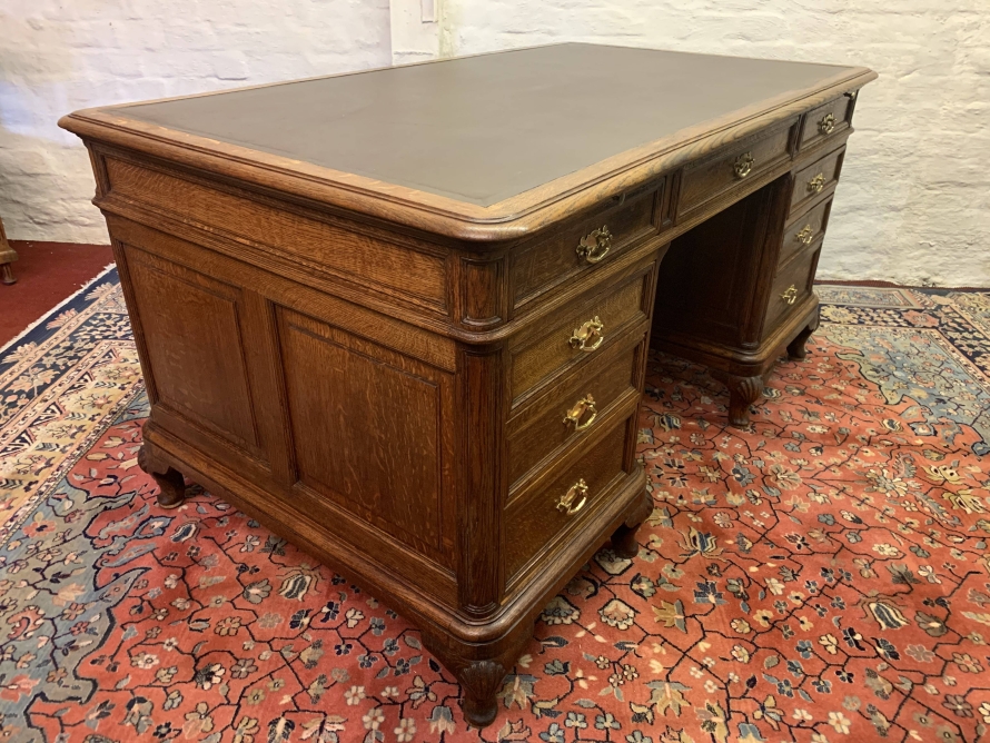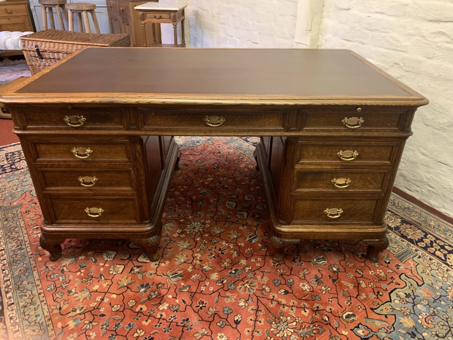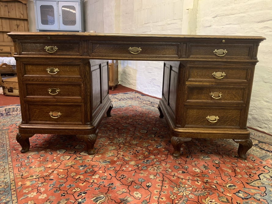 The leathered top sits within an oak border, with rounded corners to the front and back. The central knee hole drawer has a brass handle. This drawer is flanked by a pair of four drawers with a retractable slide above the top drawer. Each drawer having brass handle. The back of the desk has dummy drawers. Fielded panels throughout, this super desk sits on eight carved shaped cabriole legs. Please note the desk is in excellent condition.