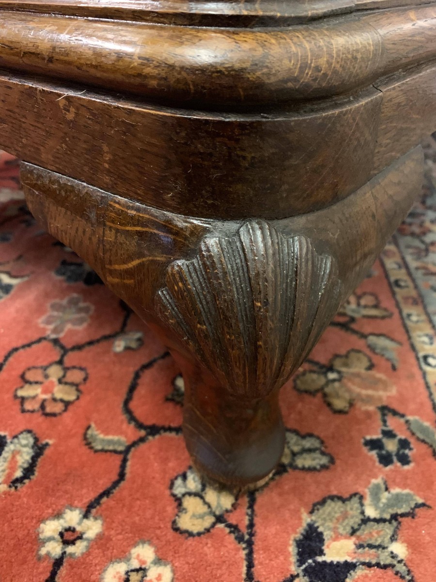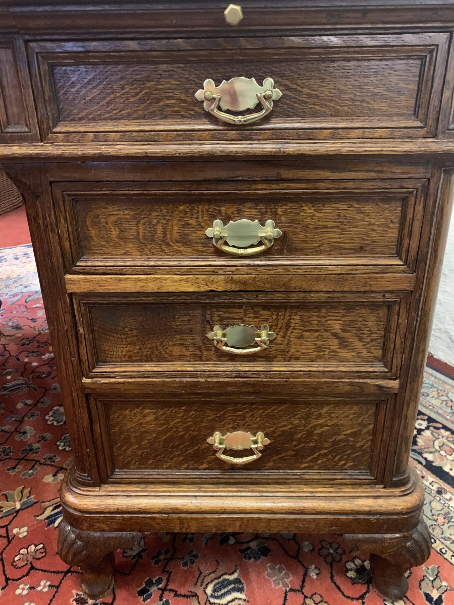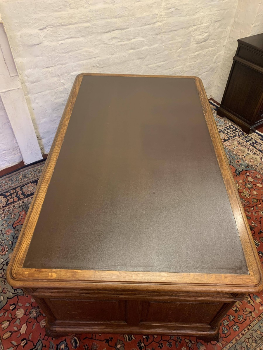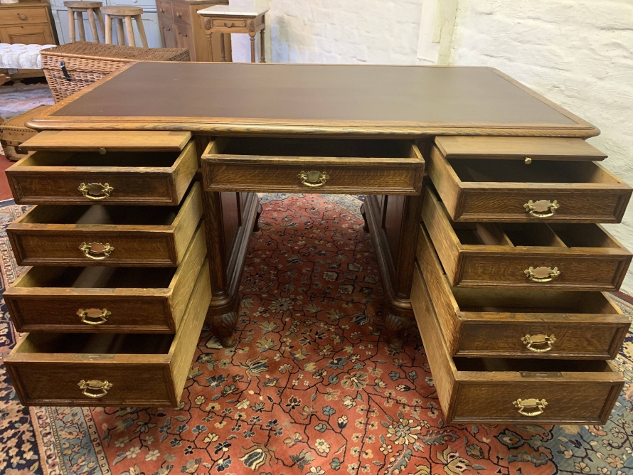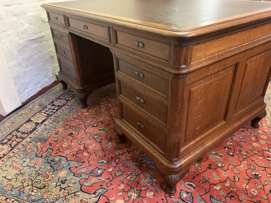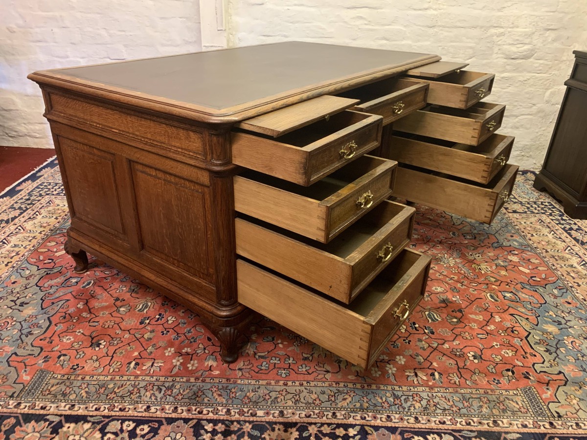 The leathered top sits within an oak border, with rounded corners to the front and back. The central knee hole drawer has a brass handle. This drawer is flanked by a pair of four drawers with a retractable slide above the top drawer. Each drawer having brass handle. The back of the desk has dummy drawers. Fielded panels throughout, this super desk sits on eight carved shaped cabriole legs. Please note the desk is in excellent condition.