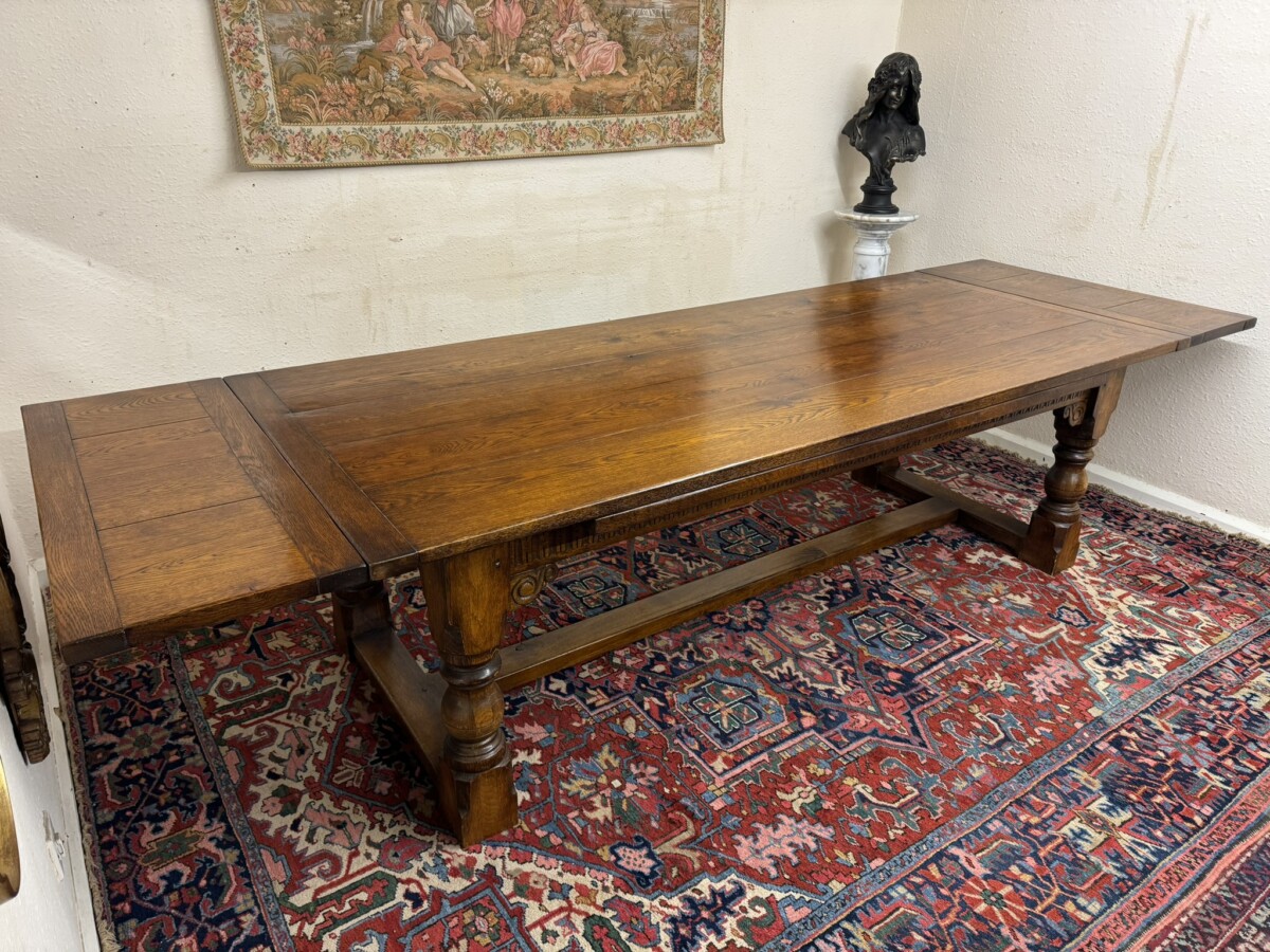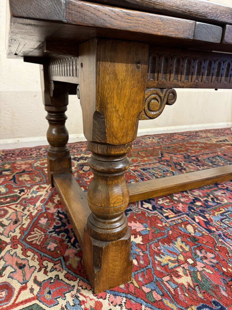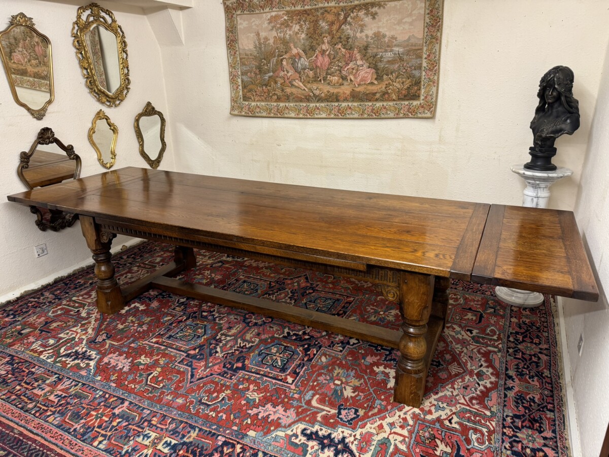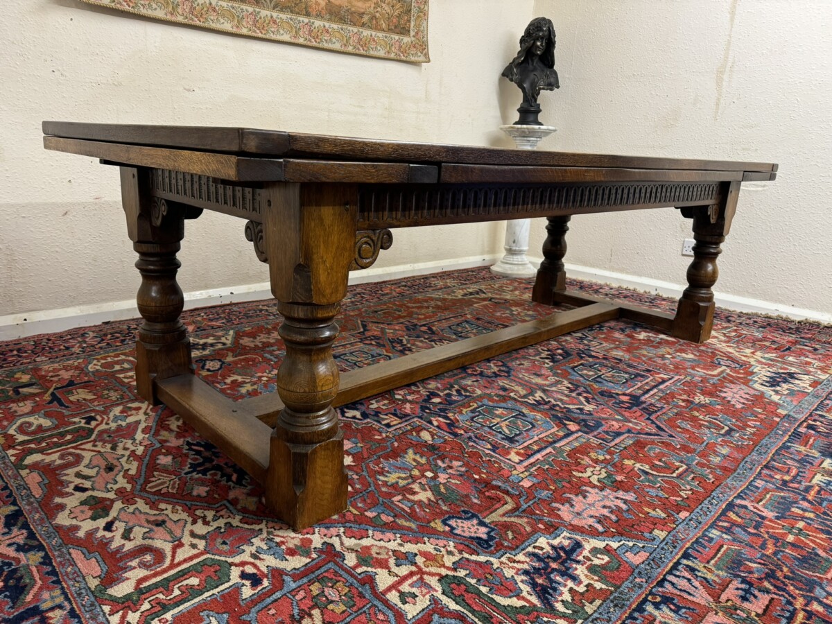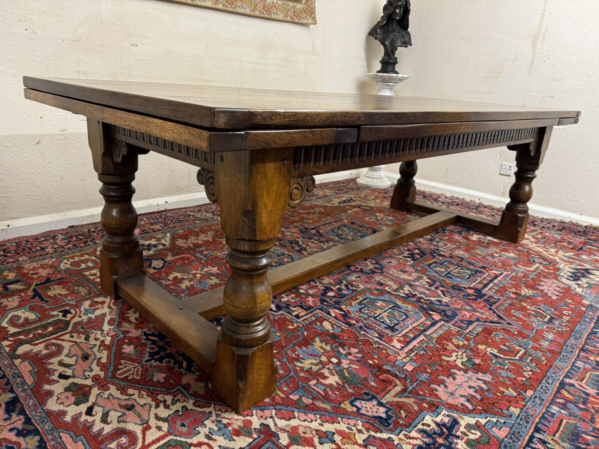 This fantastic large dining table has a four planked top. Hidden extension leaves slide out from either end to extend the size of the table. Four turned legs, carved decoration, substantial stretcher and standing on four block feet.