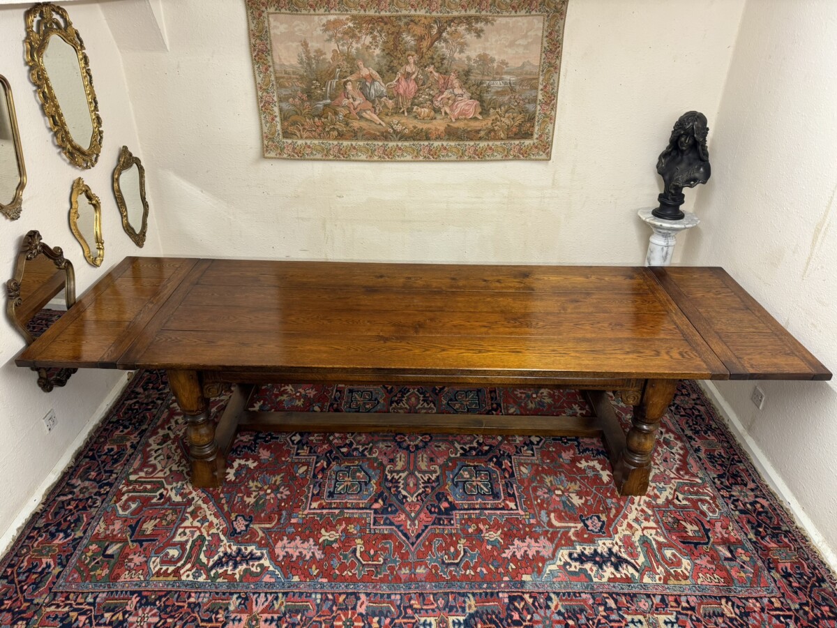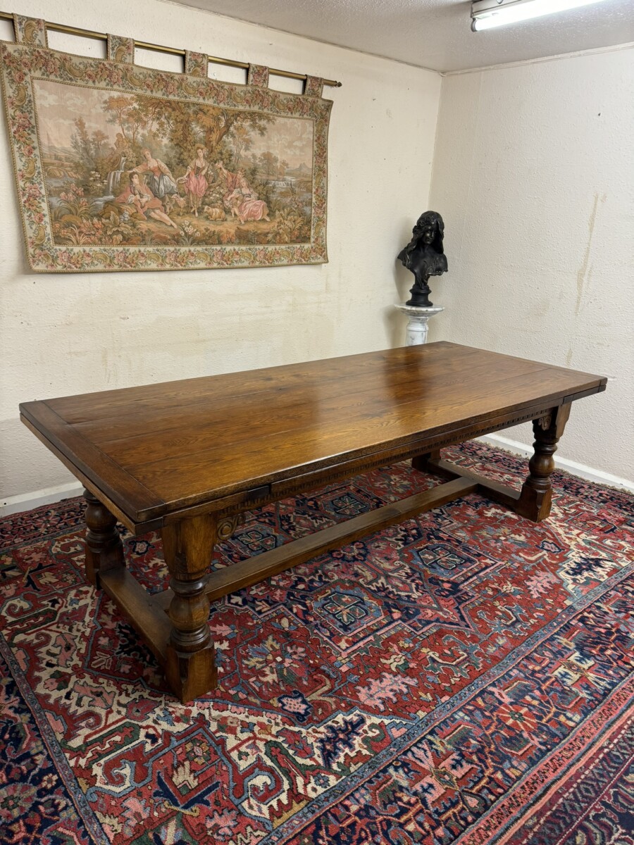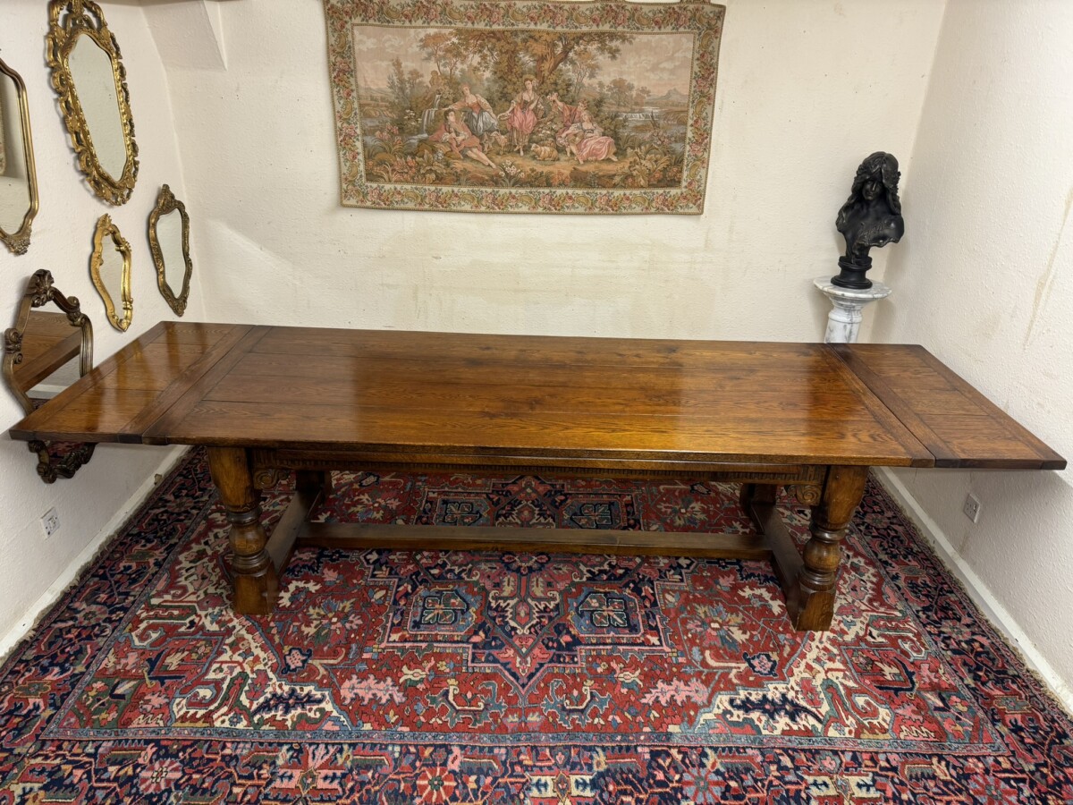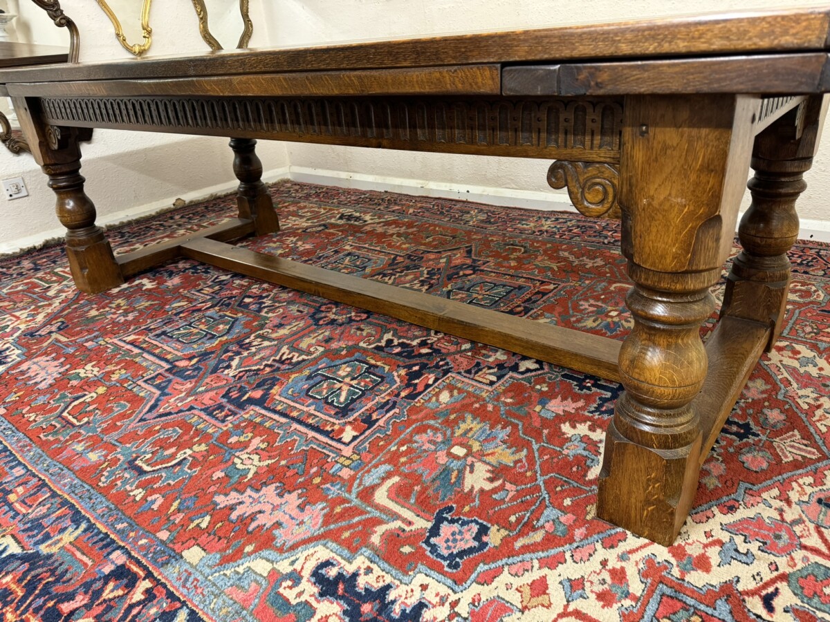 This fantastic large dining table has a four planked top. Hidden extension leaves slide out from either end to extend the size of the table. Four turned legs, carved decoration, substantial stretcher and standing on four block feet.