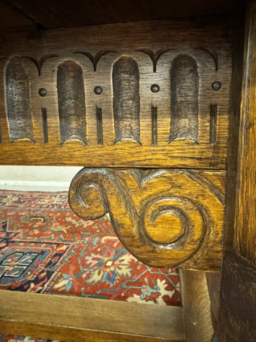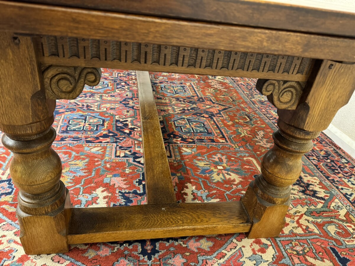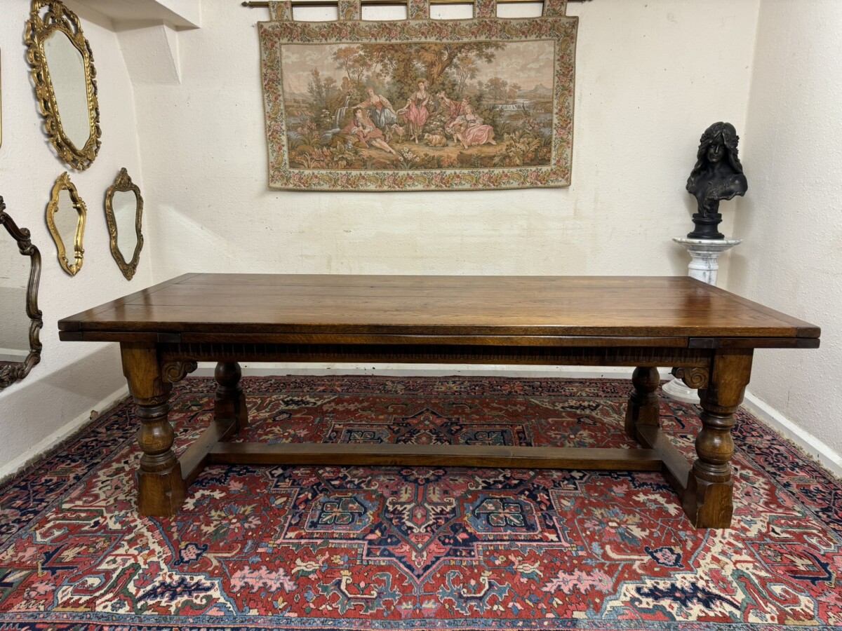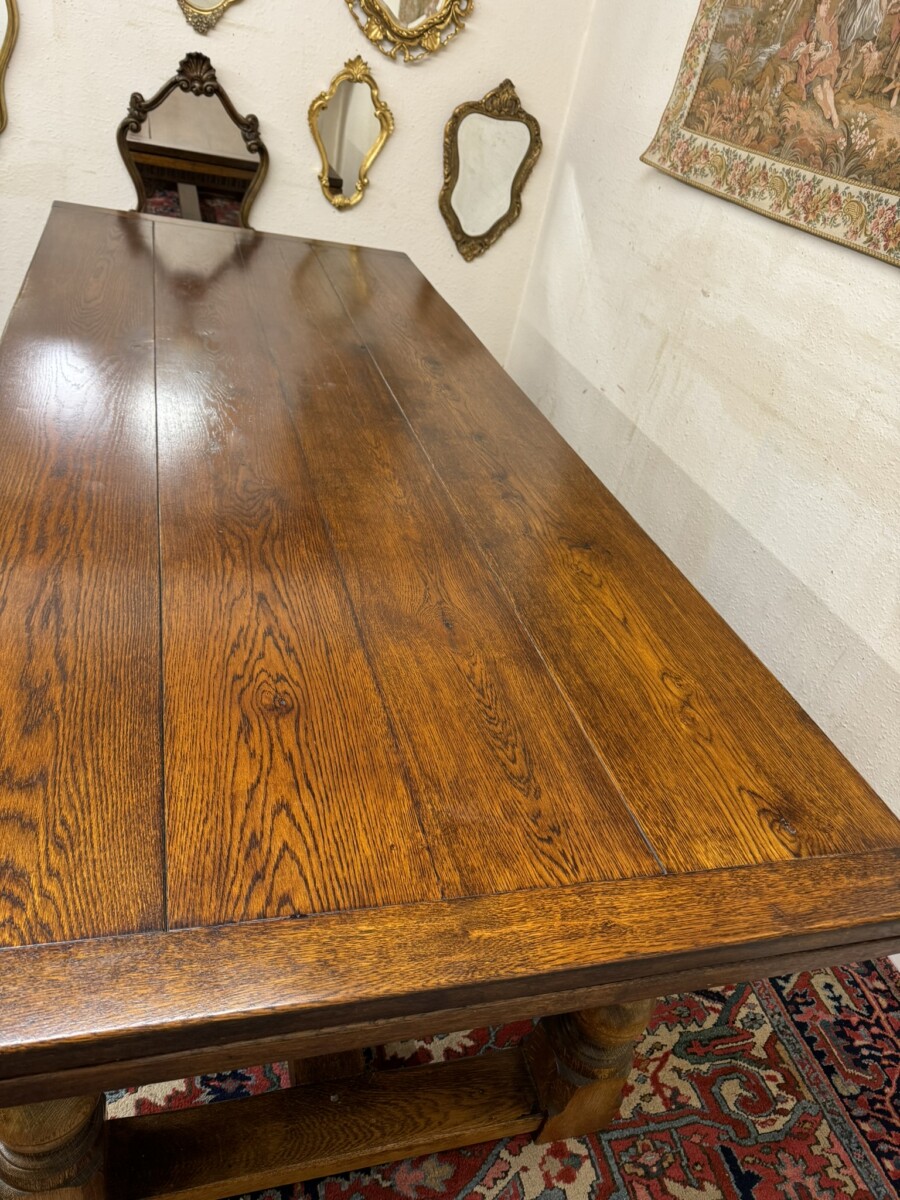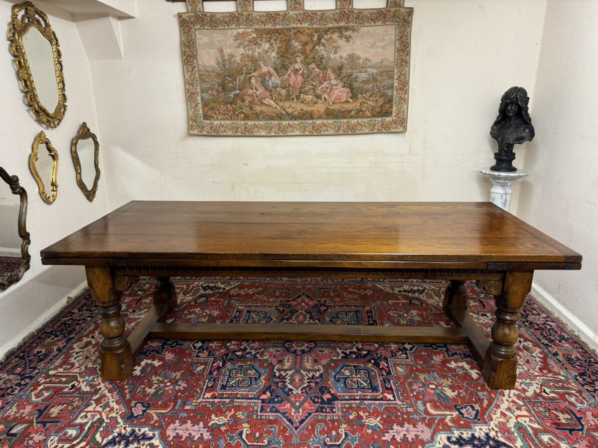 This fantastic large dining table has a four planked top. Hidden extension leaves slide out from either end to extend the size of the table. Four turned legs, carved decoration, substantial stretcher and standing on four block feet.