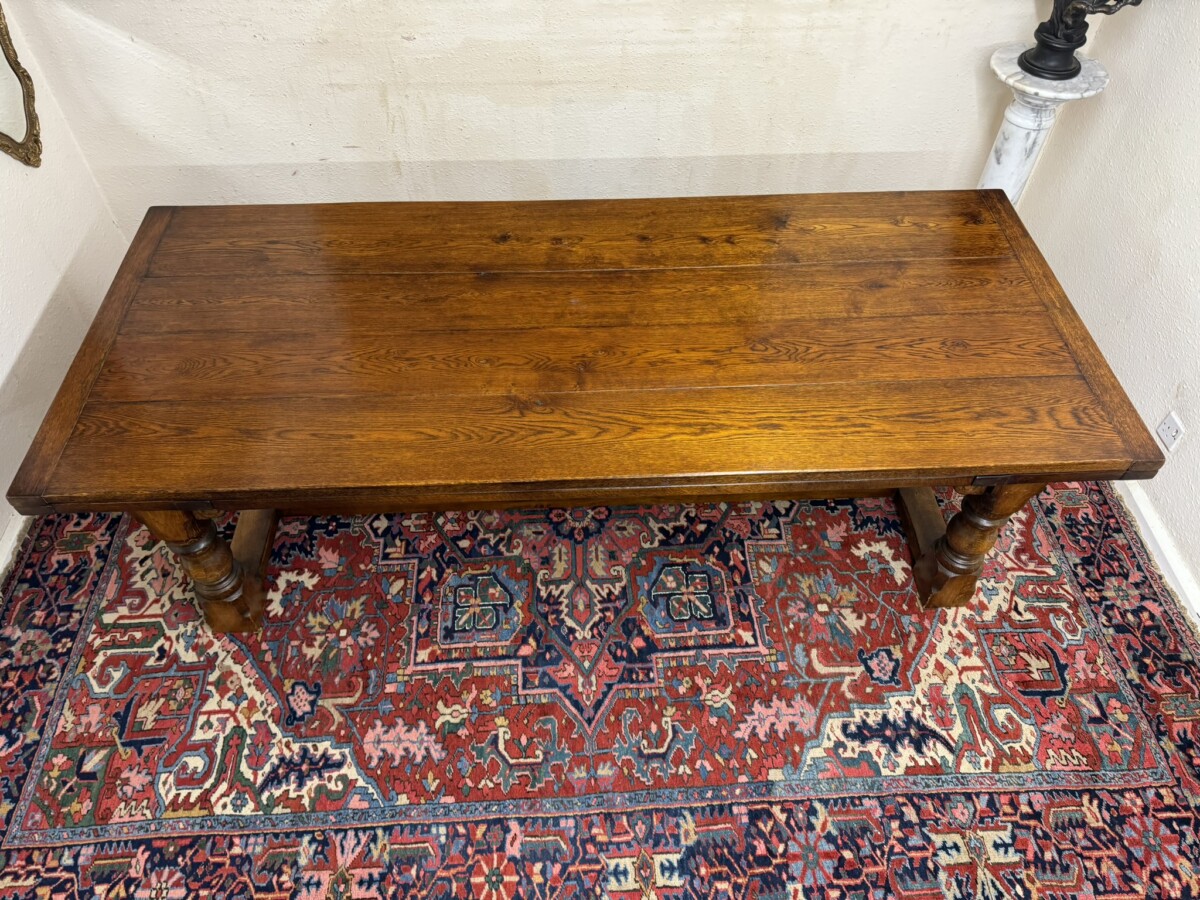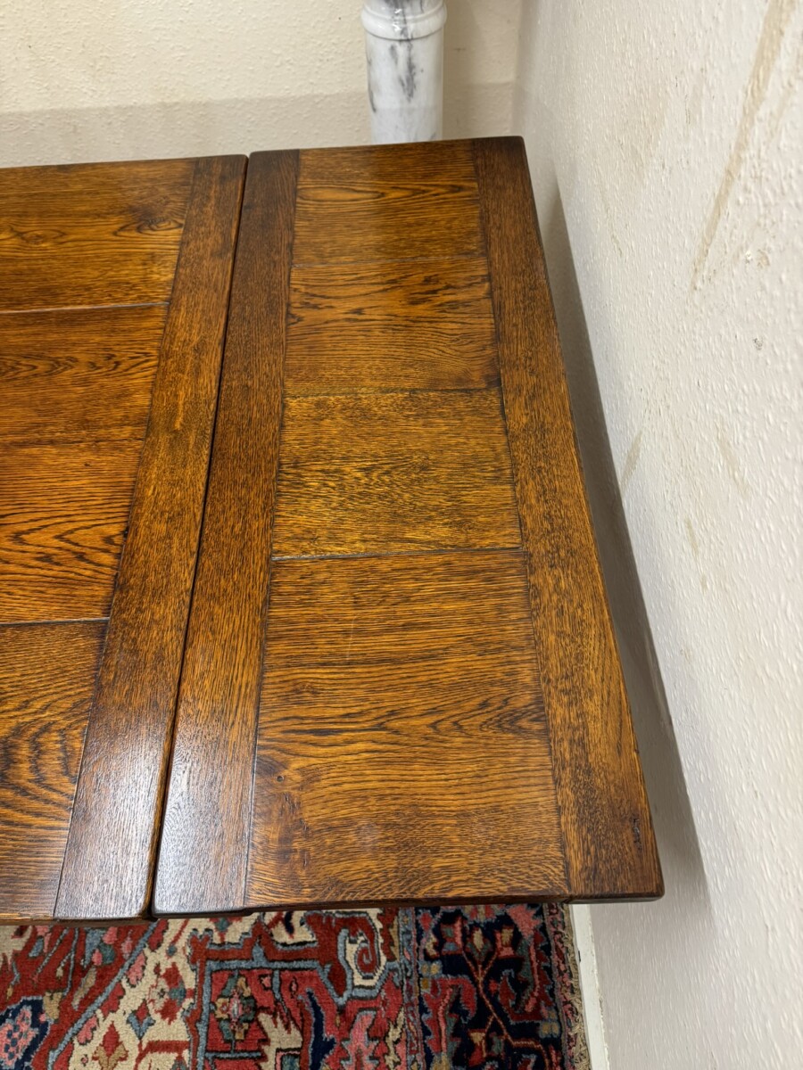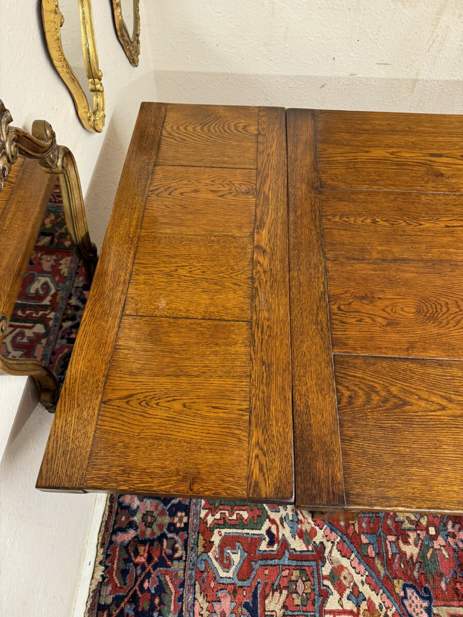 - OUTSTANDING QUALITY LARGE OAK PLANK TOP EXTENDING DINING TABLE