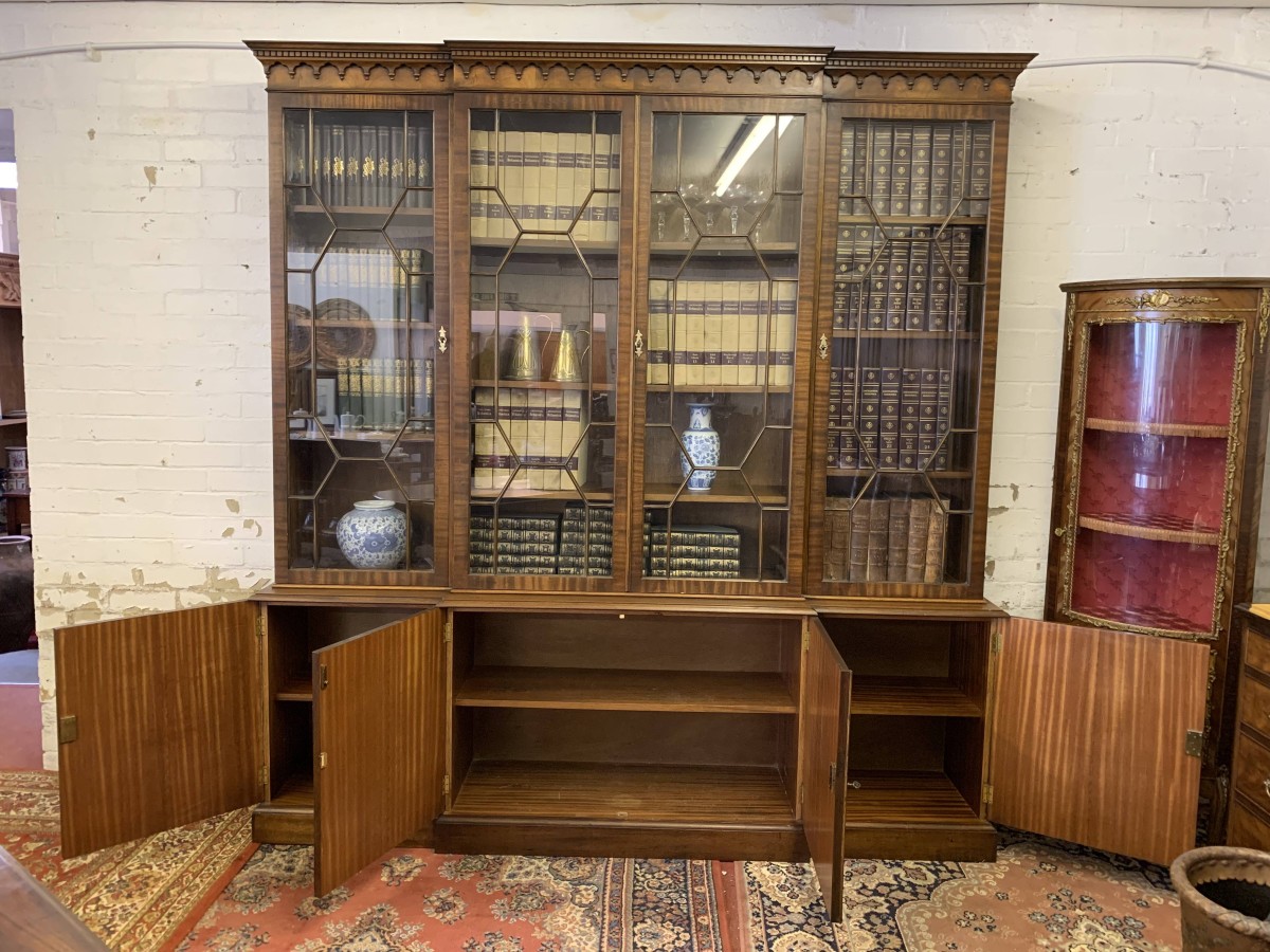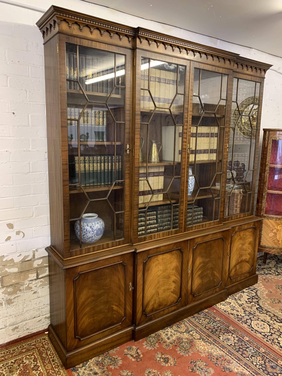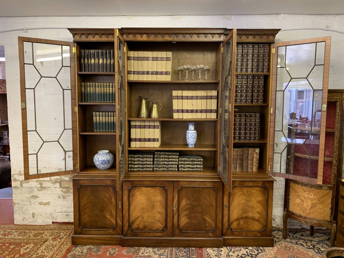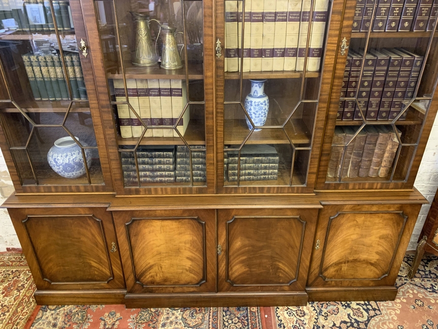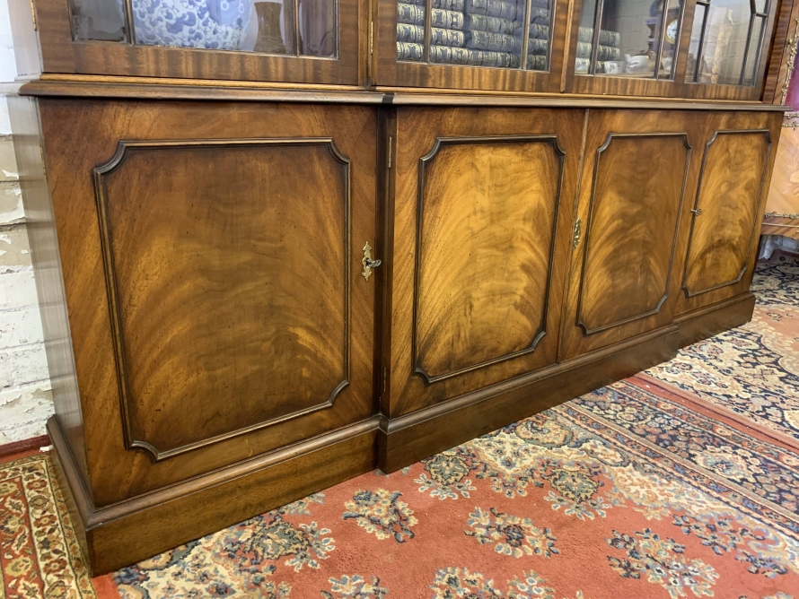 Quality large library bookcase made in striking mahogany which is in excellent condition. Dental cornice sits above four lockable glazed doors, the central pair of doors being brakefront. Each door has decorative wood barring. The doors open to reveal three adjustable and removable shelves. Below are four lockable cupboard doors, the central pair of doors being brakefront. Each door opens to reveal a removable shelf. This fabulous library bookcase produced by the renowned Bevan Funnell furniture manufacturer stands on a plinth base.