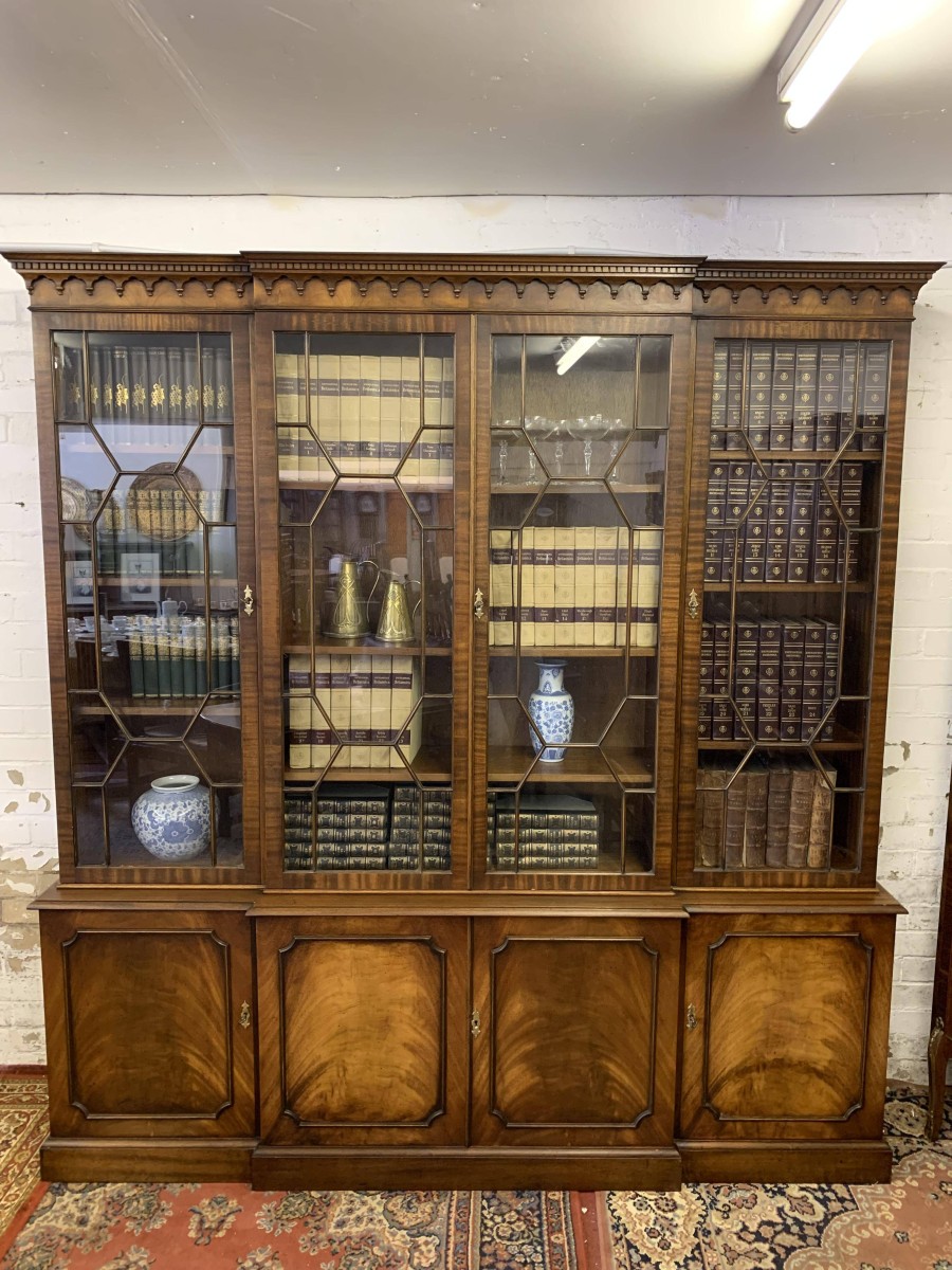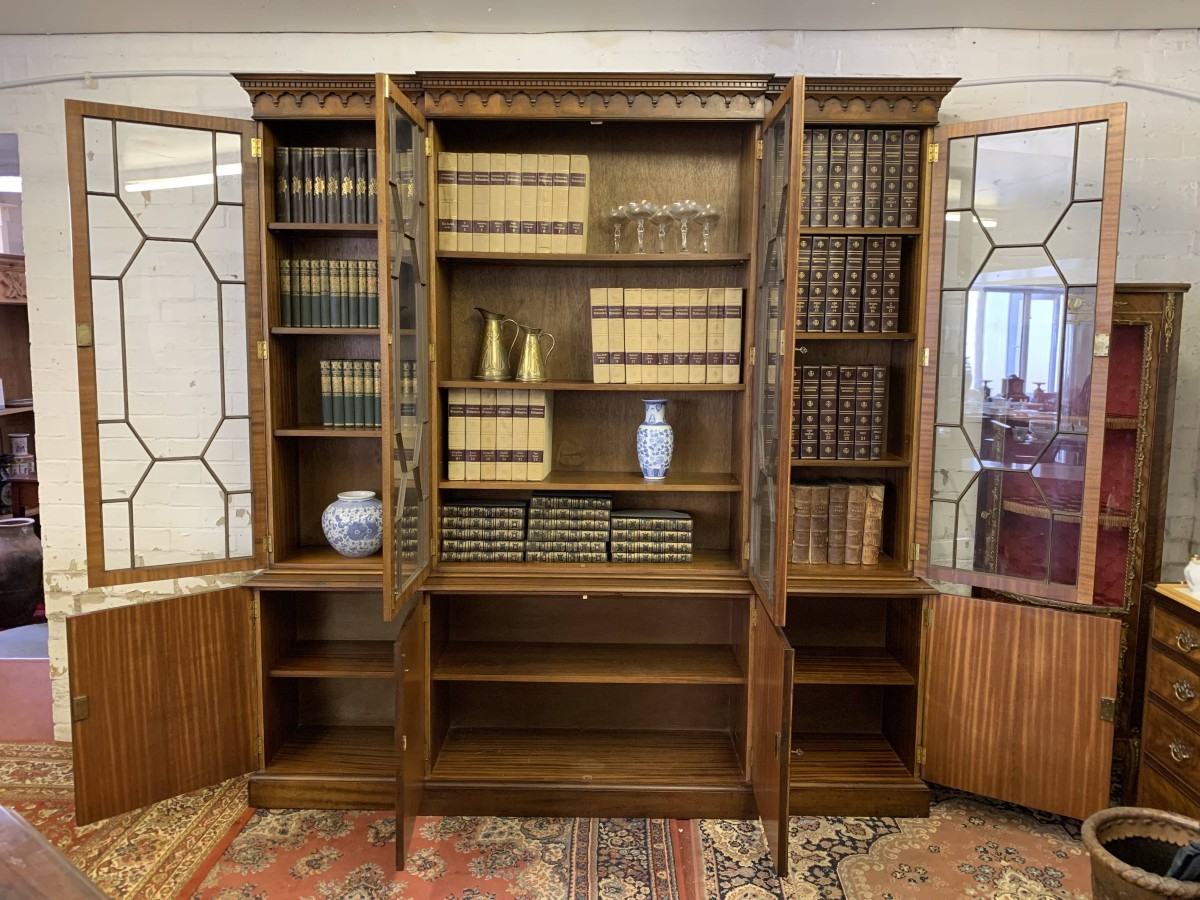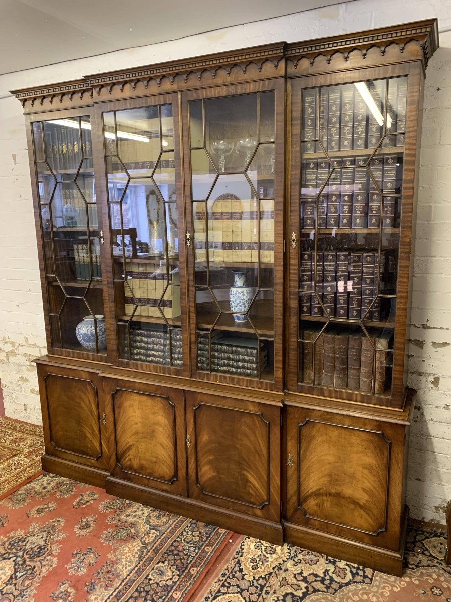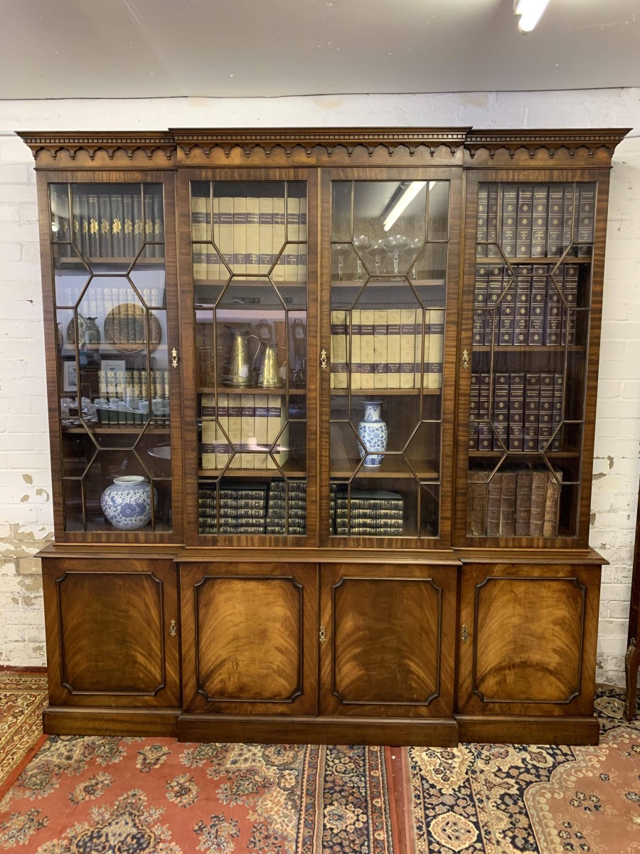 Quality large library bookcase made in striking mahogany which is in excellent condition. Dental cornice sits above four lockable glazed doors, the central pair of doors being brakefront. Each door has decorative wood barring. The doors open to reveal three adjustable and removable shelves. Below are four lockable cupboard doors, the central pair of doors being brakefront. Each door opens to reveal a removable shelf. This fabulous library bookcase produced by the renowned Bevan Funnell furniture manufacturer stands on a plinth base.