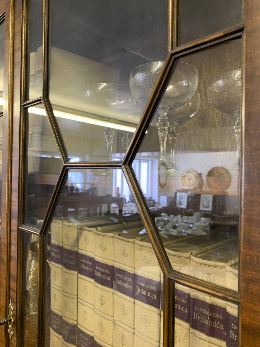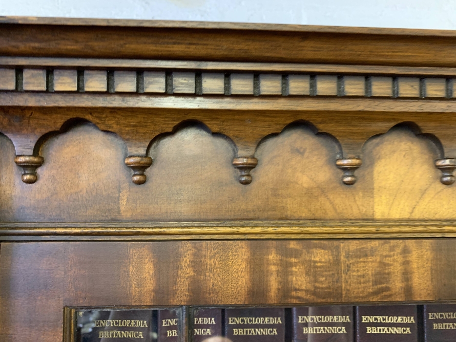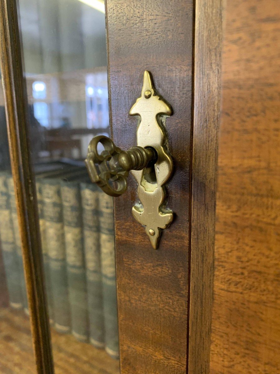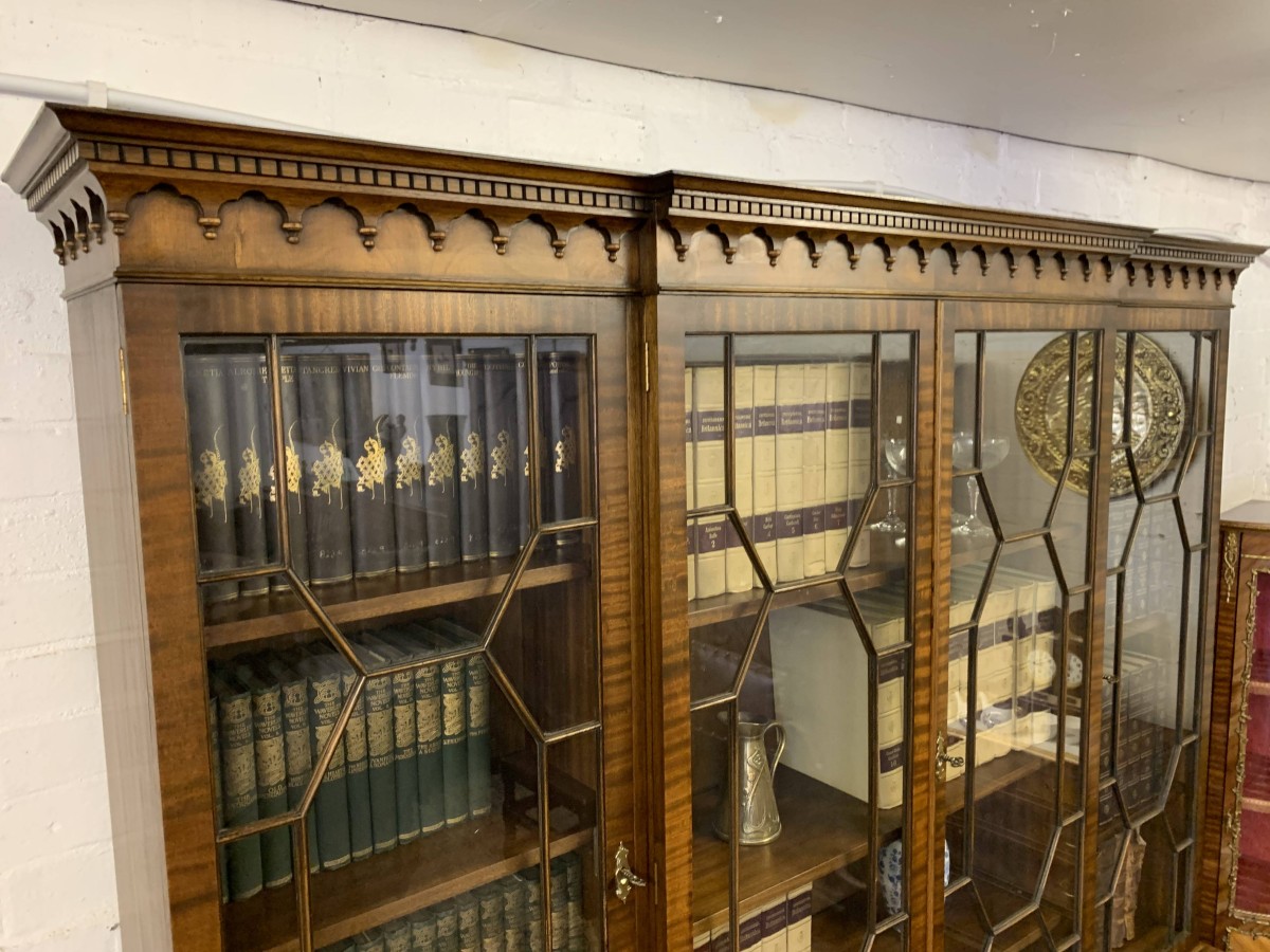 Quality large library bookcase made in striking mahogany which is in excellent condition. Dental cornice sits above four lockable glazed doors, the central pair of doors being brakefront. Each door has decorative wood barring. The doors open to reveal three adjustable and removable shelves. Below are four lockable cupboard doors, the central pair of doors being brakefront. Each door opens to reveal a removable shelf. This fabulous library bookcase produced by the renowned Bevan Funnell furniture manufacturer stands on a plinth base.