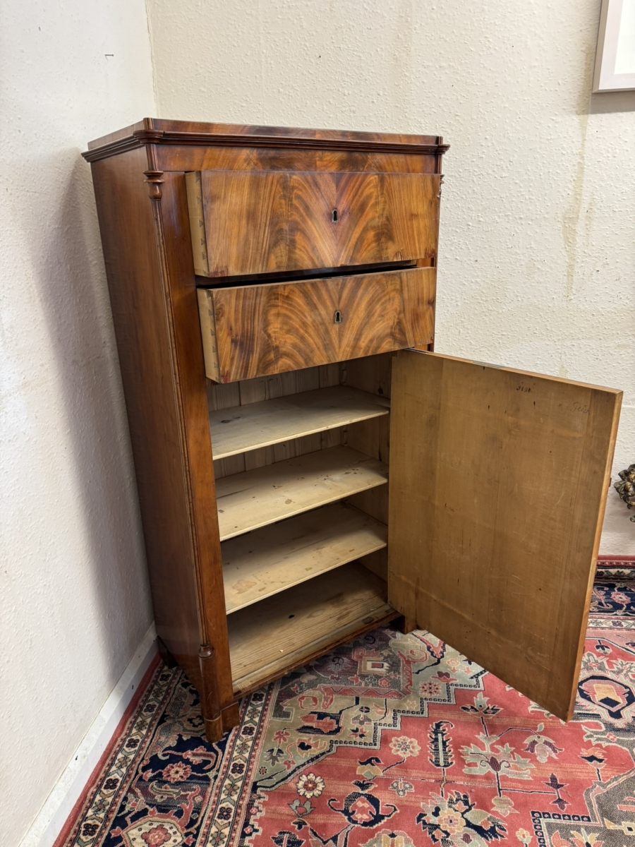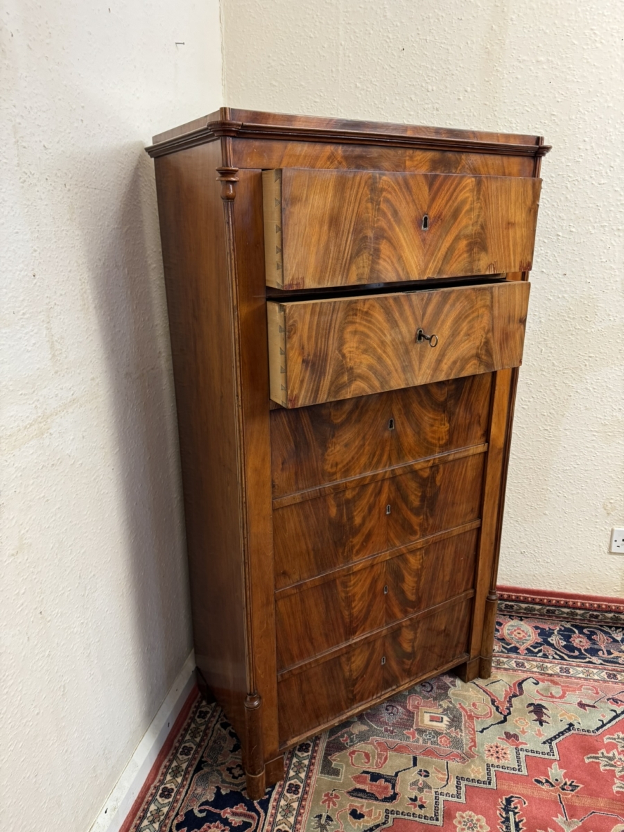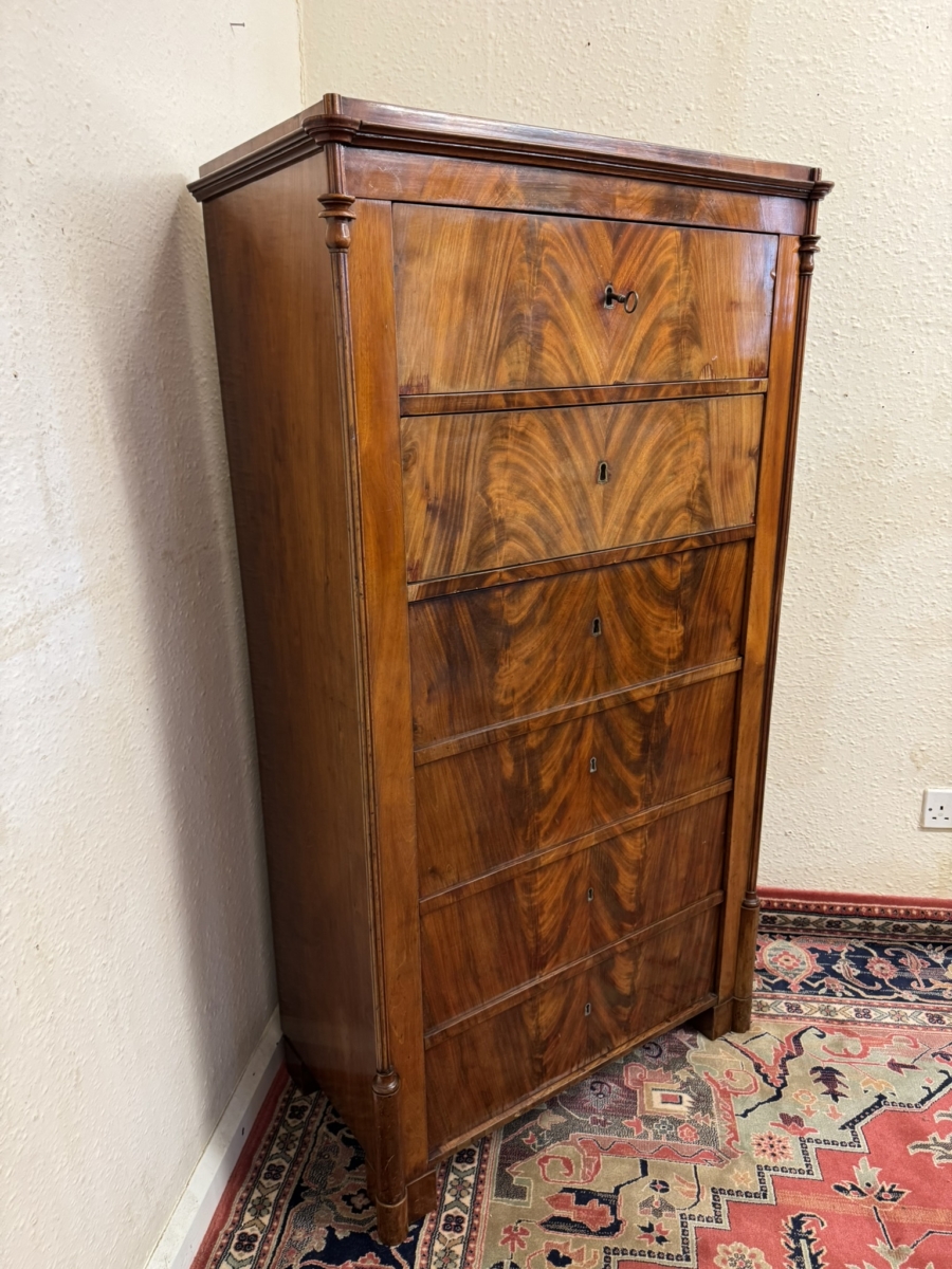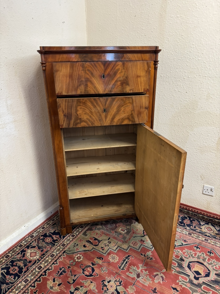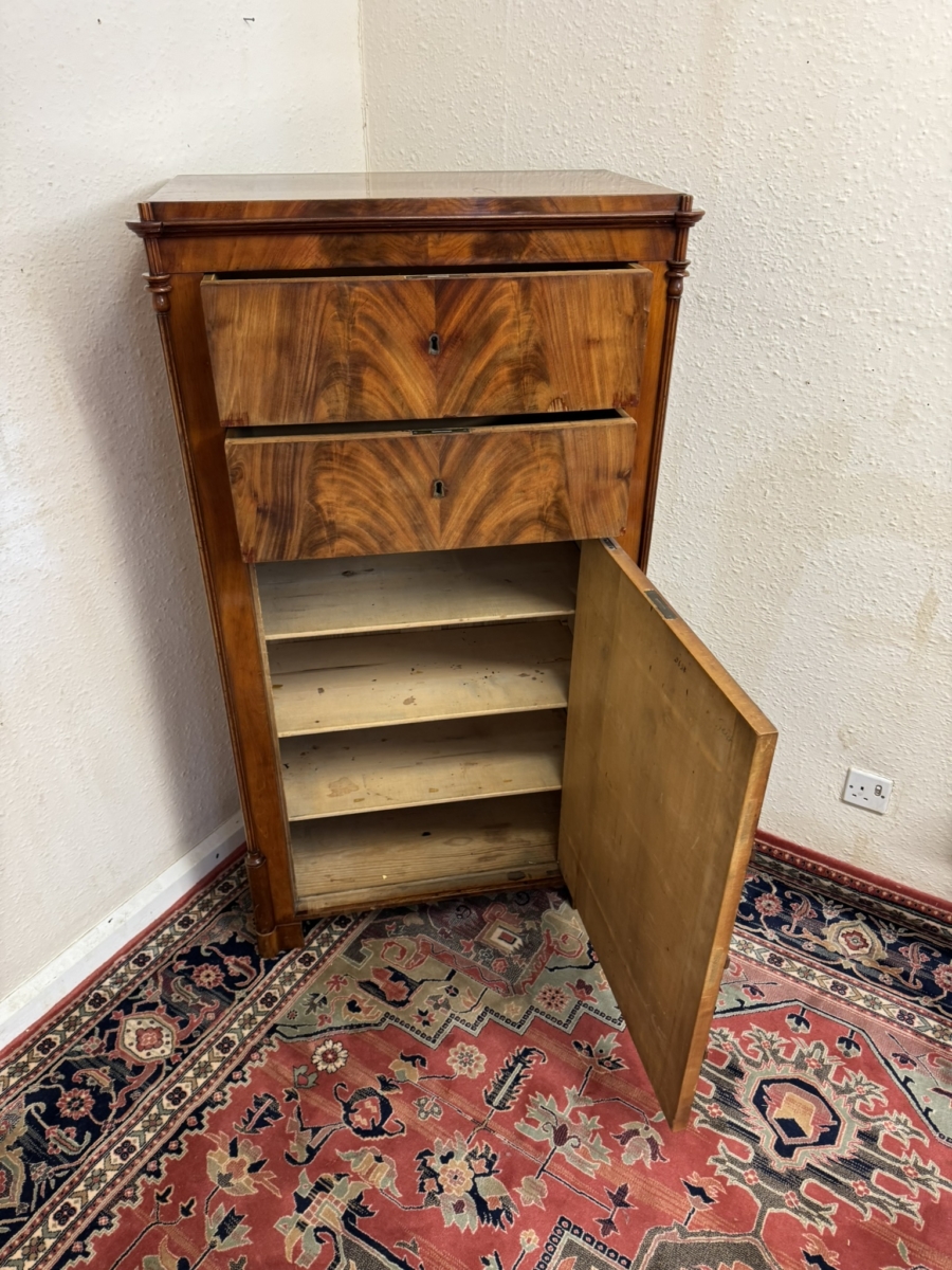 This super cabinet dates circa 1880. Two lockable top drawers sit above dummy drawers, the dummy drawer section is a lockable door, this door opens to reveal three removable shelves. Reeded columns to the sides and standing on traditional block feet.
